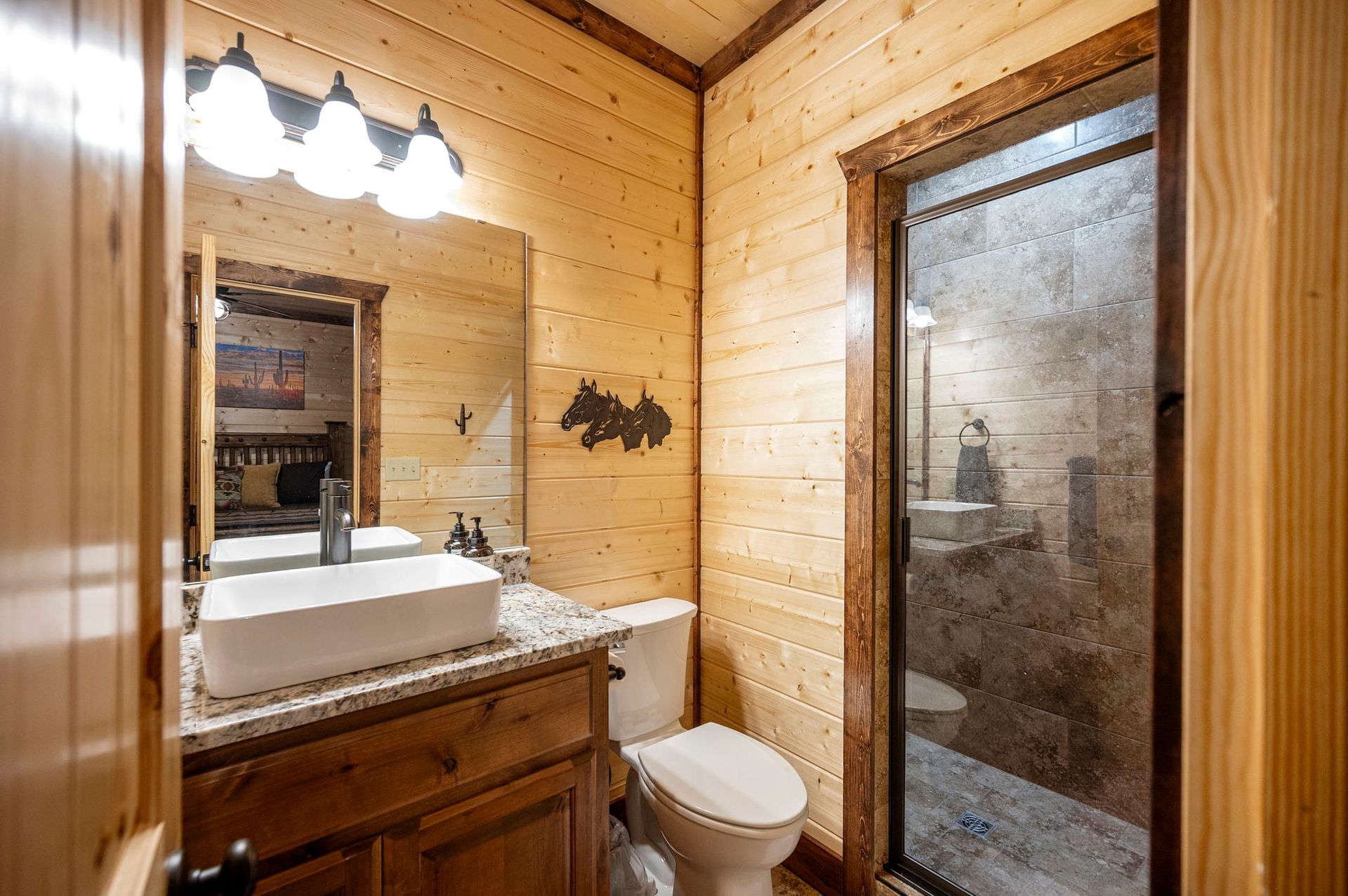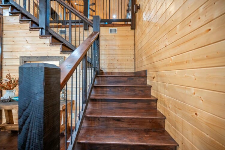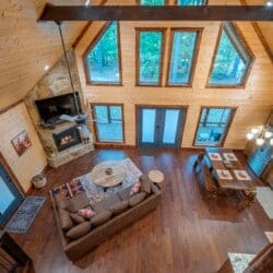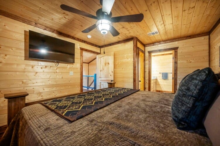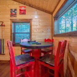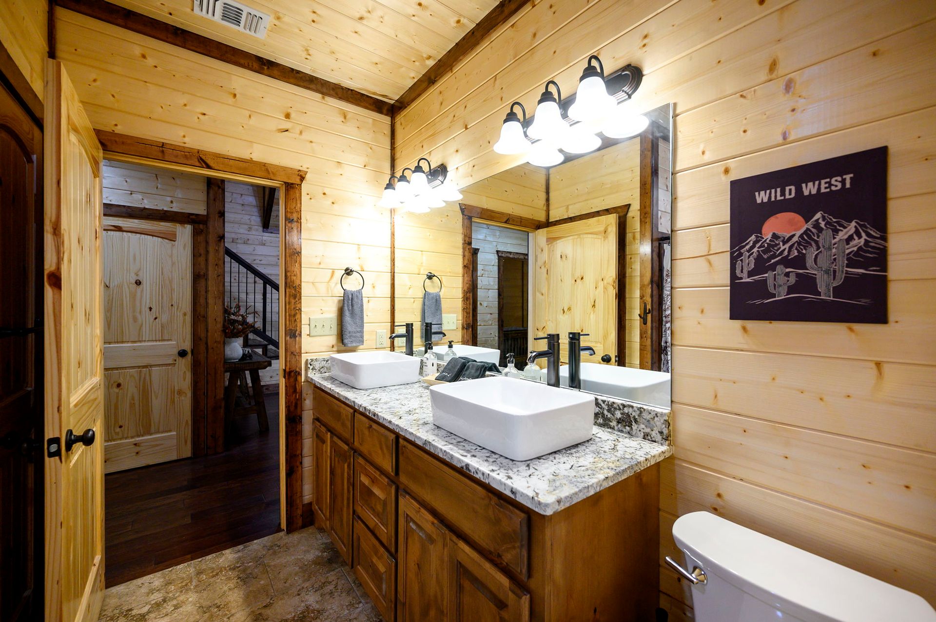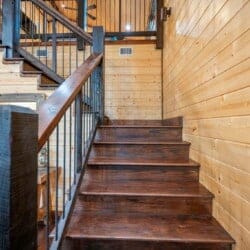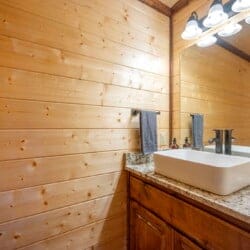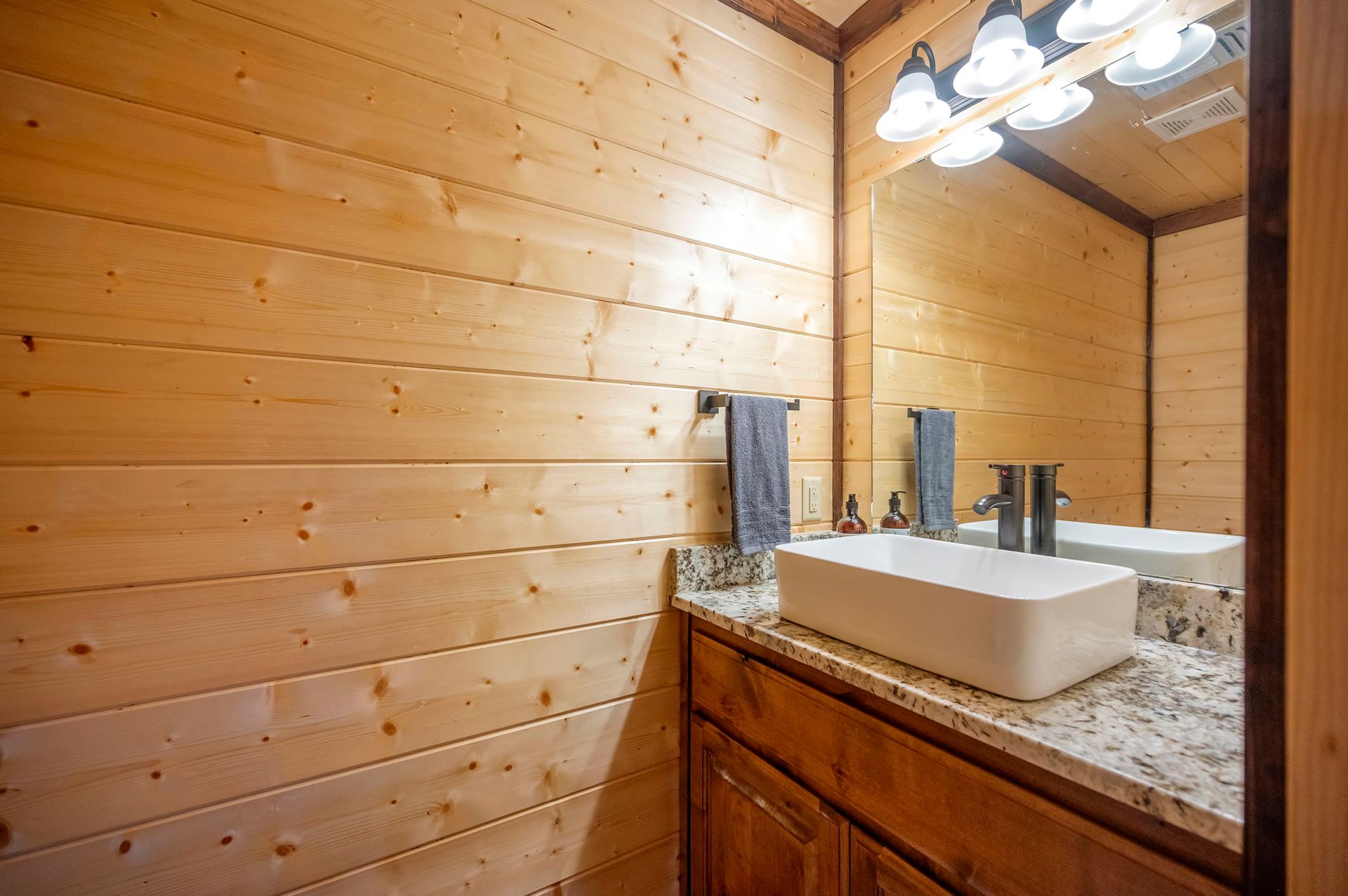 The loft area at Silverado adds a touch of fun and energy to the cabin’s laid-back atmosphere. With a pool table, bar-height seating, and a twin-over-twin bunk, it’s the perfect spot for friendly games or simply lounging with a drink in hand. The loft overlooks the main living area, keeping everyone connected while still offering space to spread out. Whether kids are competing over a game of pool or adults are relaxing with laughter echoing through the cabin, the loft turns downtime into delight.