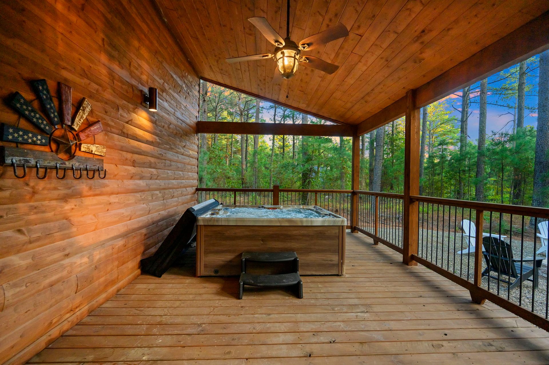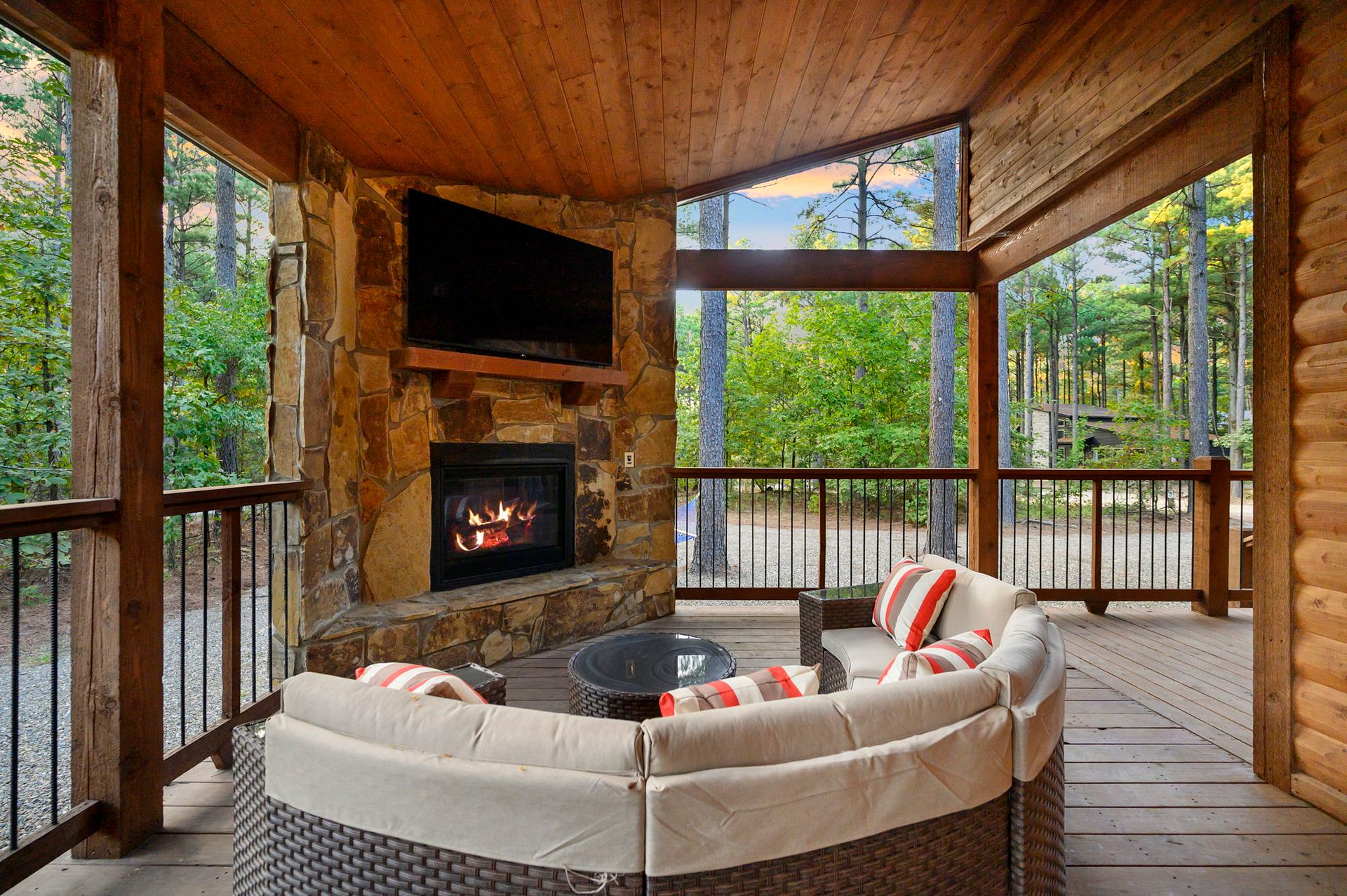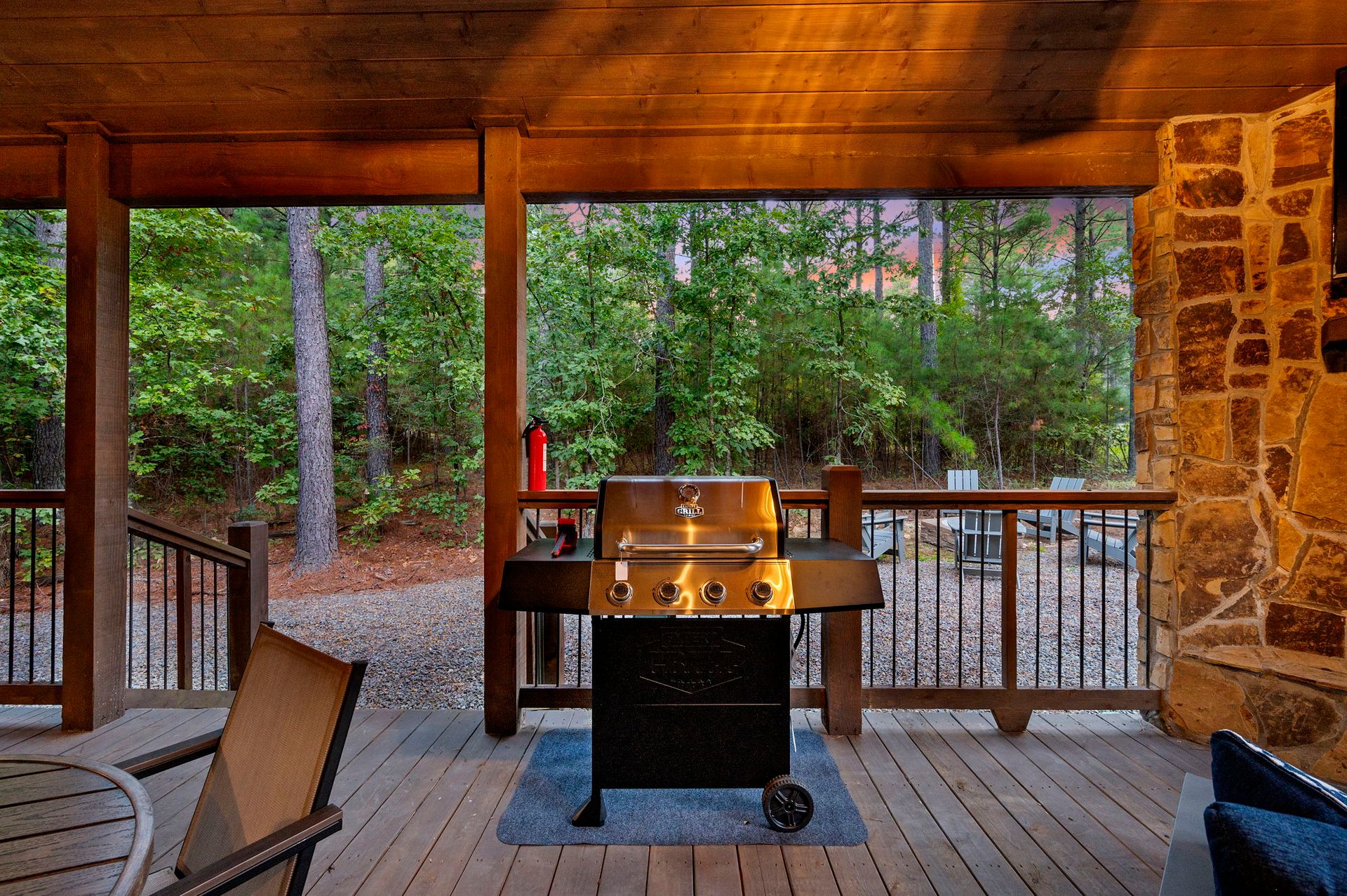 Step outside Silverado, and you’ll find that the outdoor amenities rival the interior in comfort and charm. A covered patio features a stone fireplace, a mounted TV, and plush seating — the perfect setting for watching a game or sharing a glass of wine by the firelight. The gas grill makes outdoor cooking easy under the Oklahoma sky, and the fire pit is perfect for roasting marshmallows under the stars. The hot tub, nestled among the trees, invites guests to soak and unwind while the night air hums with nature’s quiet song. Every inch of the outdoor space has been designed for relaxation, making it a highlight of any stay.