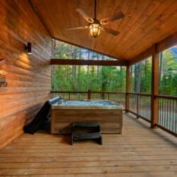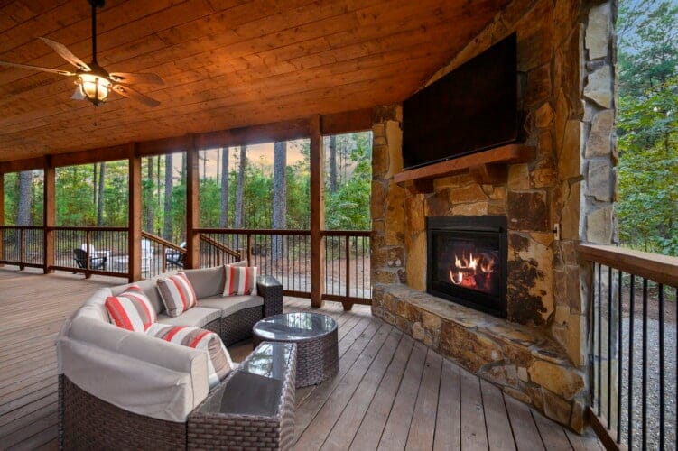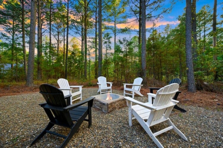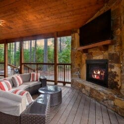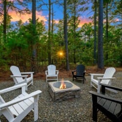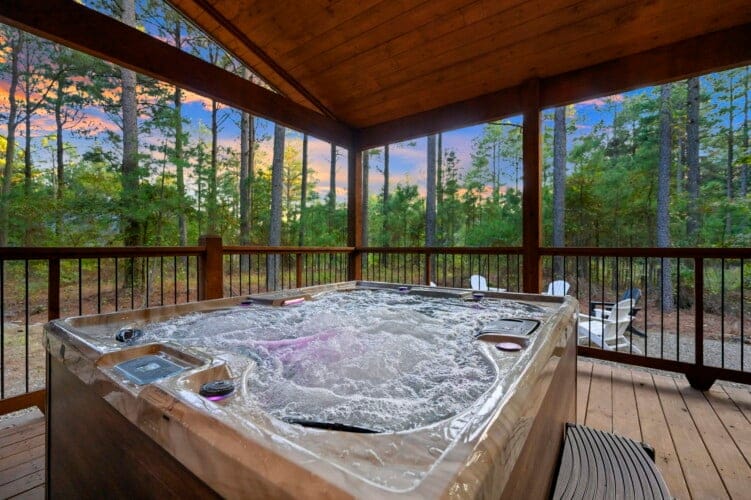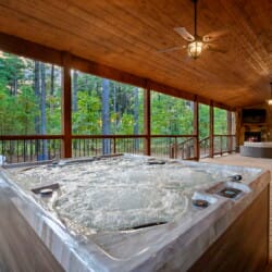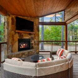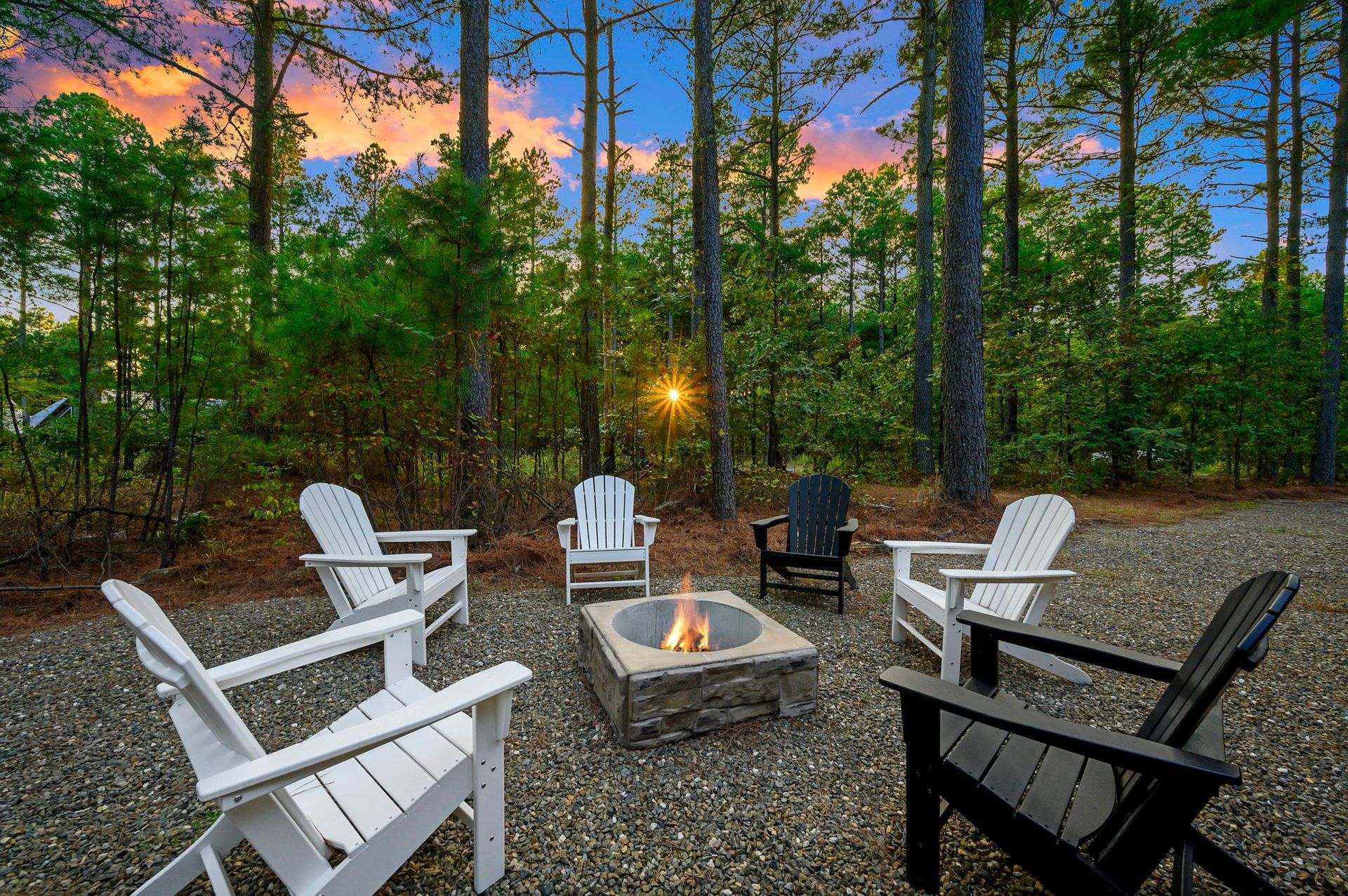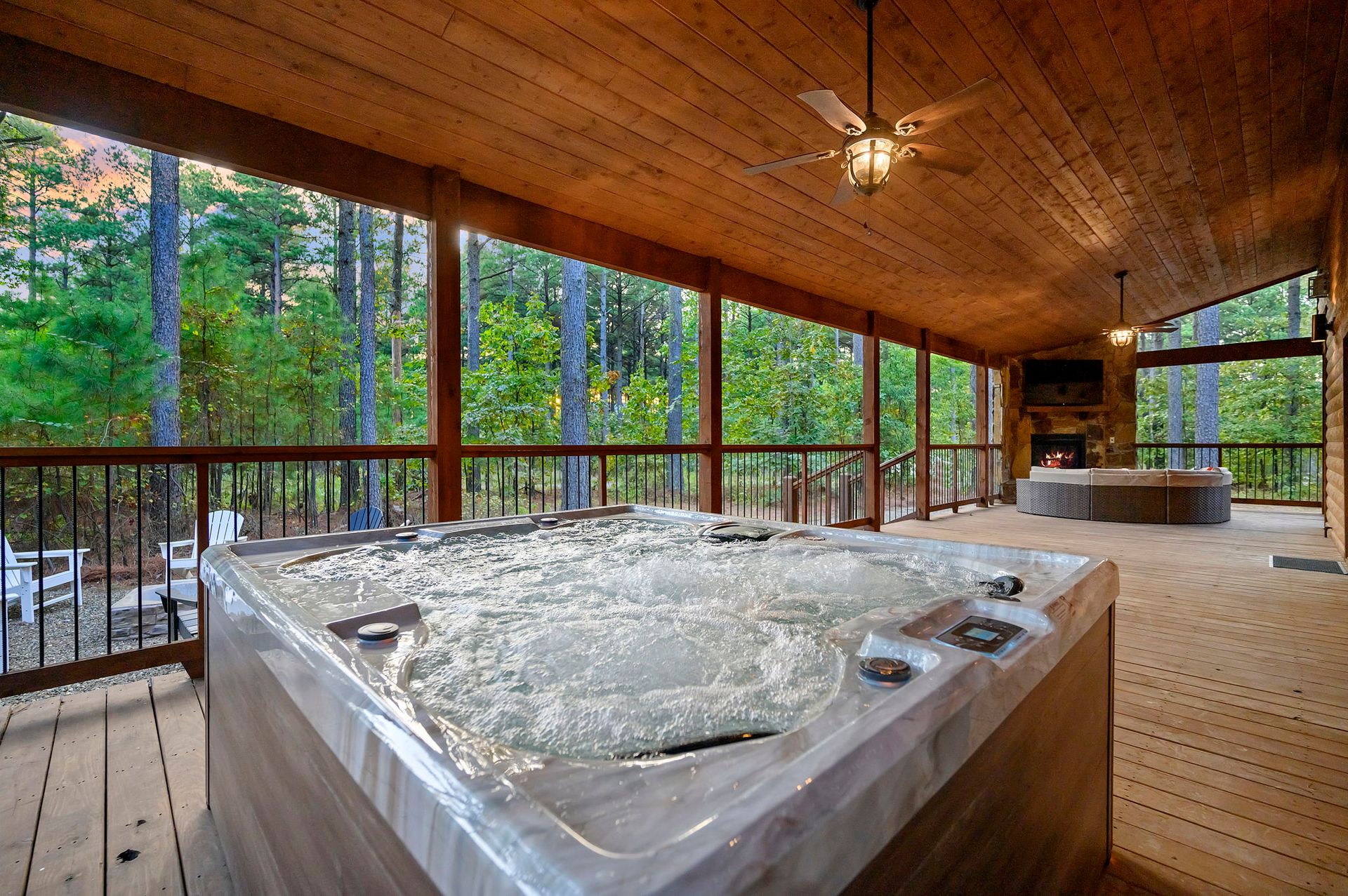 Step outside Silverado, and you’ll find that the outdoor amenities rival the interior in comfort and charm. A covered patio features a stone fireplace, a mounted TV, and plush seating — the perfect setting for watching a game or sharing a glass of wine by the firelight. The gas grill makes outdoor cooking easy under the Oklahoma sky, and the fire pit is perfect for roasting marshmallows under the stars. The hot tub, nestled among the trees, invites guests to soak and unwind while the night air hums with nature’s quiet song. Every inch of the outdoor space has been designed for relaxation, making it a highlight of any stay.