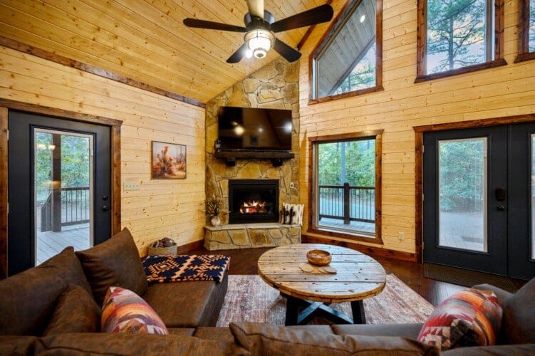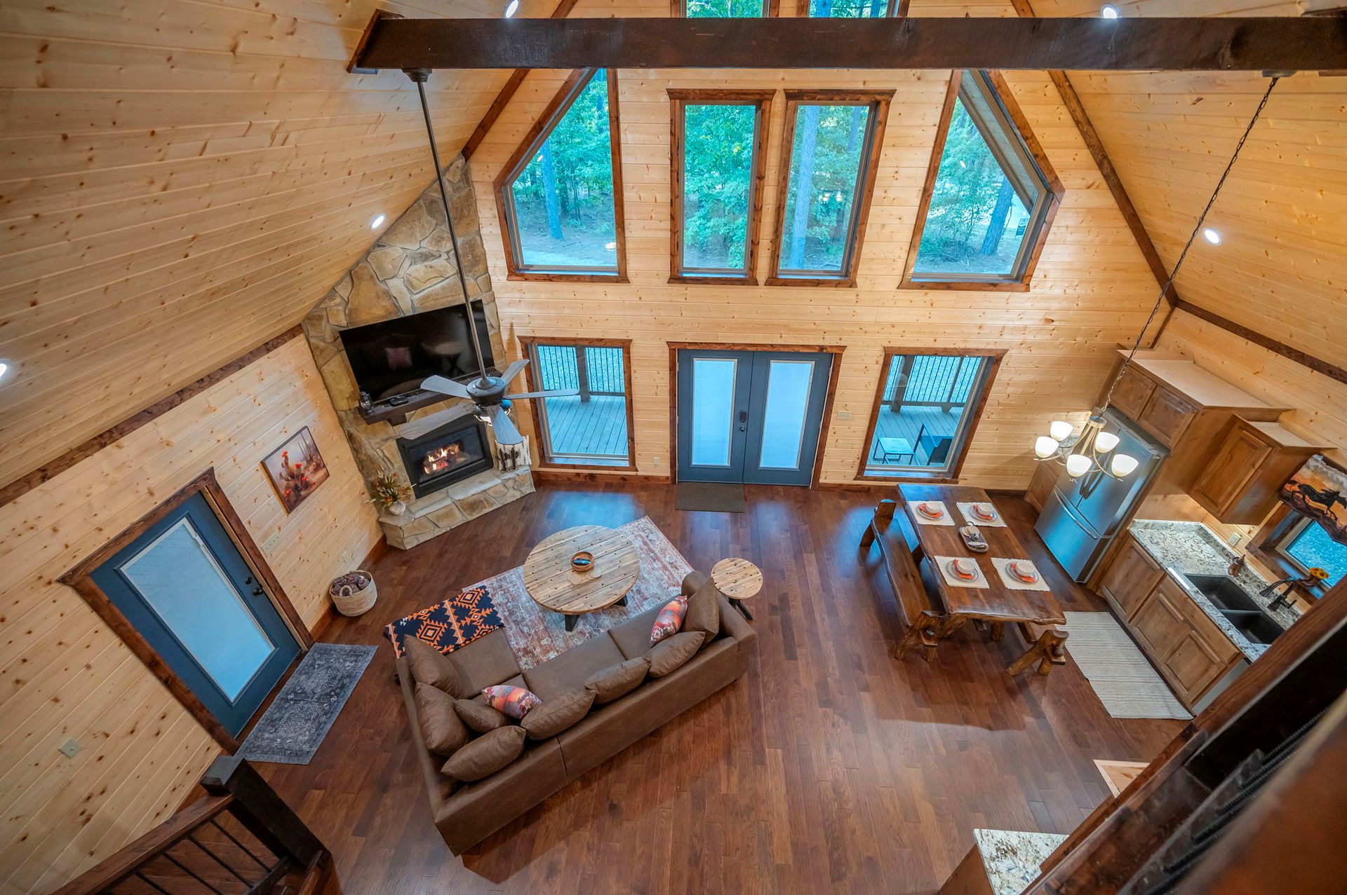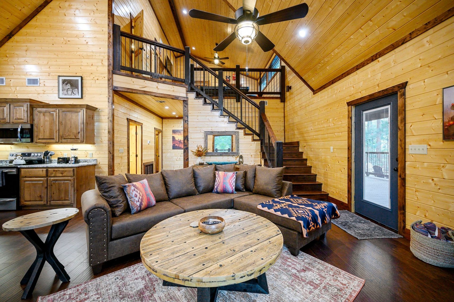 The open-concept living area inside Silverado sets the stage for connection and relaxation. A plush sectional sofa around a cozy gas fireplace makes the perfect spot to relax after a day at Broken Bow Lake or Beavers Bend State Park. The soft glow of the fire dances across the rustic wood beams and Western accents, creating an inviting atmosphere that feels like home but elevated. A large HDTV provides endless entertainment for movie nights or sports games, while the room’s tall windows bring in natural light and breathtaking forest views. Whether you’re wrapped in a blanket watching the flames or gathered around for a late-night chat, every moment spent here becomes a memory worth holding onto.