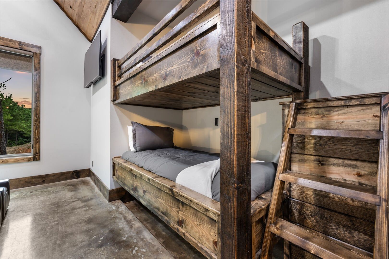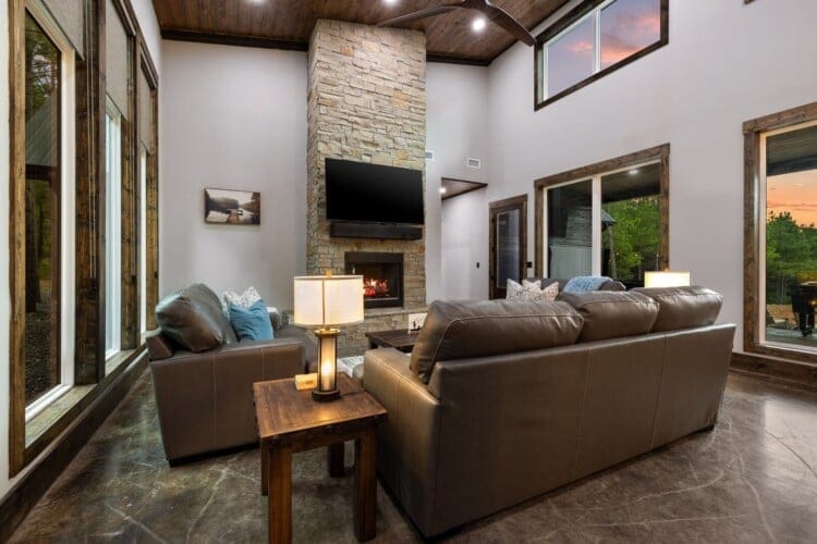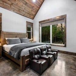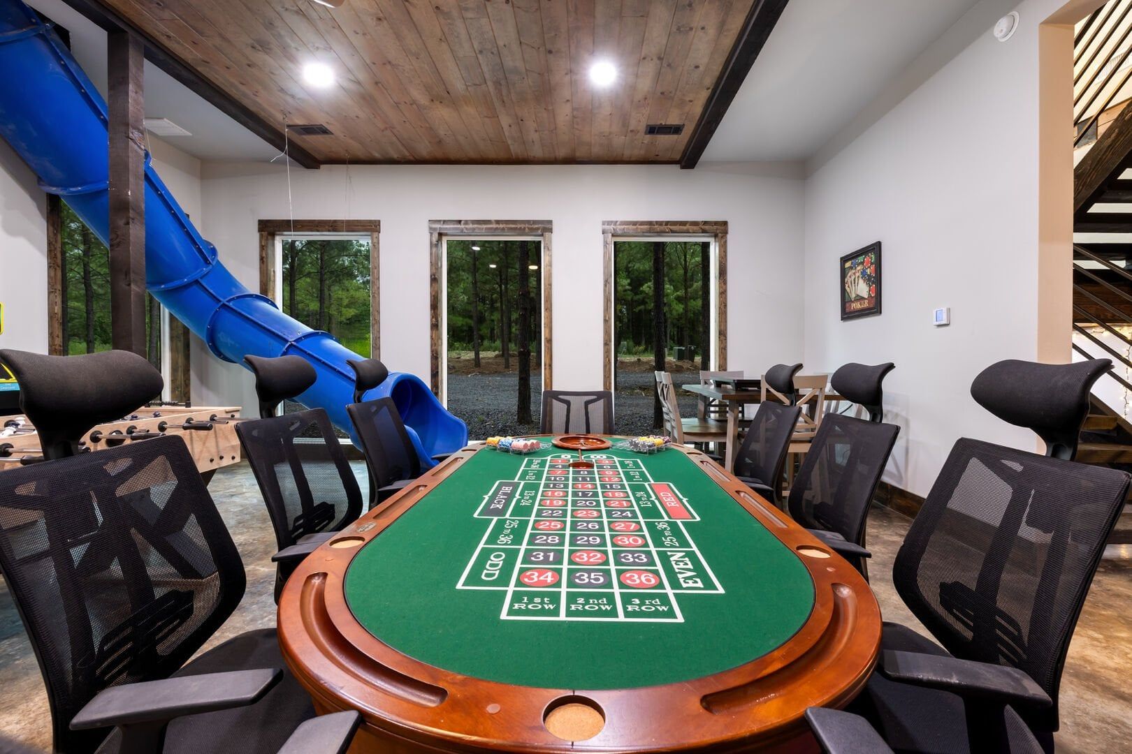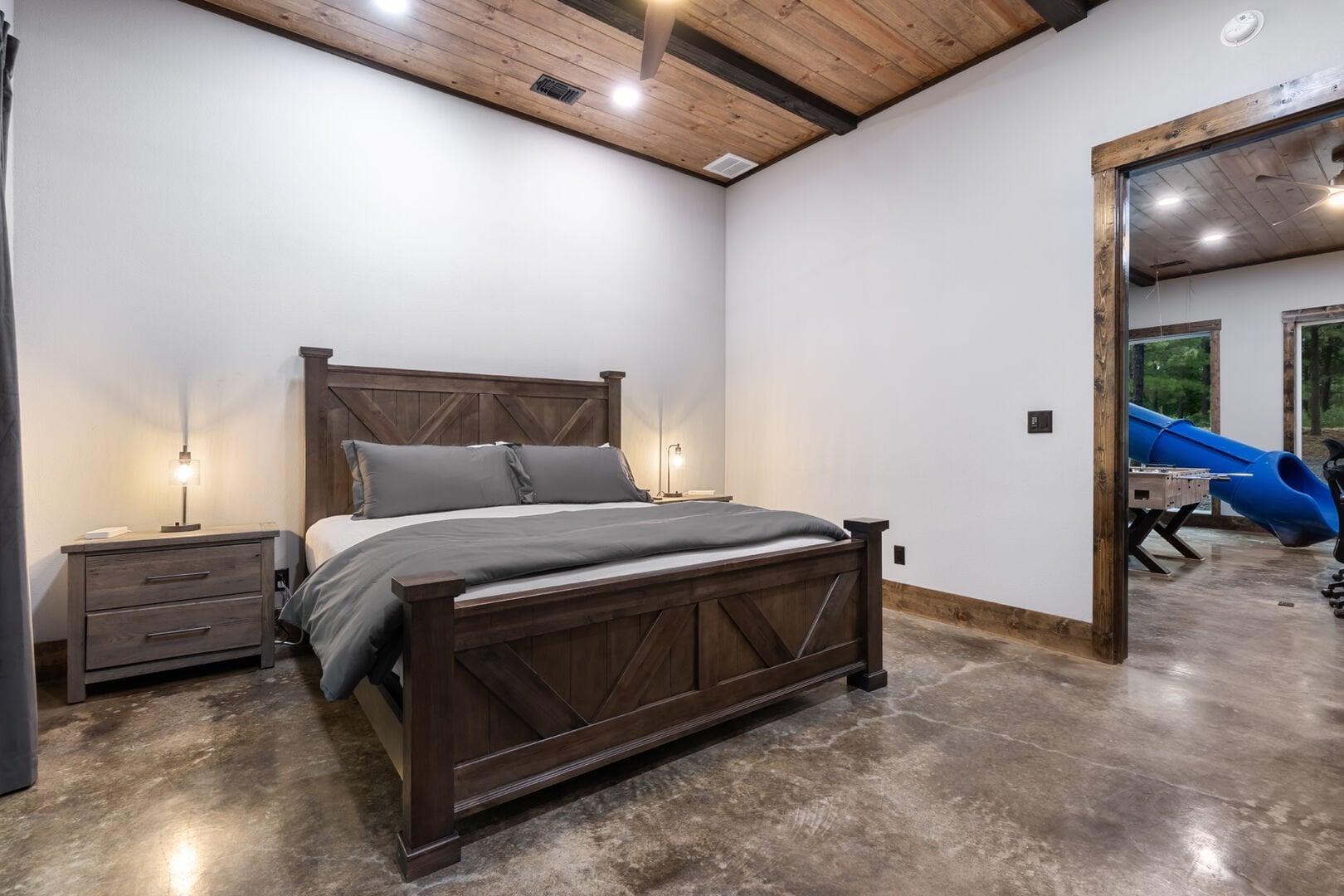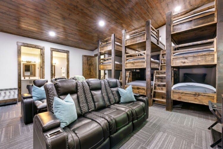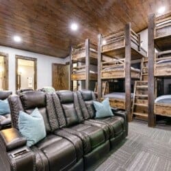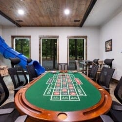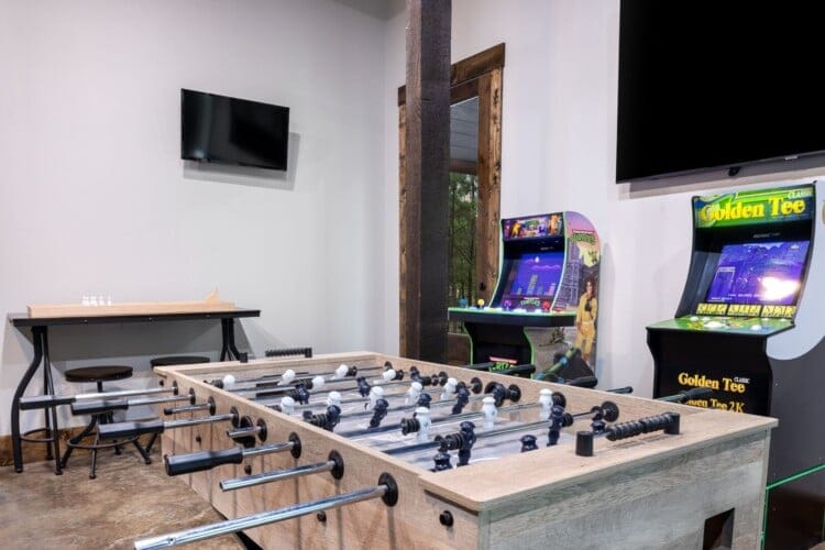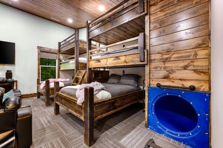 Luxury cabin with indoor slide, hot tub, arcade, fire pits, 5 king suites, and huge bunk room