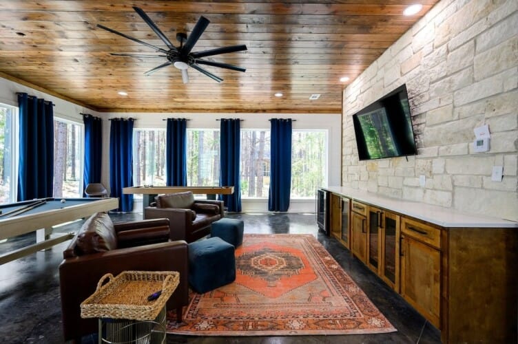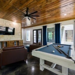 Inside the main house, the living area creates a warm and welcoming environment. Two entertainment sections feature soft leather couches, plenty of chairs, and ottomans. A large Smart TV and gas fireplace bring comfort on chilly nights, while the open-concept layout encourages group gatherings. The game room has fun activities, including a pool table, shuffleboard, arcade games, and a second Smart TV. This room also includes two leather chairs, ottomans, a beverage fridge, and a half bath, making it the perfect hangout zone.