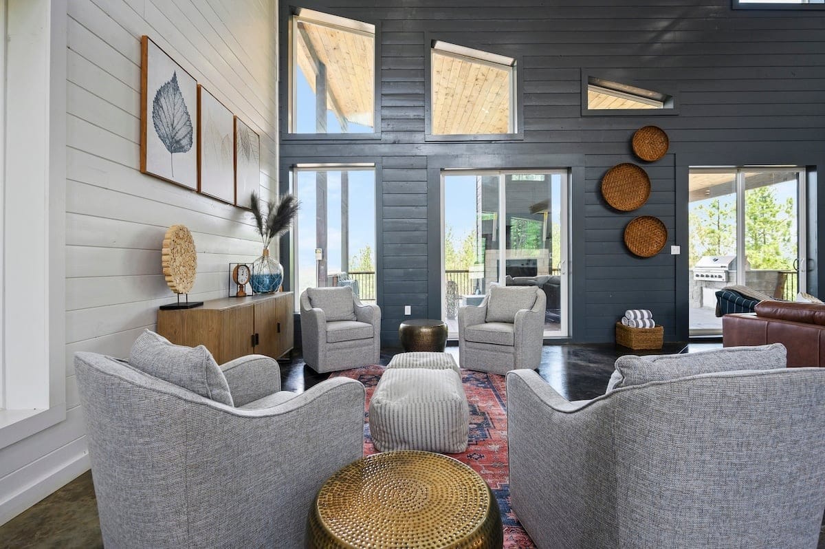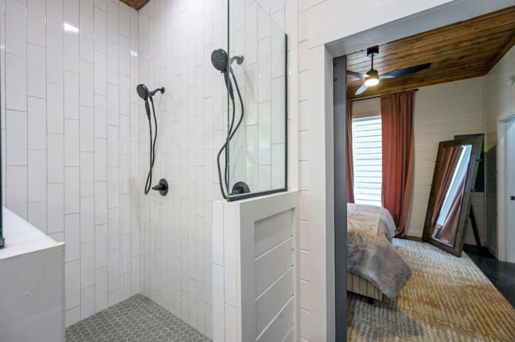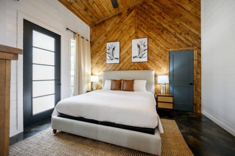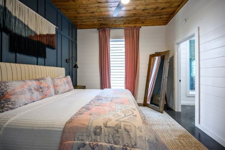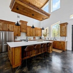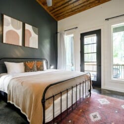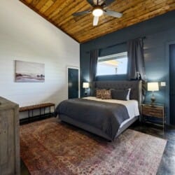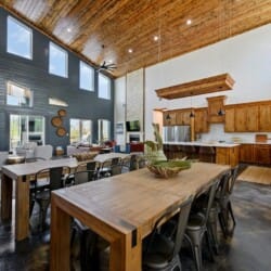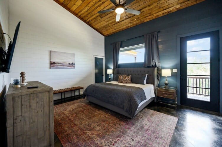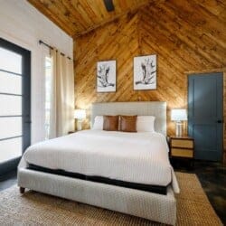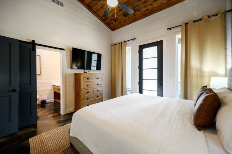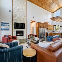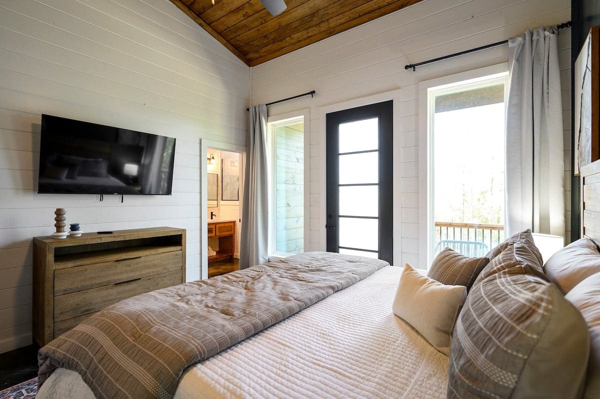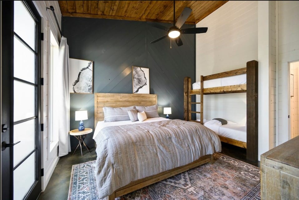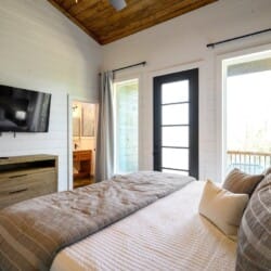 With five king bedrooms on the main floor and a massive upstairs bunk room, this home’s layout supports multiple families traveling together. Two king bedrooms include twin bunk beds, making them ideal for parents who want to sleep close to their children. Each bedroom has its ensuite bathroom and a private balcony with seating, allowing guests to wake up to peaceful views and fresh air. The master bedroom has a soaking tub, a walk-in shower, and double shower heads.