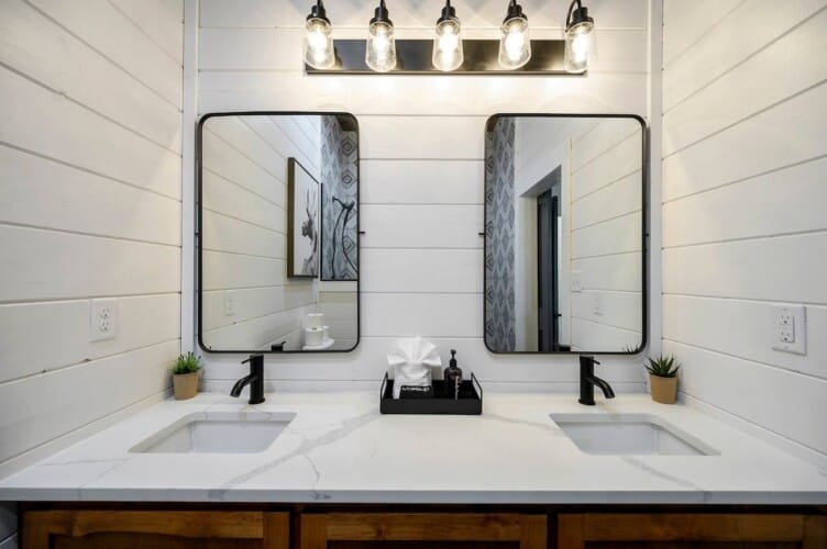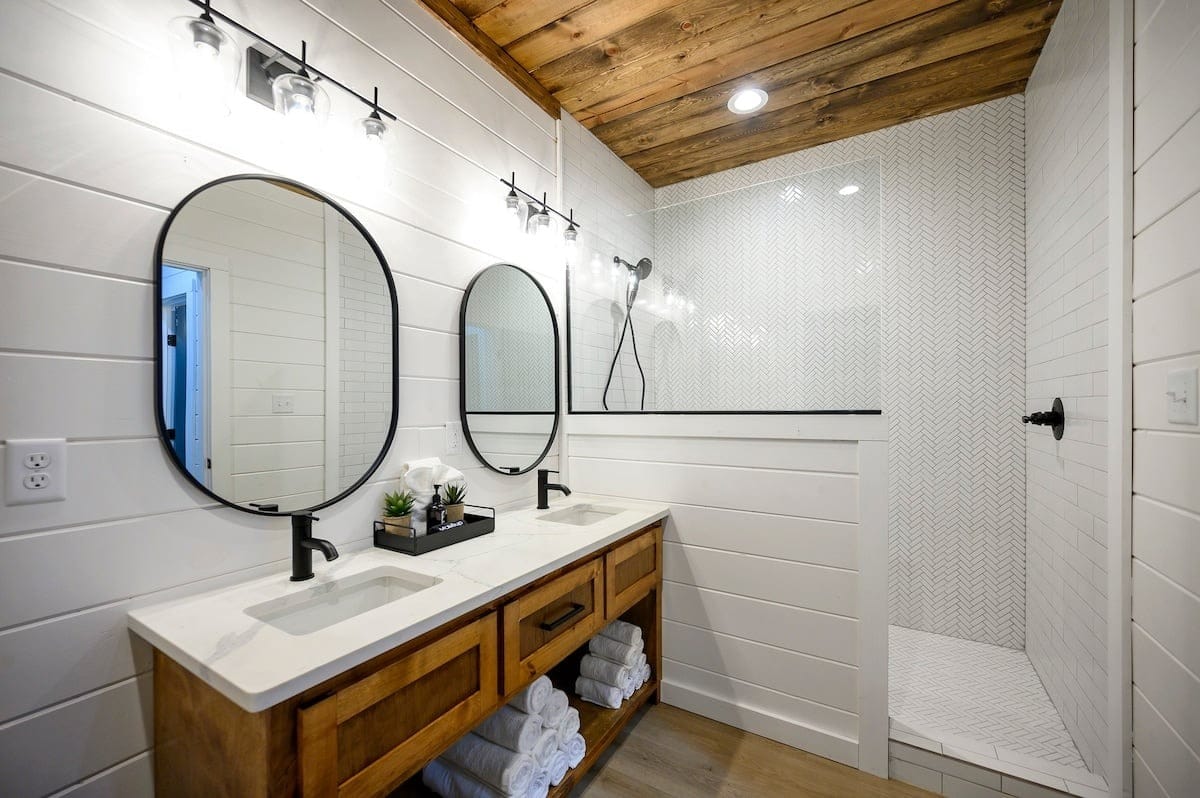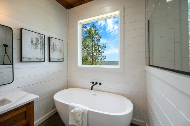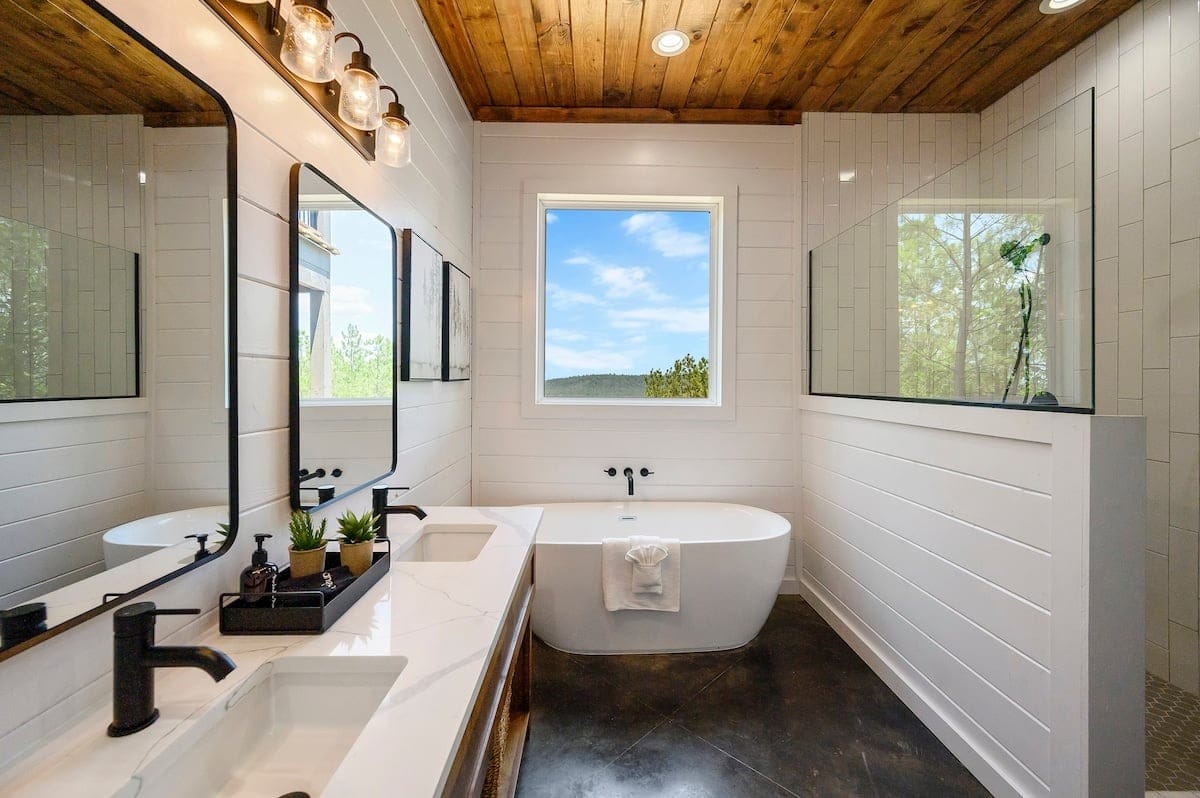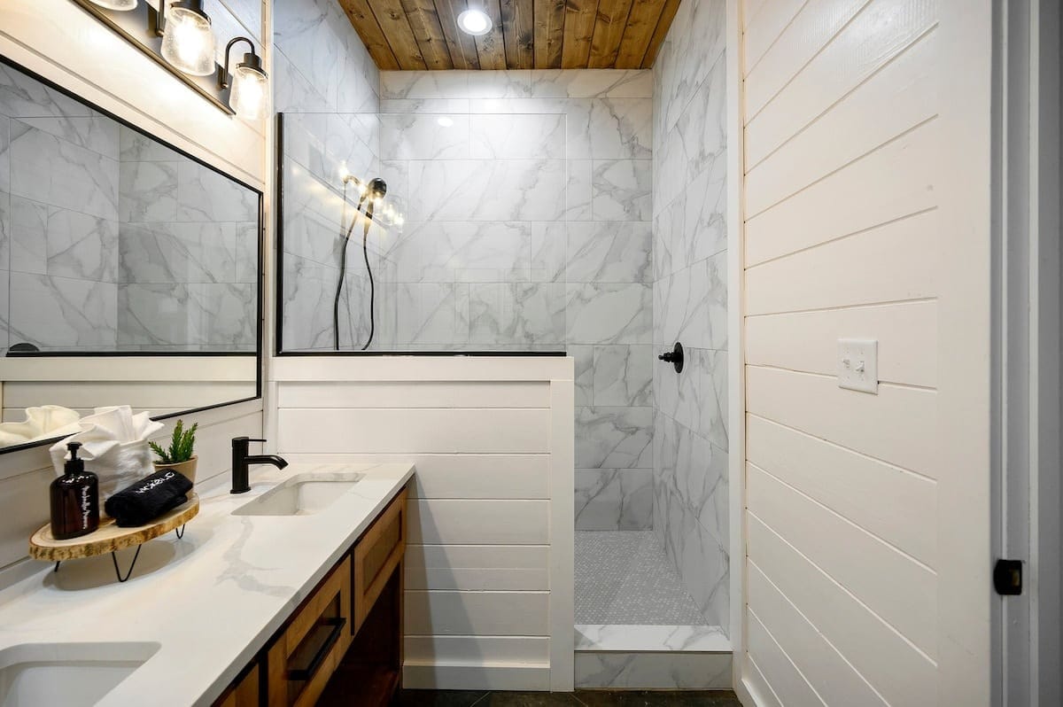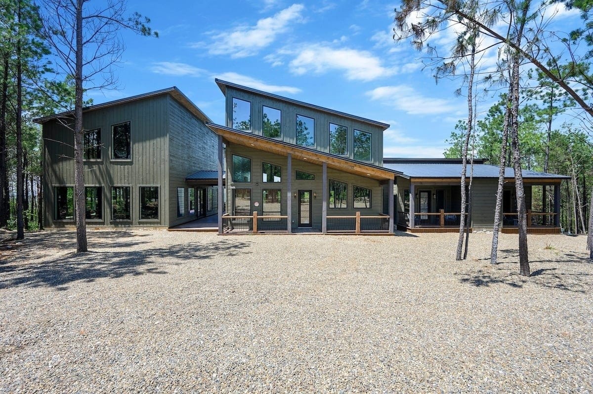 With five king bedrooms on the main floor and a massive upstairs bunk room, this home’s layout supports multiple families traveling together. Two king bedrooms include twin bunk beds, making them ideal for parents who want to sleep close to their children. Each bedroom has its ensuite bathroom and a private balcony with seating, allowing guests to wake up to peaceful views and fresh air. The master bedroom has a soaking tub, a walk-in shower, and double shower heads.