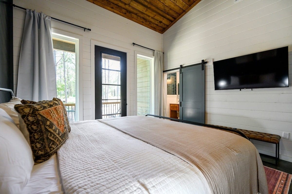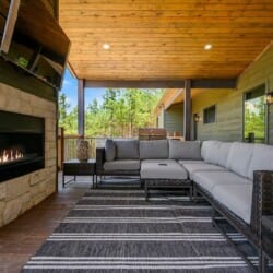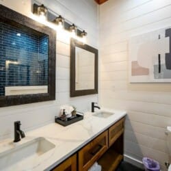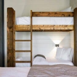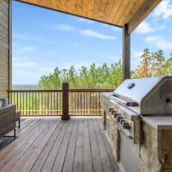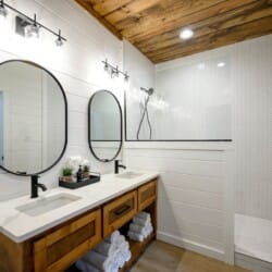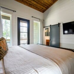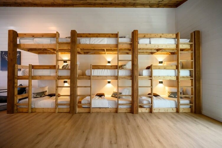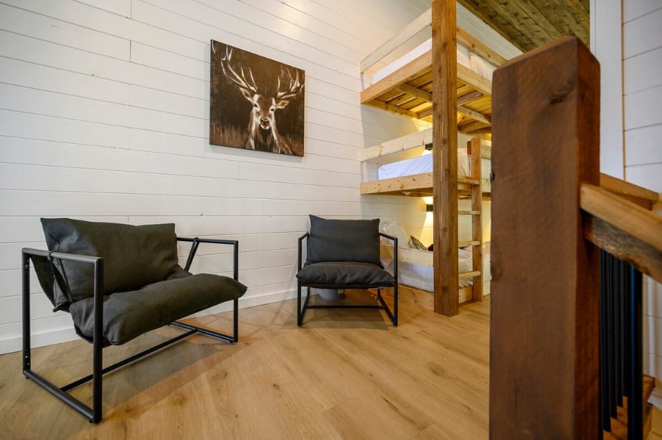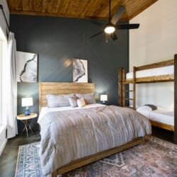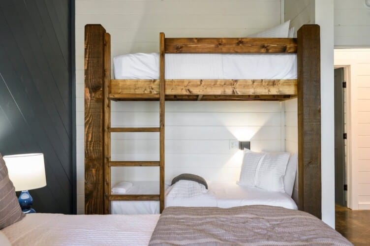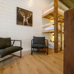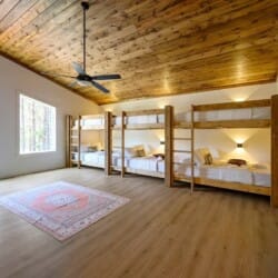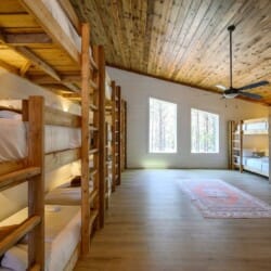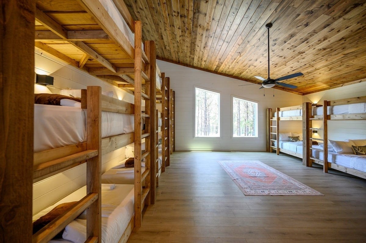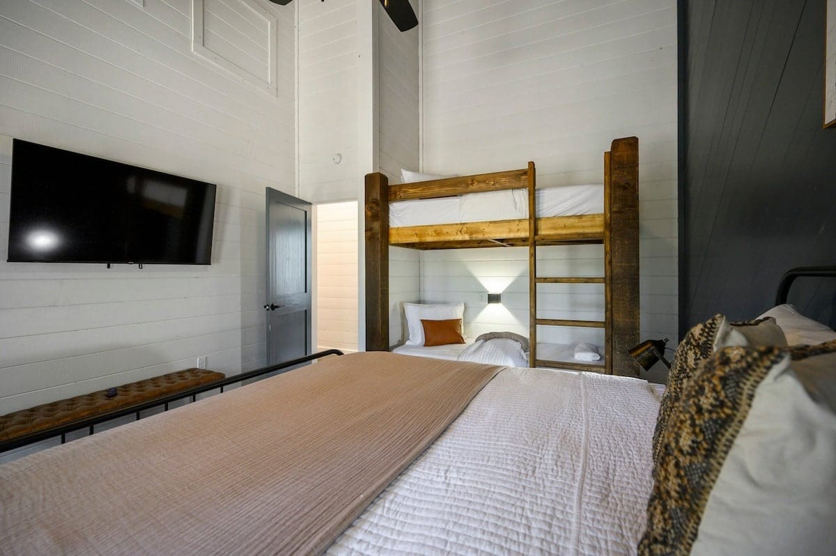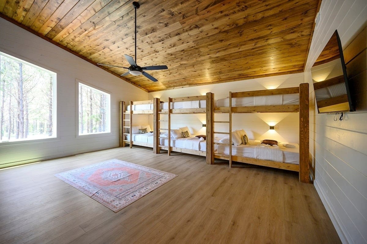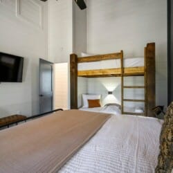 Across the breezeway, the upstairs bunk room is perfect for kids, teens, or big groups of friends. It features three sets of double-stacked queen bunk beds and three sets of triple-stacked twin bunk beds. With two full ensuite bathrooms and a large private balcony, the bunk room feels like a little lodge within the cabin.