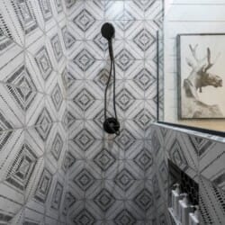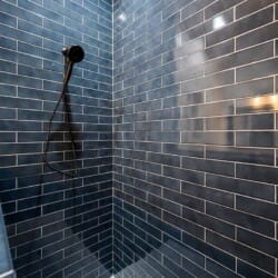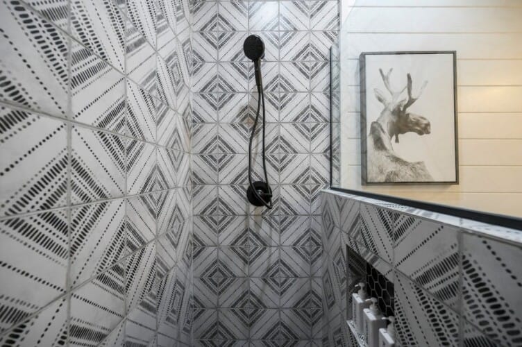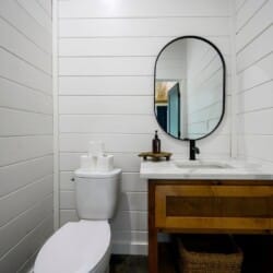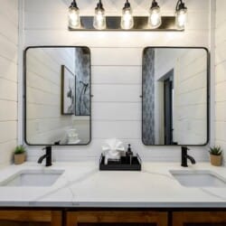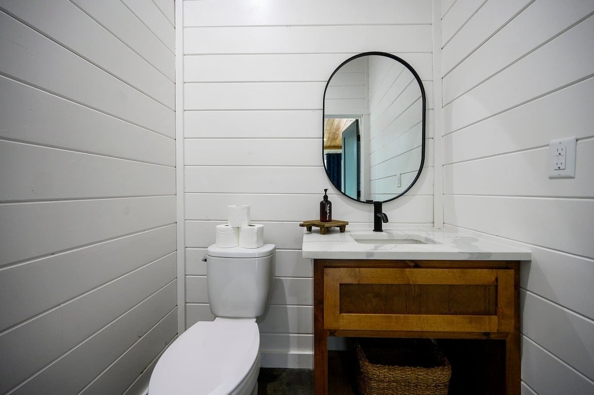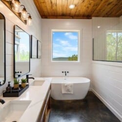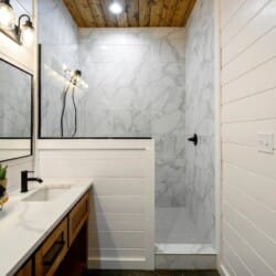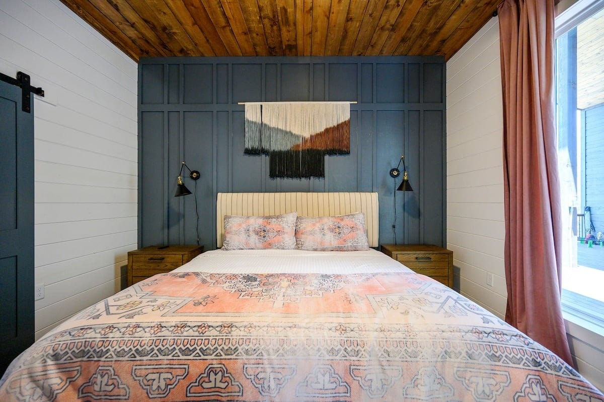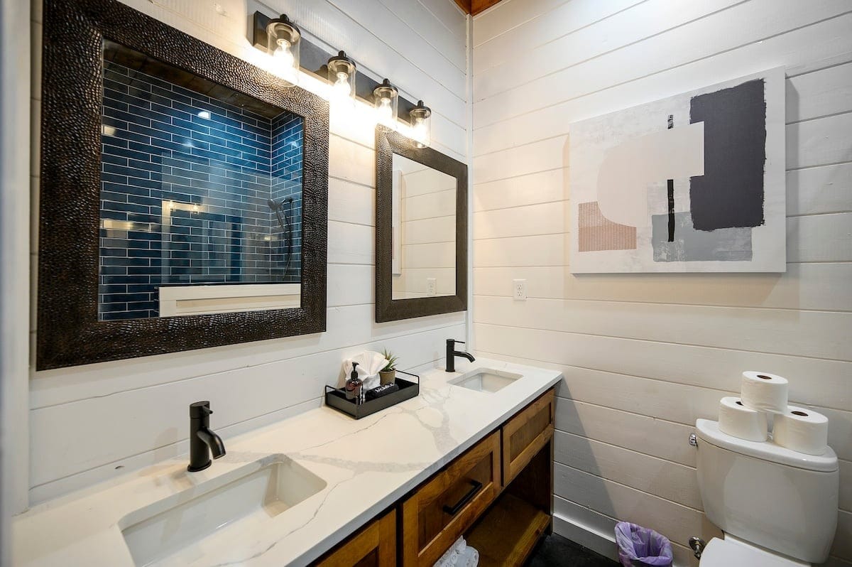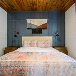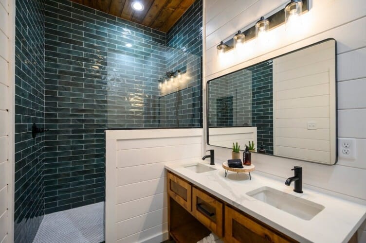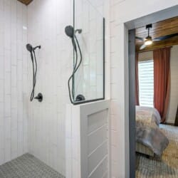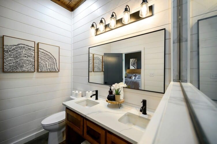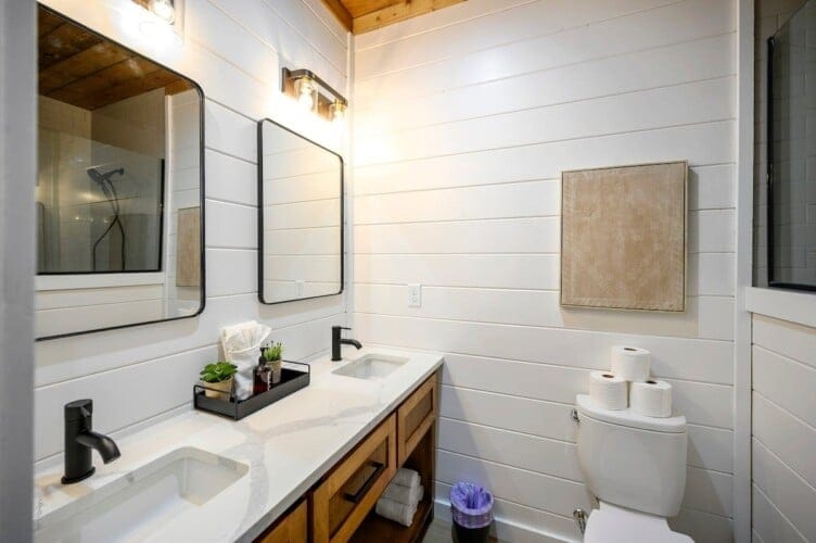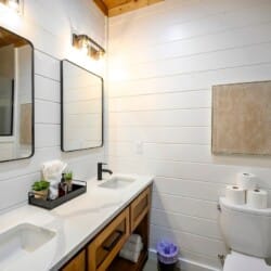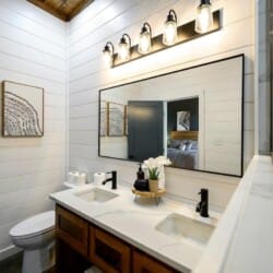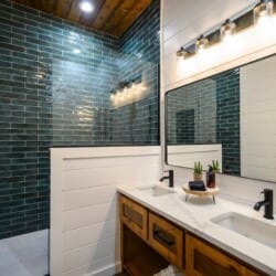 Across the breezeway, the upstairs bunk room is perfect for kids, teens, or big groups of friends. It features three sets of double-stacked queen bunk beds and three sets of triple-stacked twin bunk beds. With two full ensuite bathrooms and a large private balcony, the bunk room feels like a little lodge within the cabin.