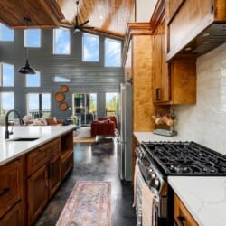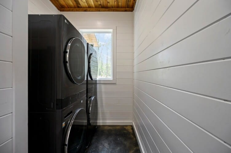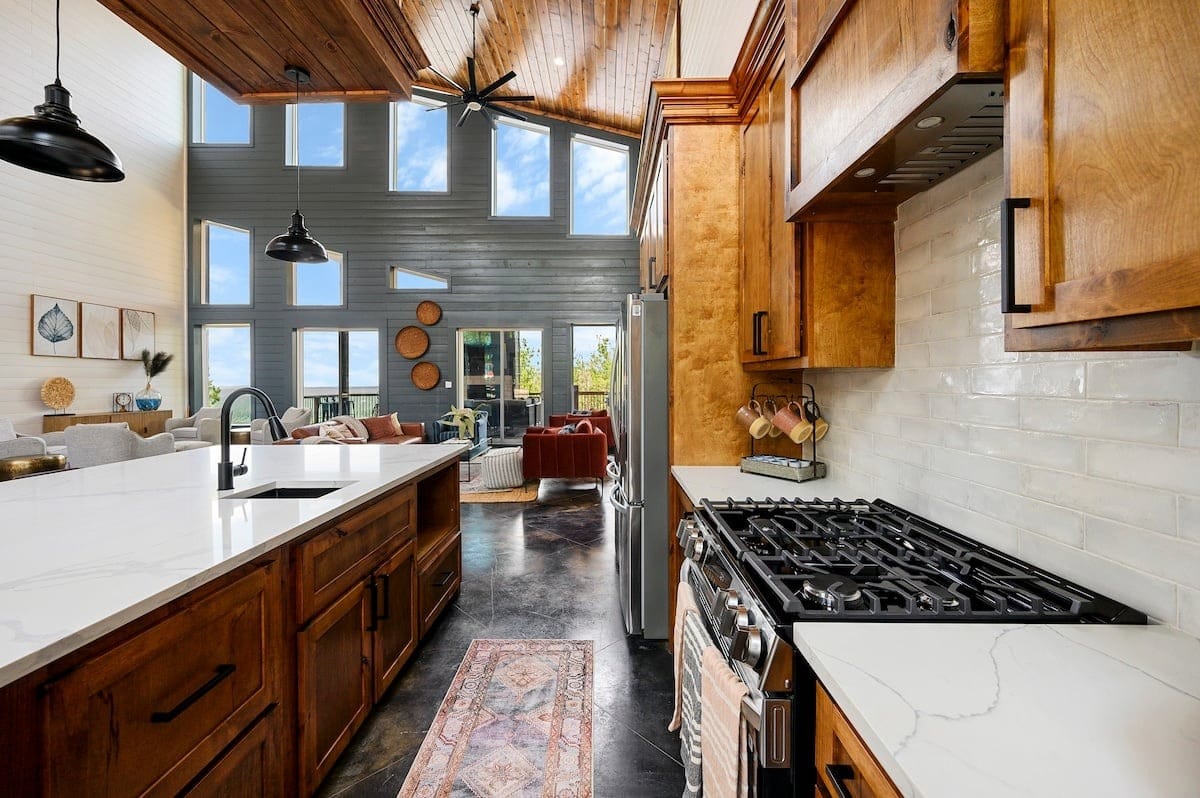 The kitchen comes stocked and ready for big meals. It includes two dining tables with sixteen people and extra bar seating for four. Modern appliances like a gas stovetop, oven, refrigerator, Keurig coffee maker, toaster, crockpot, and blender ensure guests can easily prepare and enjoy meals. Cookware, dishes, silverware, and glassware are all provided.