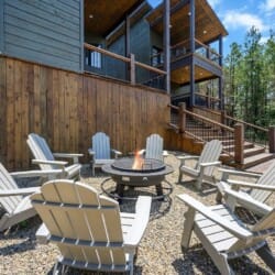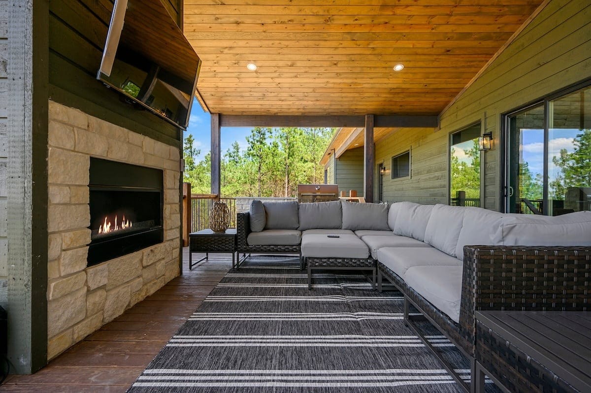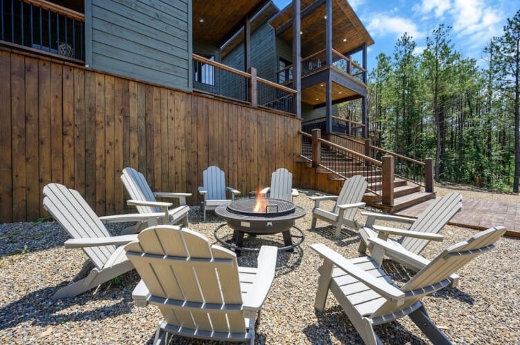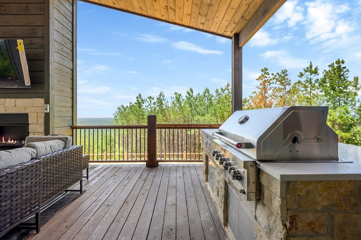 Outside, guests can soak in the views while swimming in the private fenced pool. Comfortable poolside loungers are placed to catch the sun or relax in the shade. The outdoor hot tub offers another way to unwind, while the gas fireplace and Smart TV allow entertaining even in cooler weather. A gas grill stands ready for cookouts, and a fire pit with Adirondack chairs creates the perfect spot for s’mores under the stars.