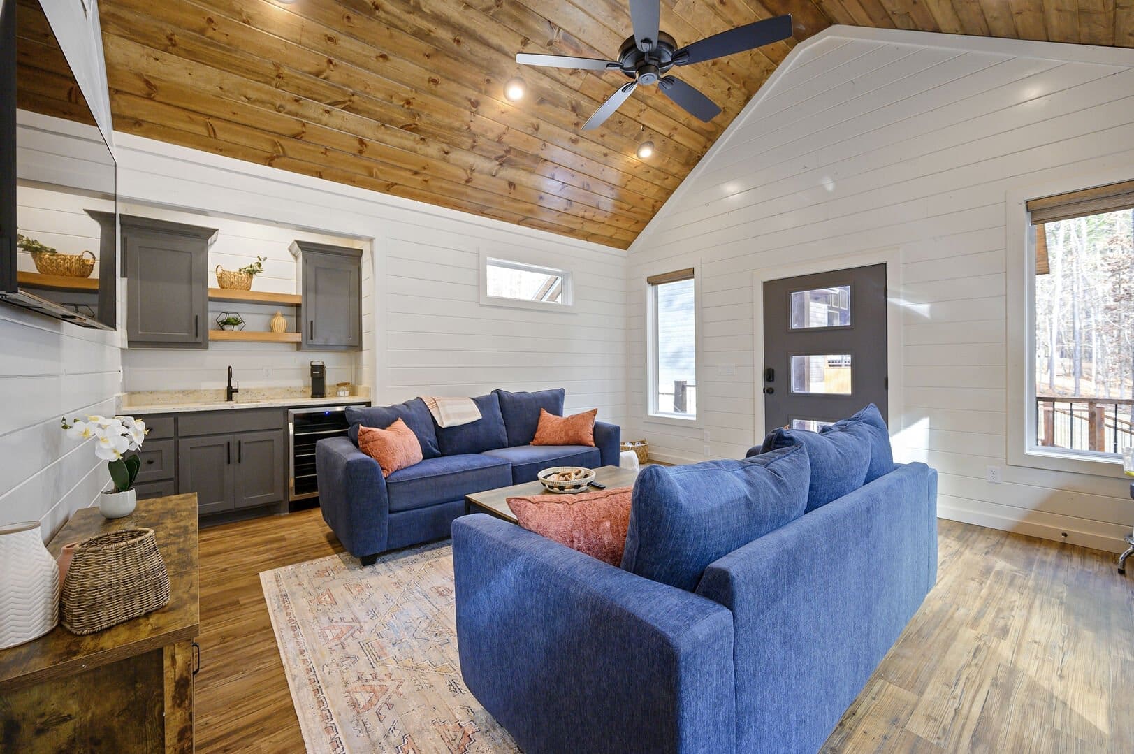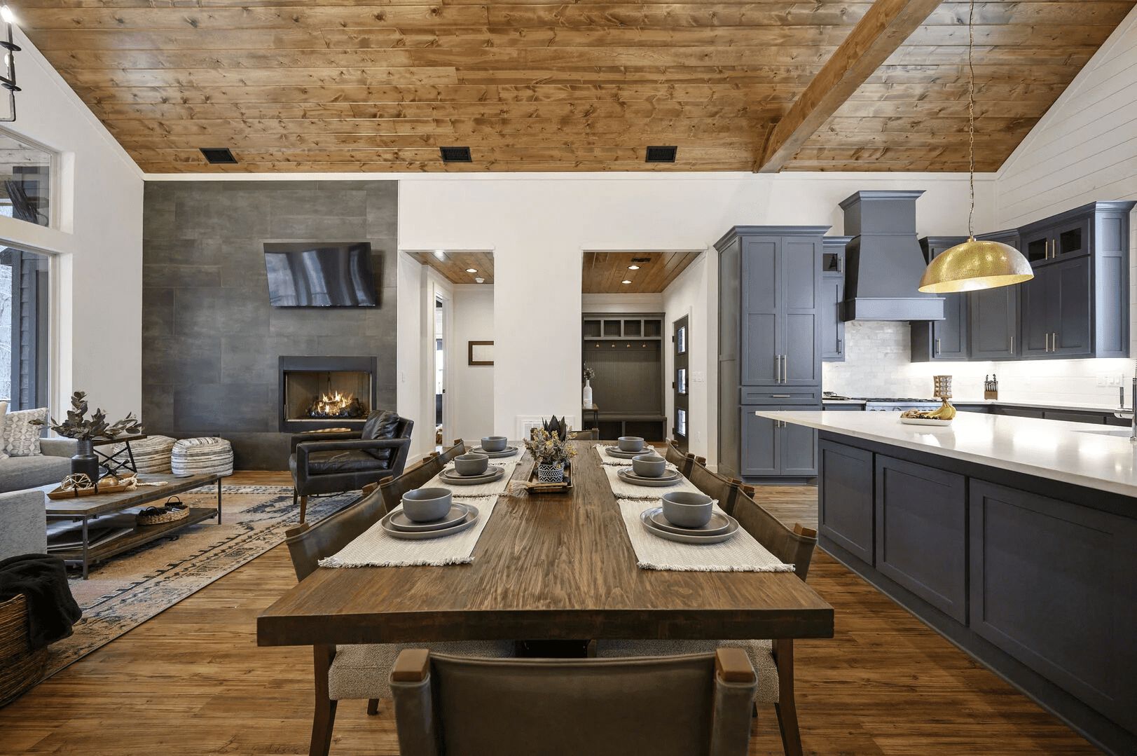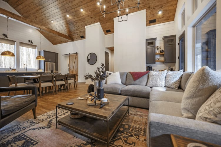 The living room sets the tone for comfort and entertainment with a large hall tree for storage, a generous sectional sofa, a plush leather lounge chair, two additional stools, a selection of board games, cozy throw blankets, a gas fireplace, and a big-screen HDTV.