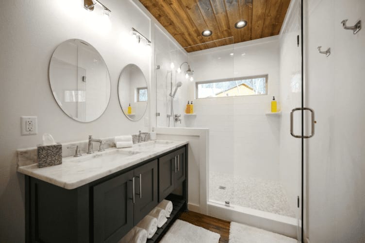 The first master suite (Bedroom and Bathroom #1) features a king-size bed, spacious nightstands with storage, a sizeable three-drawer dresser, a big-screen HDTV, and an ensuite bathroom boasting double vanity sinks, a generously sized walk-in shower with a soaker tub, and a luxurious dry sauna. The second master suite (Bedroom and Bathroom #2) mirrors the comfort, offering a king-size bed, nightstands with storage, a sizeable six-drawer dresser, a big-screen HDTV, and an ensuite bathroom with double vanity sinks and a sizable walk-in shower.