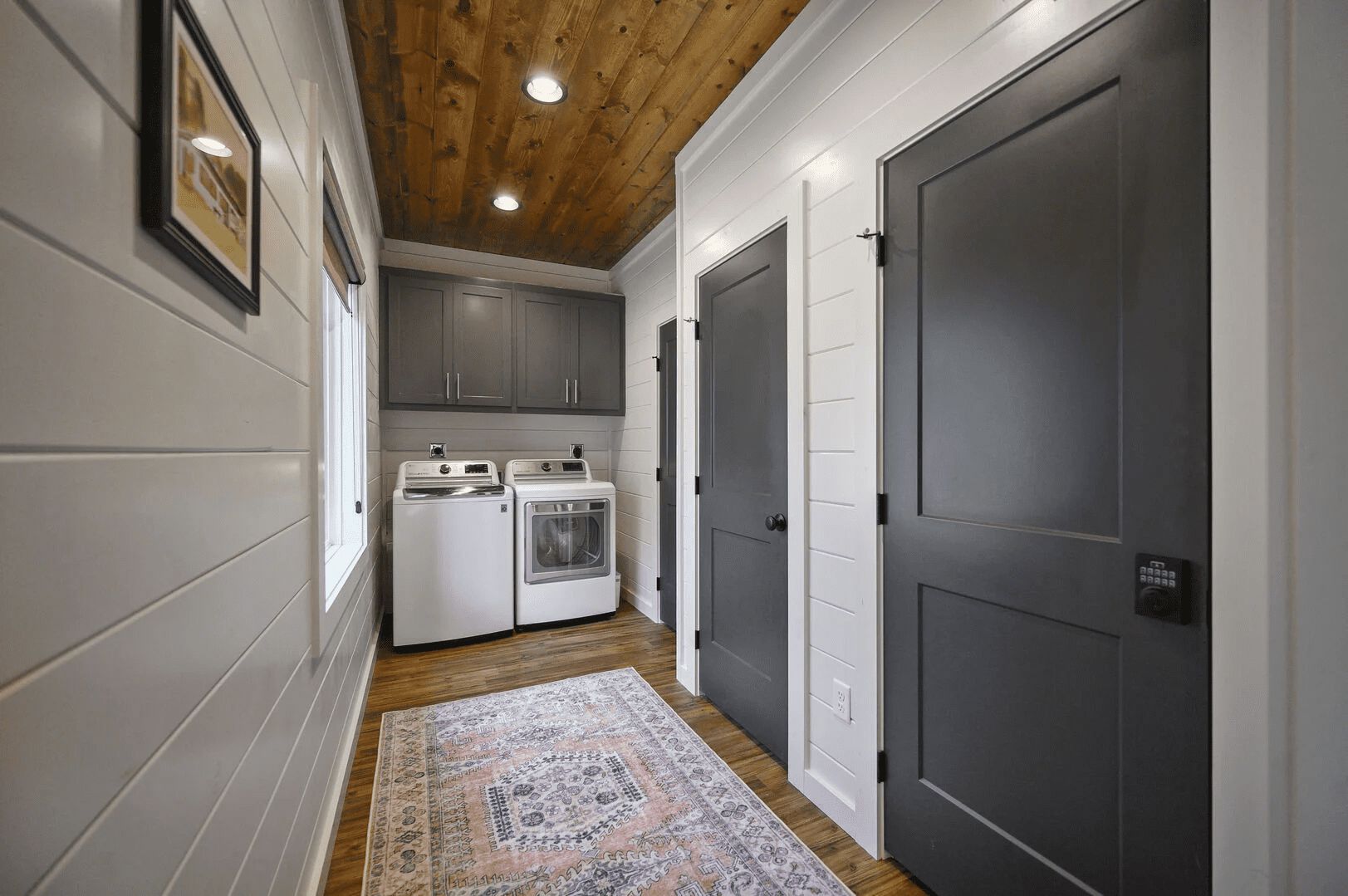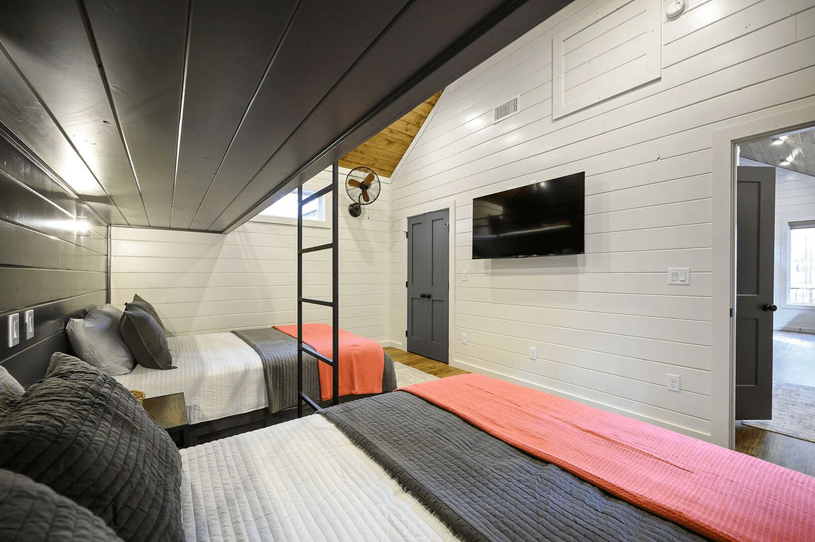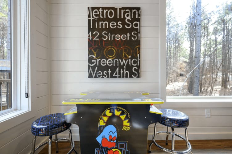 The Bunk House, a secondary dwelling, accommodates six guests with two full beds over two queen beds. This space is designed for entertainment, featuring a pre-loaded arcade table, a big-screen HDTV, a full bathroom with a spacious walk-in shower, two sofas, another big-screen HDTV, a kitchenette equipped with a dishwasher and Keurig coffee maker, and even a washer and dryer.