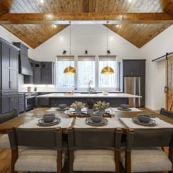 The well-appointed kitchen and dining area invite culinary exploration and communal meals, offering a dining table for eight, a sizable island, and a dedicated coffee and wine bar with a wine cooler. All essentials for cooking, including pots, pans, dinnerware, dish soap, and dishwasher detergent, are thoughtfully provided.