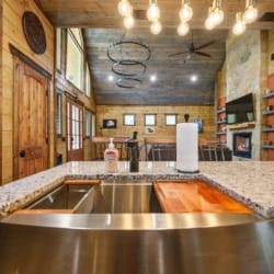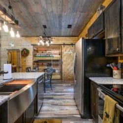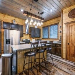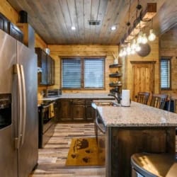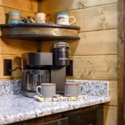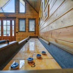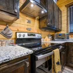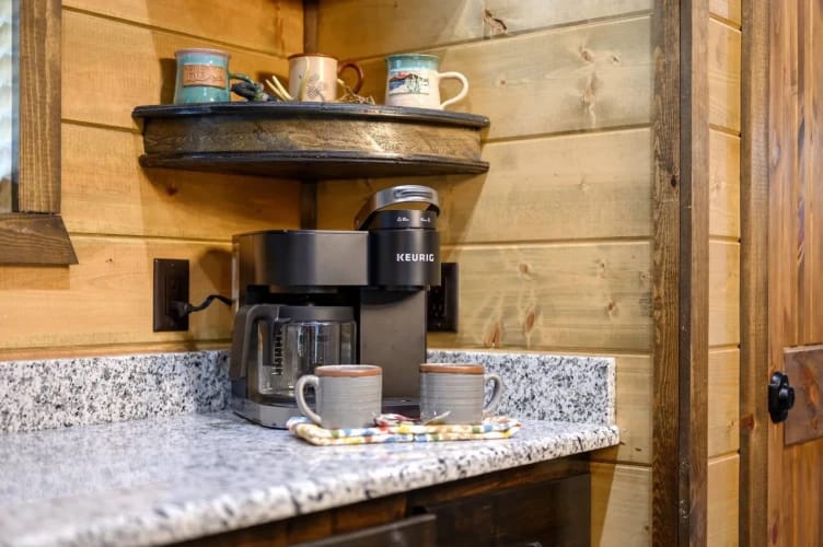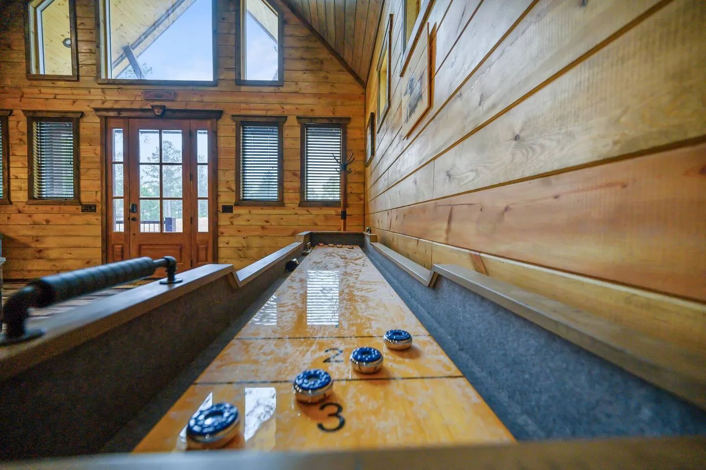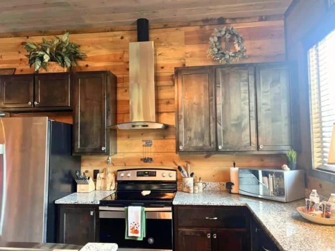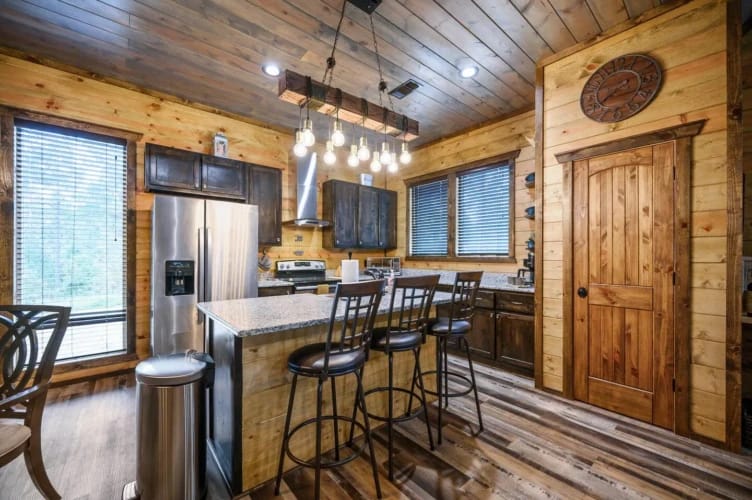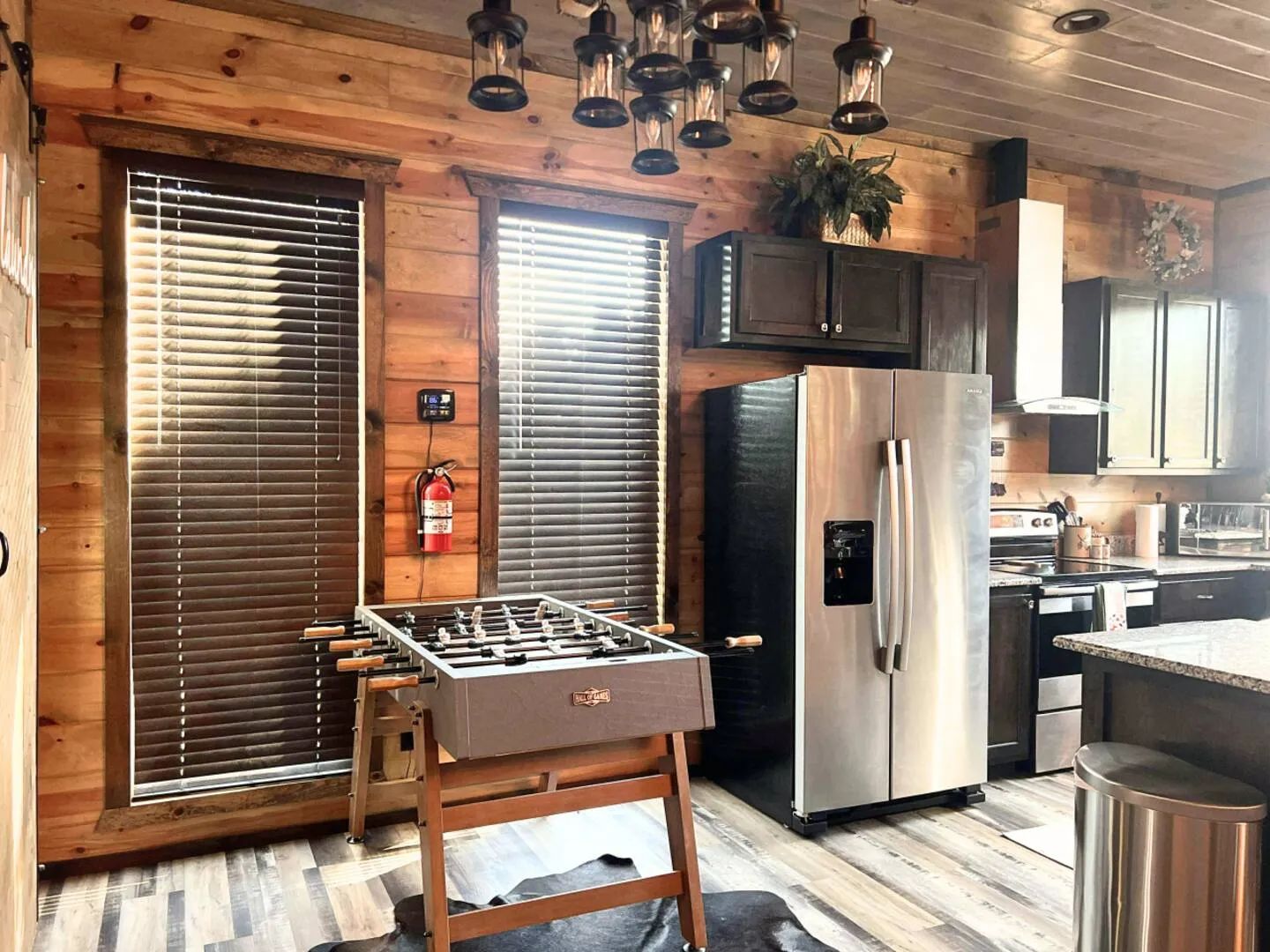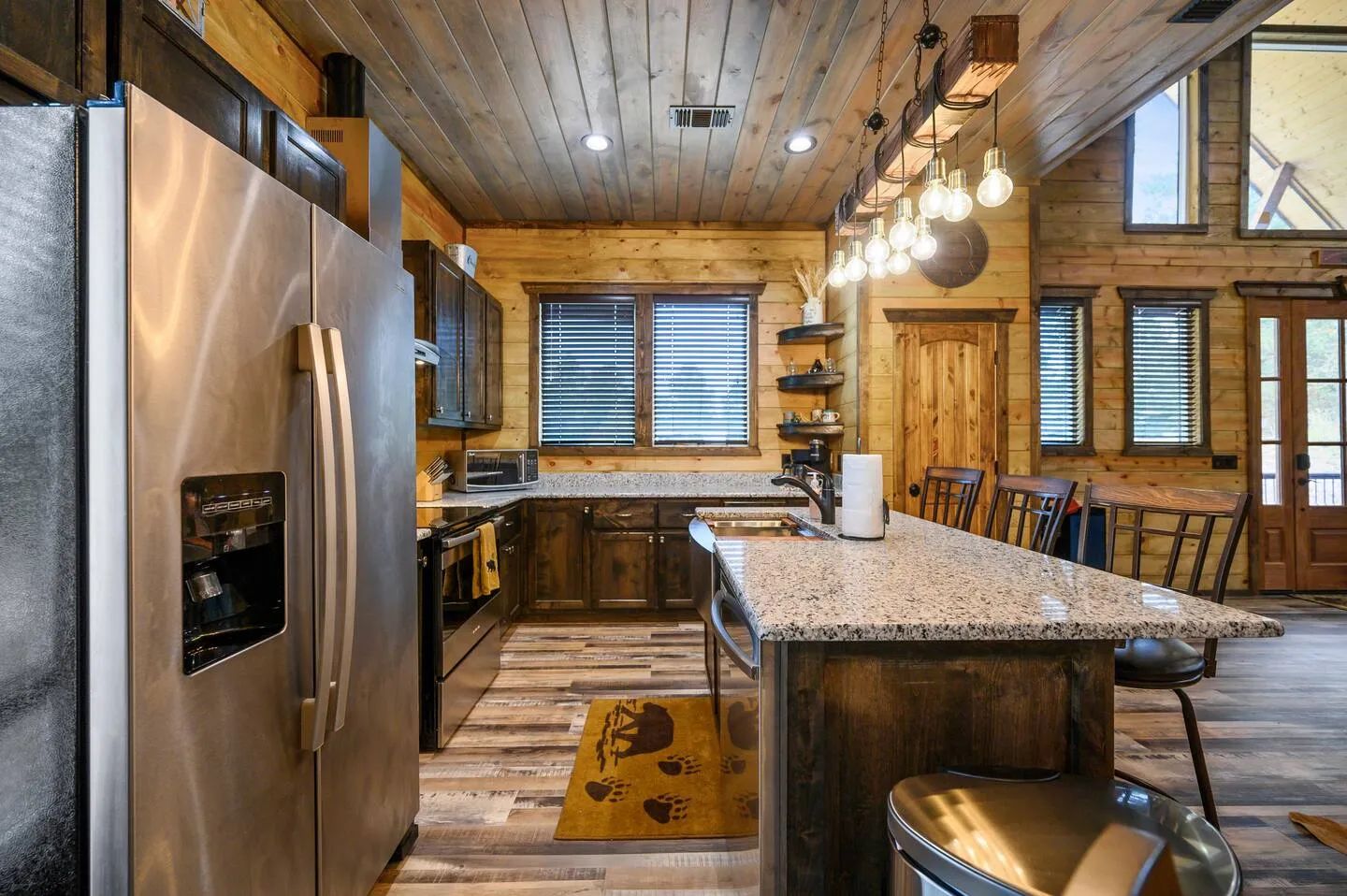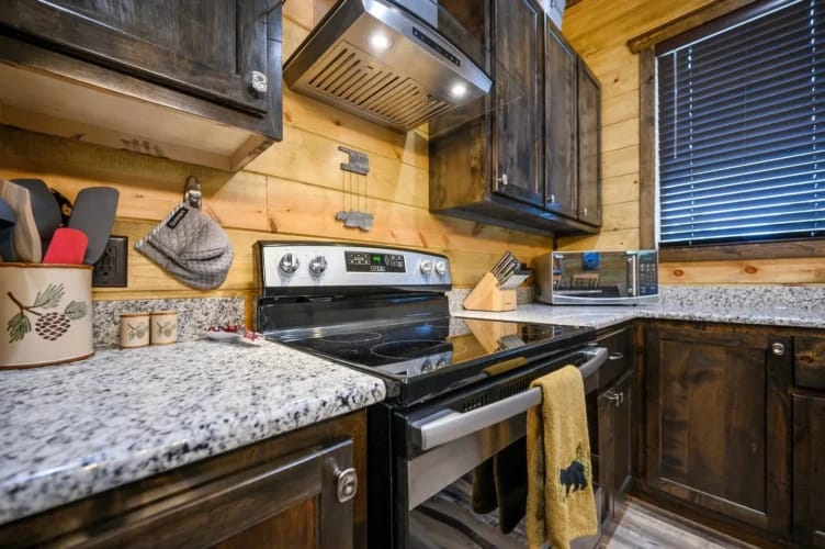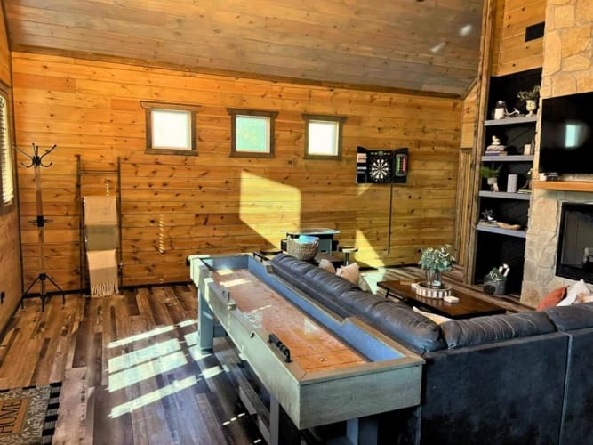 The kitchen has modern appliances and granite countertops, making meal preparation a breeze. Guests will find everything they need, from an electric stove and wall oven to a Keurig coffee maker complete with K-Cups. A wine bar with a mini fridge adds a touch of elegance, making the space ideal for celebrating special moments. The cabin includes a shuffleboard table and smart TVs in the living room, bedroom, and even the deck for entertainment.