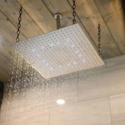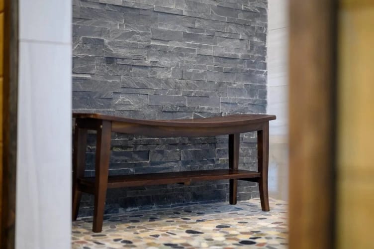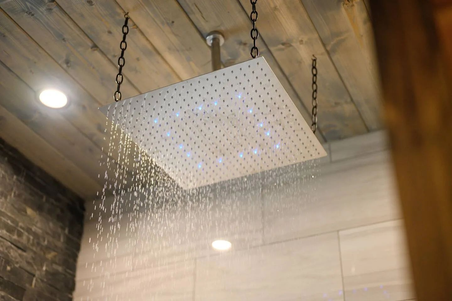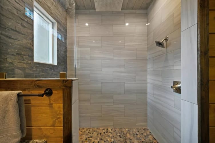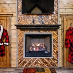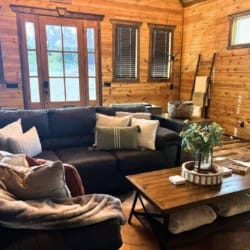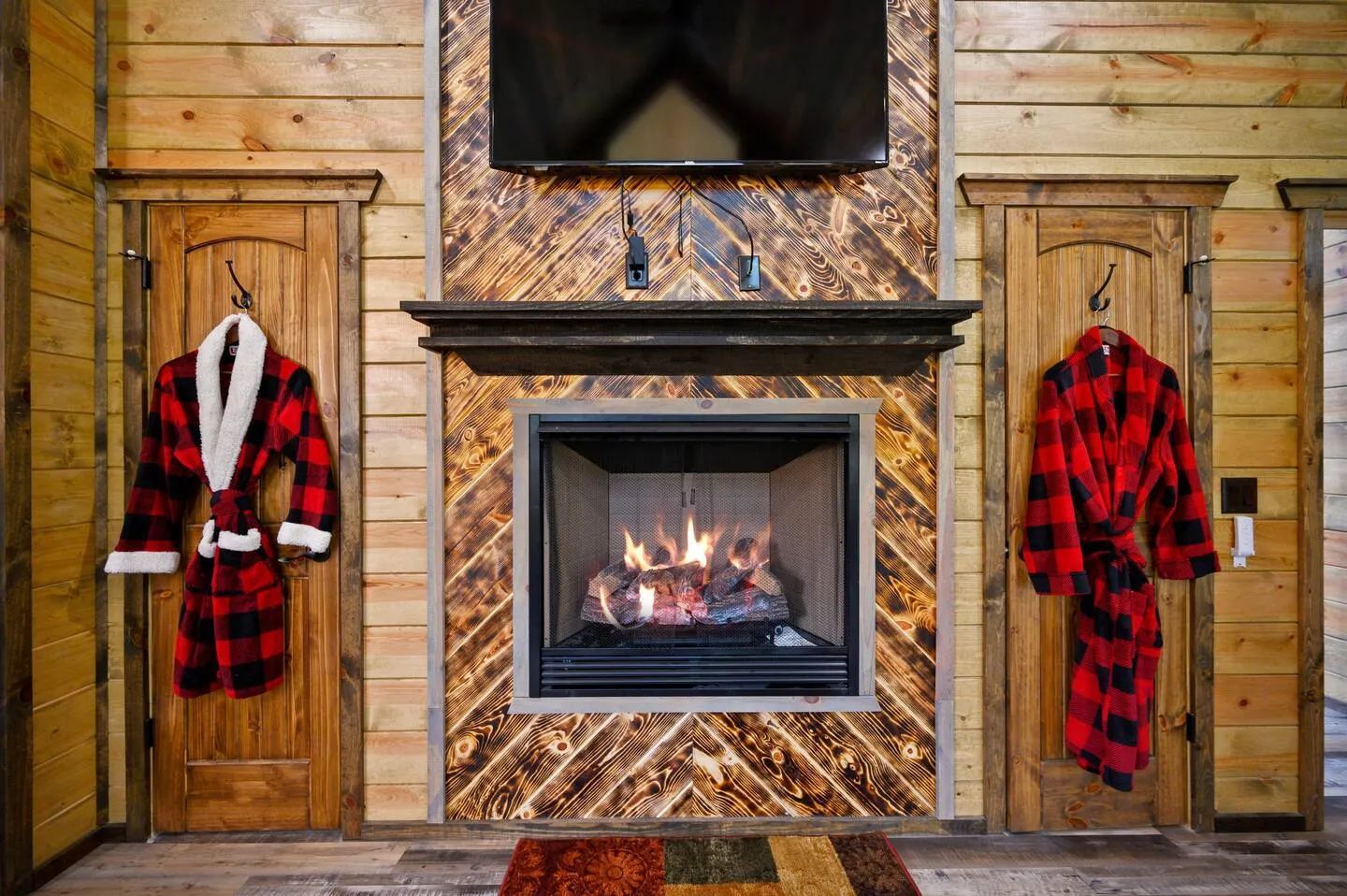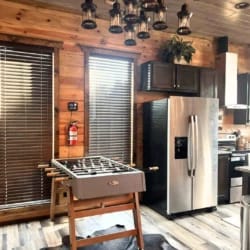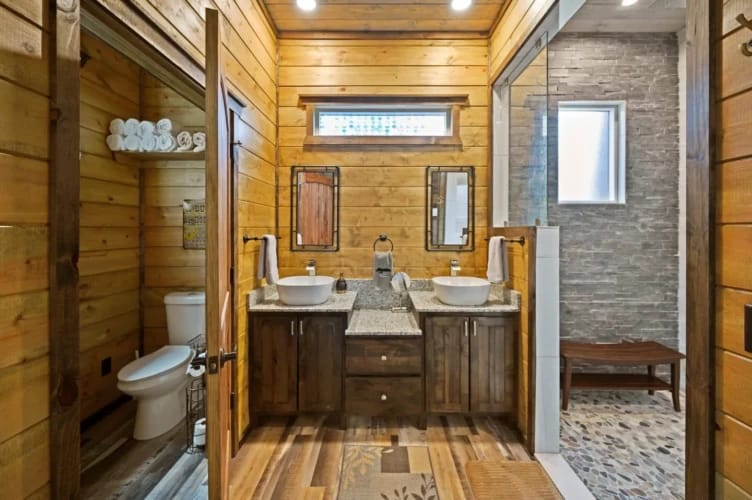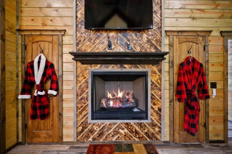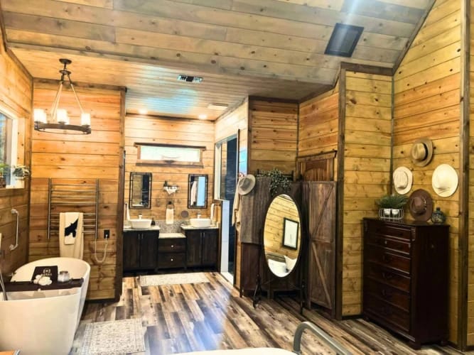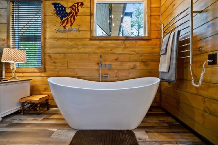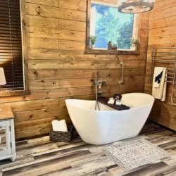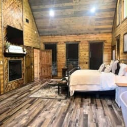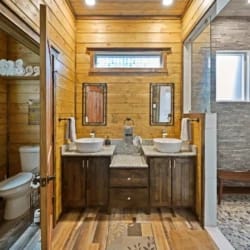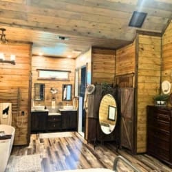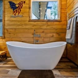 The Adirondack offers a spacious floor plan that blends modern convenience with rustic charm. Spanning over 1,350 square feet, the cabin boasts high ceilings and an open-concept layout that feels inviting and luxurious. The master bedroom suite features a plush king-size bed, a two-person soaking tub, and a walk-in shower equipped with a rain shower head. Thoughtful touches like towel warmers add a layer of comfort and sophistication, ensuring every guest feels pampered.
