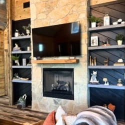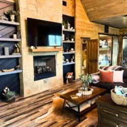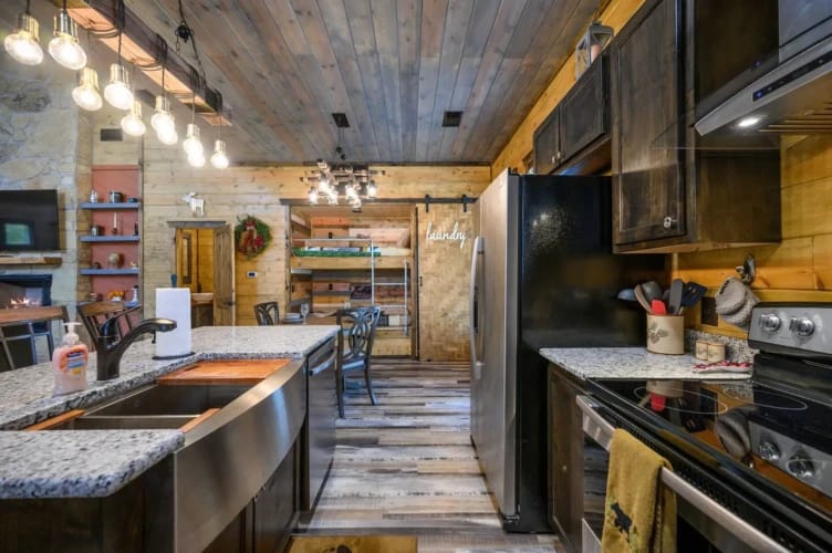 The built-in twin bunks off the main living area provide a cozy and fun sleeping space for younger guests. The living room features comfortable seating and a smart TV, perfect for unwinding after exploring. Guests can also gather around the indoor fireplace, which enhances the cabin’s warm and welcoming atmosphere, especially during the cooler months.