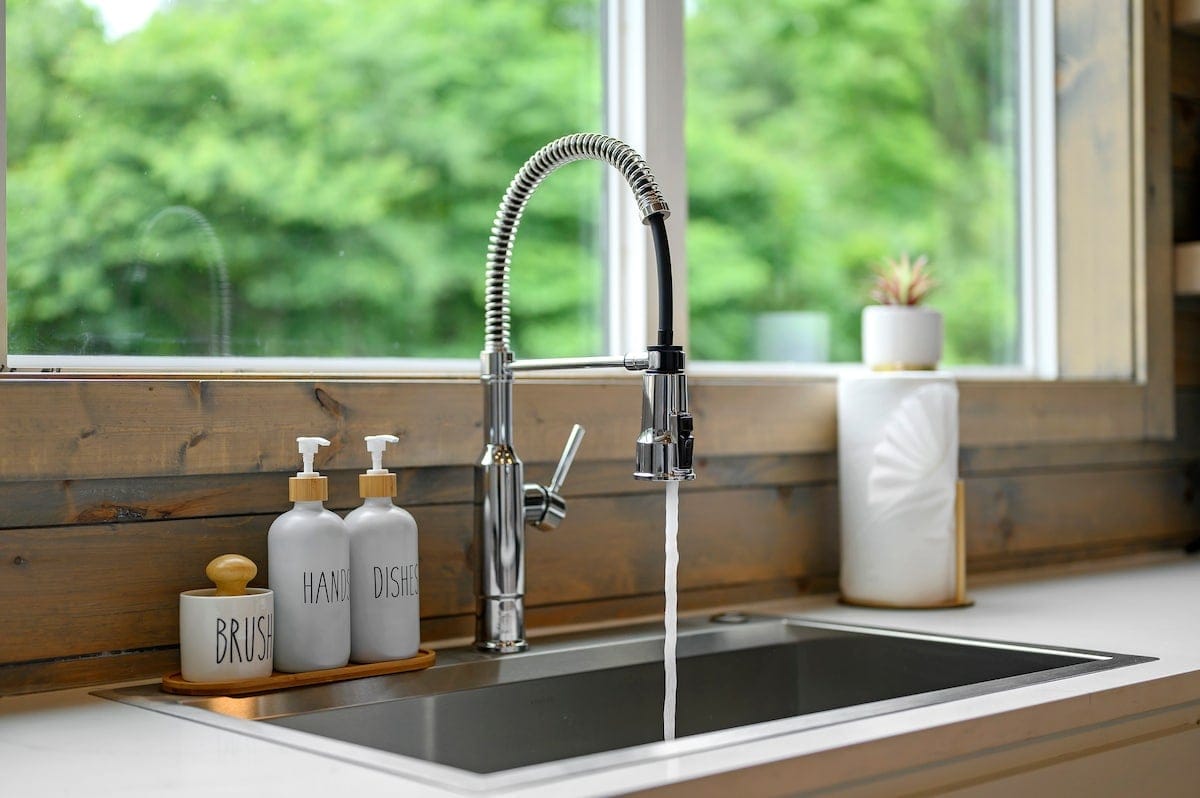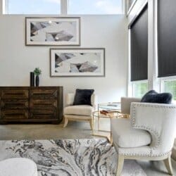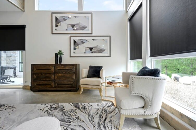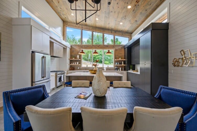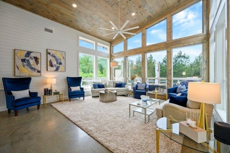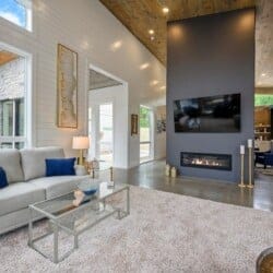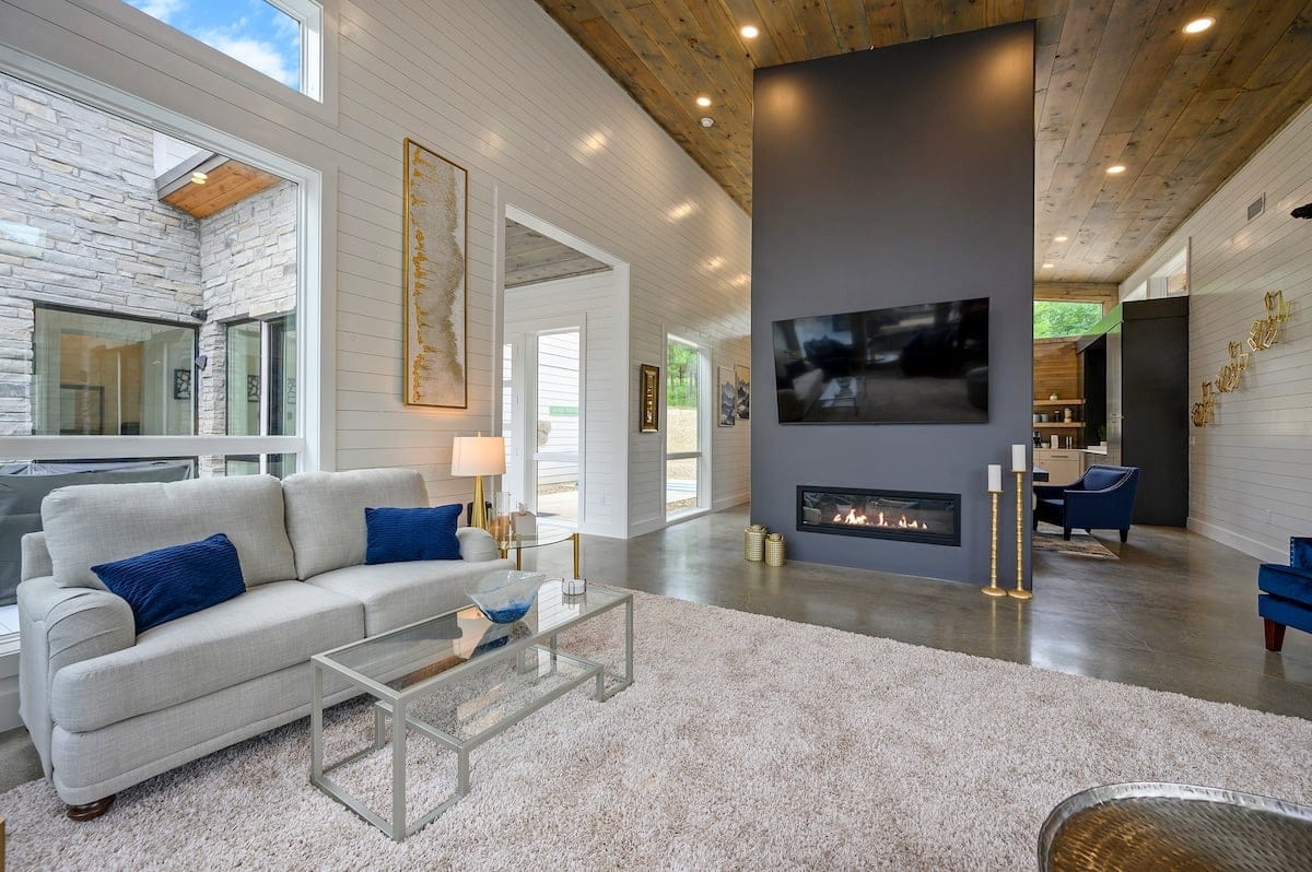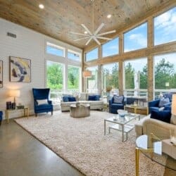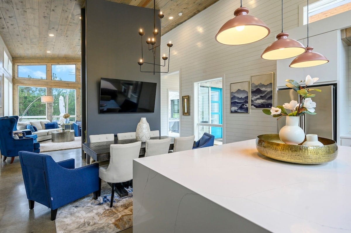 The Hive welcomes guests with clean lines, colorful accents, and an open layout that encourages conversation and group time. In the center of the home, the living area offers soft seating with a plush sofa, a spacious loveseat, and four cozy chairs arranged around a modern electric fireplace. A large Smart TV makes it easy to enjoy a movie night or music playlist, while the nearby dining area sits beneath the warm glow of the double-sided fireplace, creating a lovely atmosphere for meals and late-night chats.
