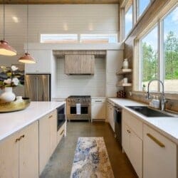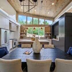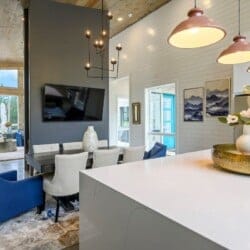 The kitchen continues the elegant and practical design of the rest of the home. With a gas stovetop, full oven, refrigerator, and dishwasher, the space is fully stocked for guests who enjoy cooking. The large island provides extra prep space and seating for four, while the main dining table offers room for eight more. Whether starting the day with a fresh espresso from the illy machine or gathering for brunch before an afternoon at the pool, the kitchen and dining area flow together to keep everyone connected.