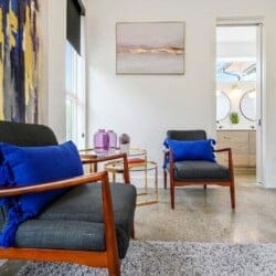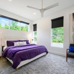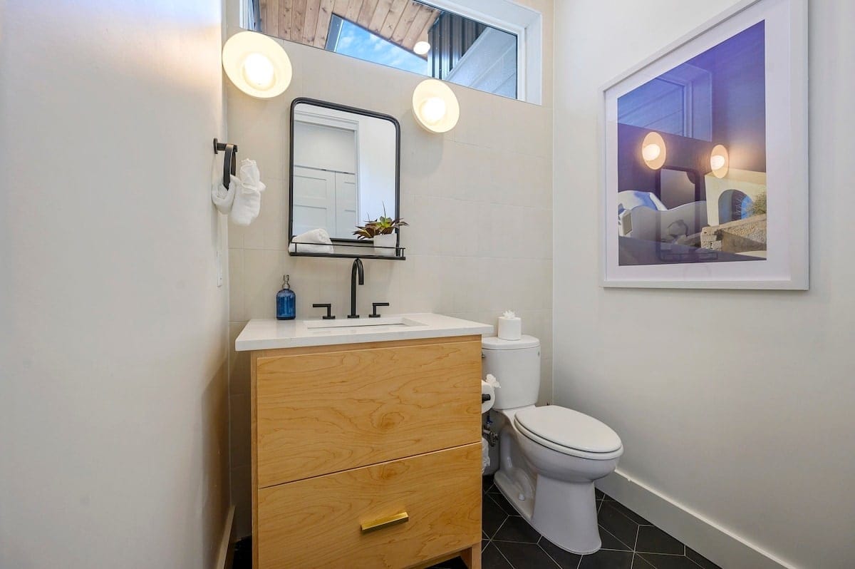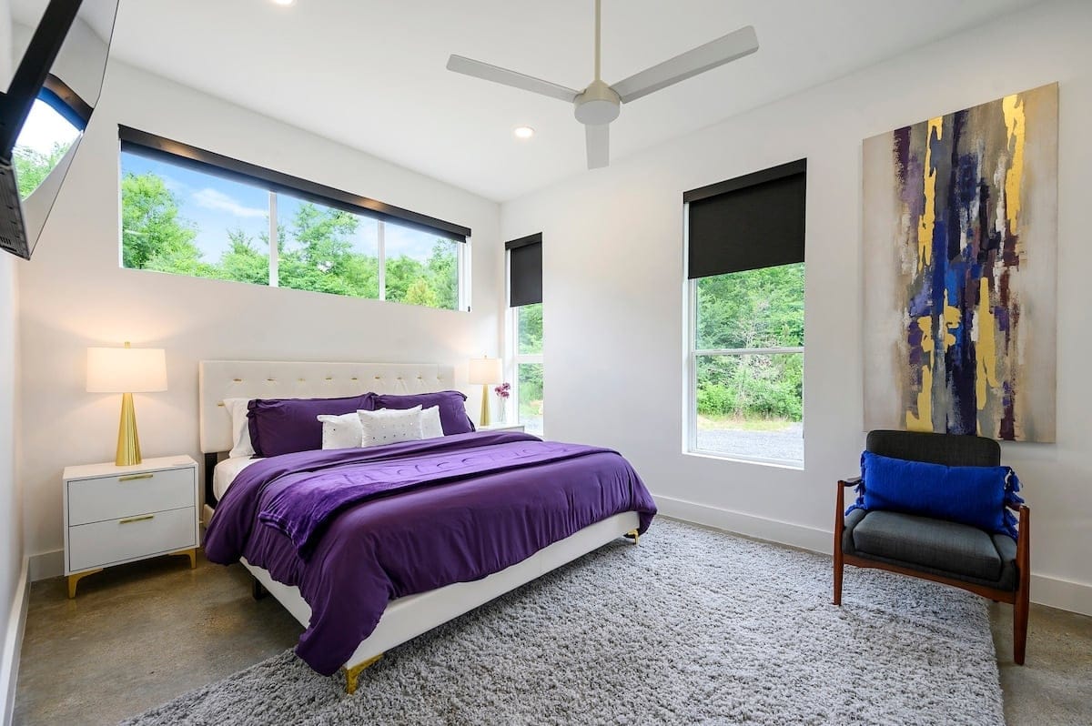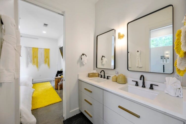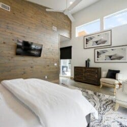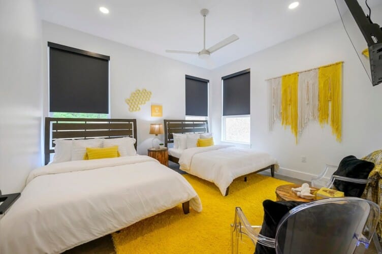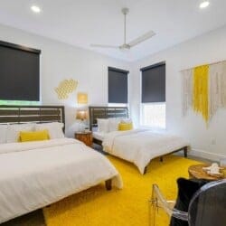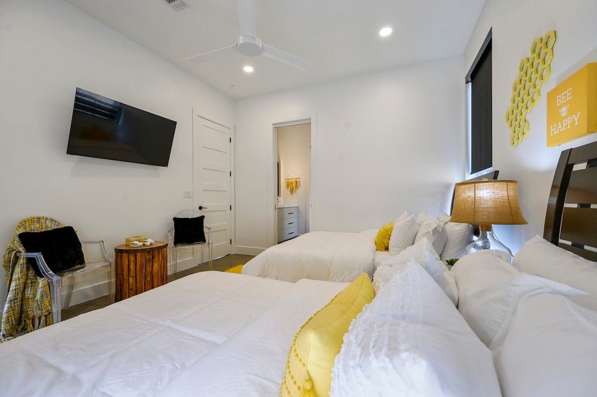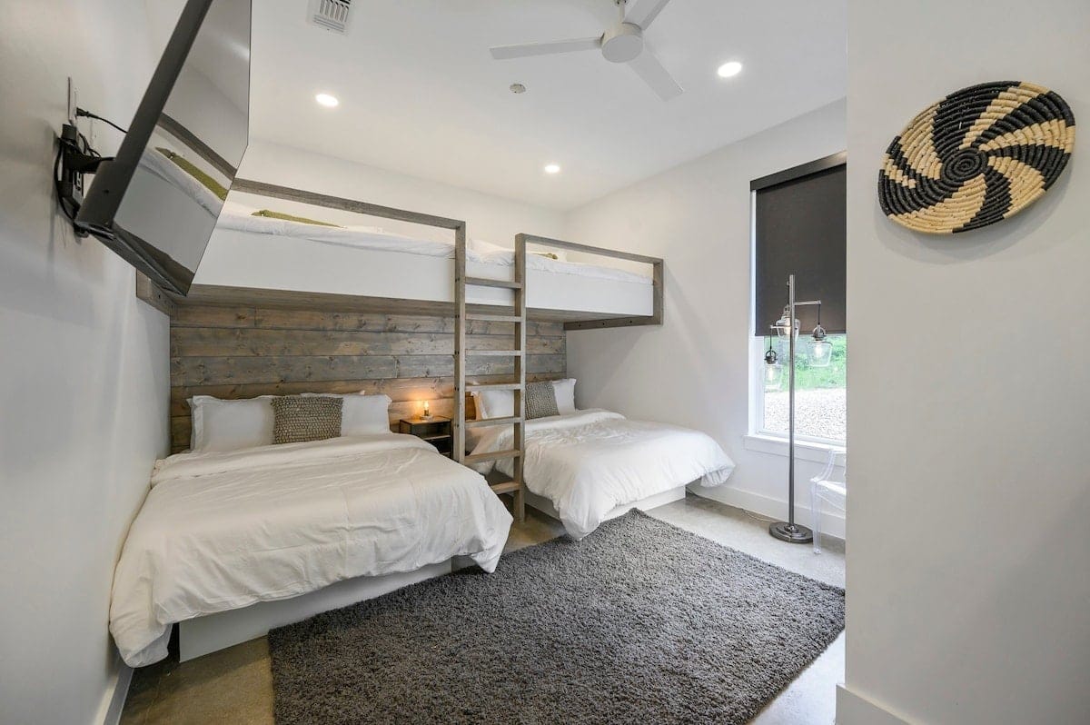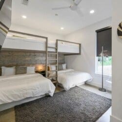 Each of the four bedrooms in The Hive provides a mix of comfort and personality. The two king suites include thoughtful furnishings like soft chairs, nightstands, and Smart TVs. One suite opens directly to the pool deck and features a spa-like bathroom, double vanity, a soaking tub, and a walk-in shower with dual rainfall heads. The second king suite has its own walk-in shower and double vanity. A third bedroom includes two queen beds, colorful touches, and an ensuite bathroom with another large walk-in shower. The bunk room sleeps six with two full-over-queen bunks, making it a great space for younger guests or friends who want to share a room.