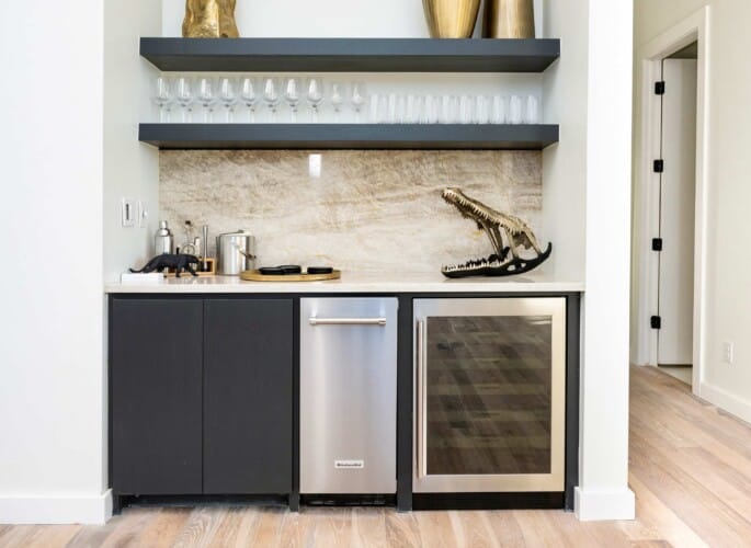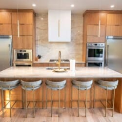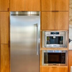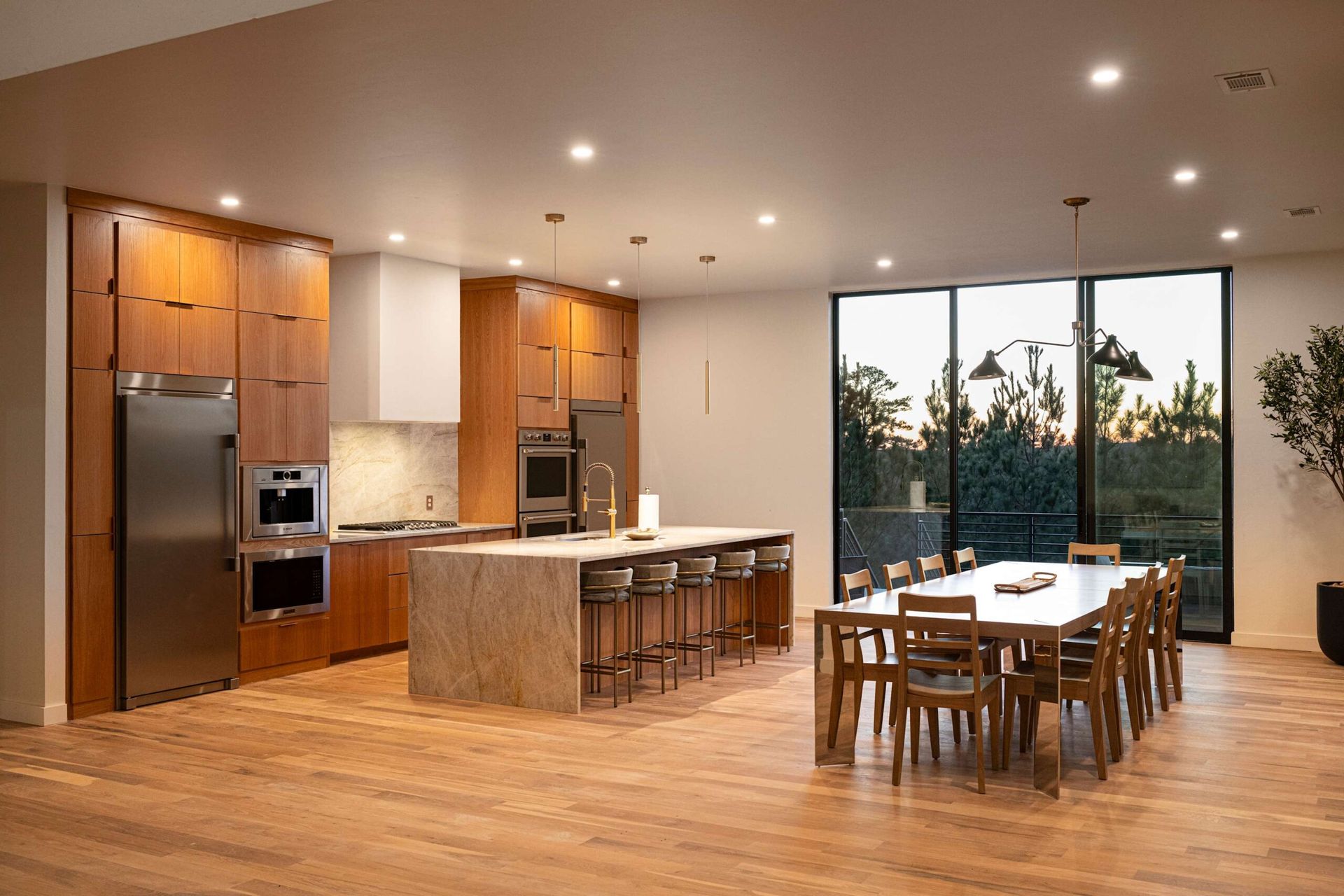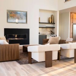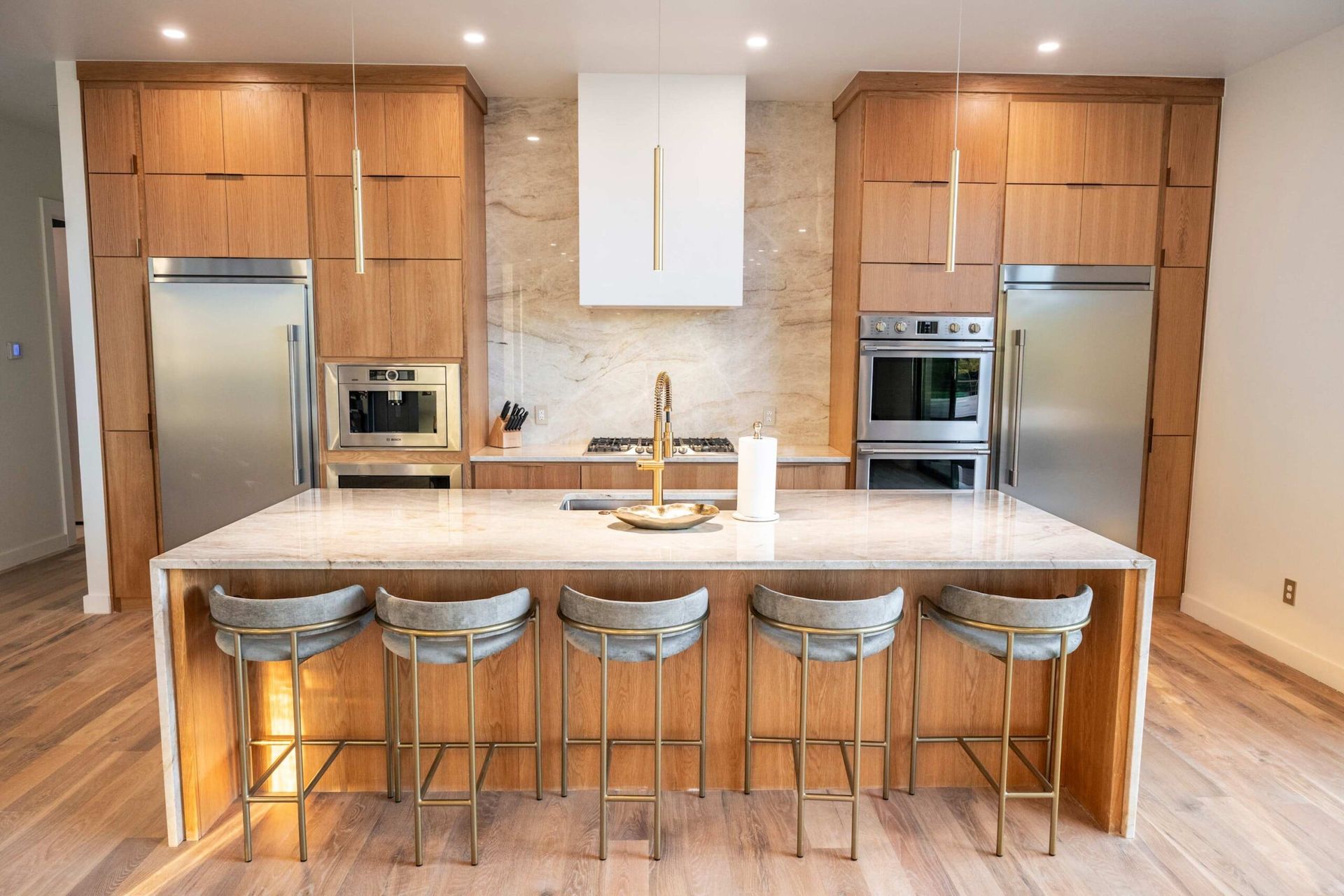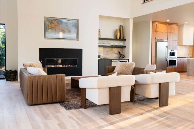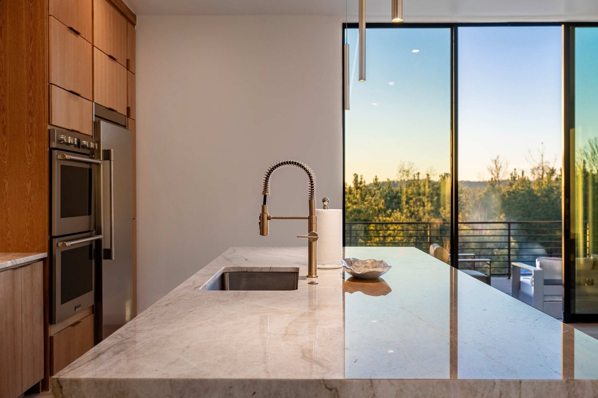 Beavers Bend State Park. From the start, you notice how peaceful it is, with tall trees all around and the quiet sounds of nature. The Jade invites you in with open arms, making it clear that your stay here will be special, relaxing, and a little bit magical. When you walk inside The Jade, the first thing you see is sunlight pouring through giant windows, brightening the big living room and making everything feel open and welcoming. The Jade’s living room is perfect for curling up in front of the fireplace with a book or gathering everyone together to watch a movie. The kitchen at The Jade is more than just a place to cook. With a long, beautiful waterfall island, shiny stainless steel appliances, and double ovens, cooking meals is a pleasure. Whether you are preparing a big breakfast for the group or just having late-night snacks, The Jade’s kitchen is ready for anything.