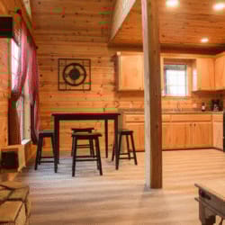 As you step inside, you’ll discover a cozy haven where rustic charm meets modern comfort. On cooler evenings, gather around the propane fireplace in the inviting living area, where you can unwind with your favorite streaming services on the large Roku TV. Take in the panoramic views of the lush greenery surrounding you from the front porch. Alternatively, head to the patio and fire up the propane grill for a delightful outdoor barbecue with stunning sunset vistas.