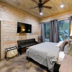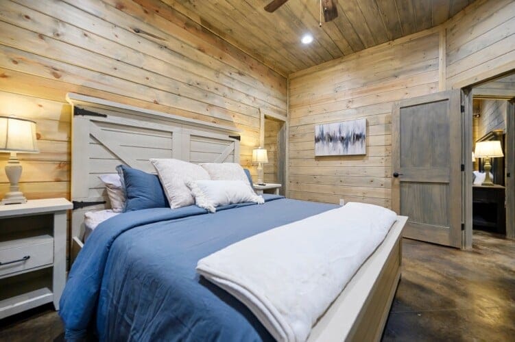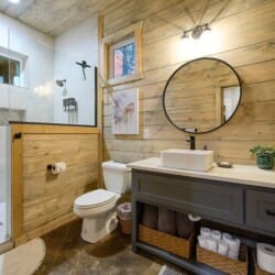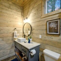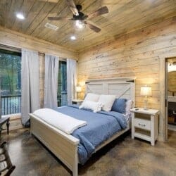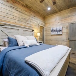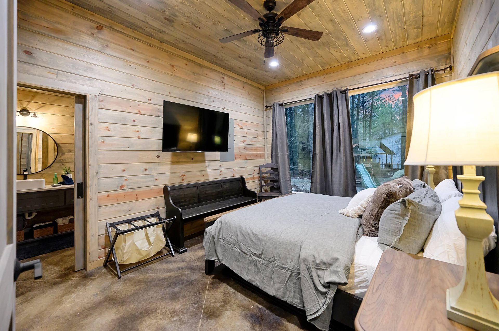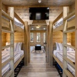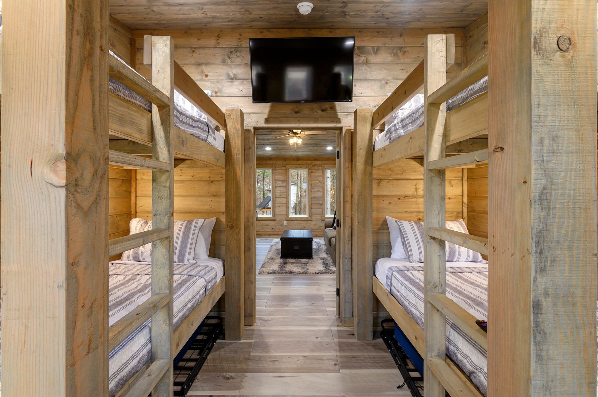Sleeping arrangements at The Twisted Pine are spacious and thoughtfully designed. Two king suites on the main floor each feature comfortable beds, large smart TVs, and private bathrooms with walk-in showers. Upstairs, the bunk room features two double-stacked twin beds. A half bath downstairs adds extra convenience, especially during group stays.
