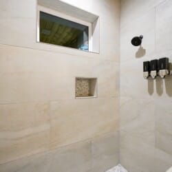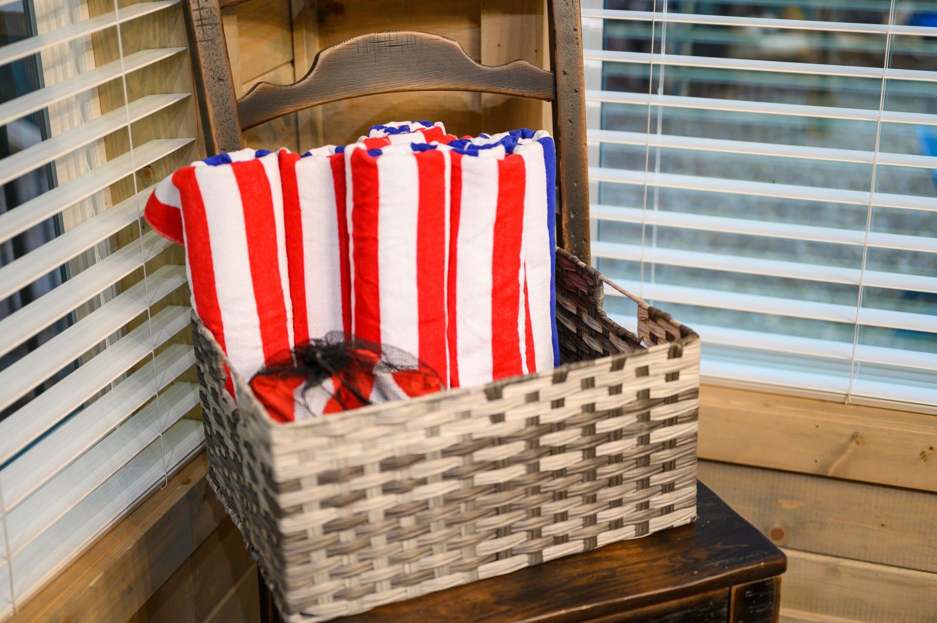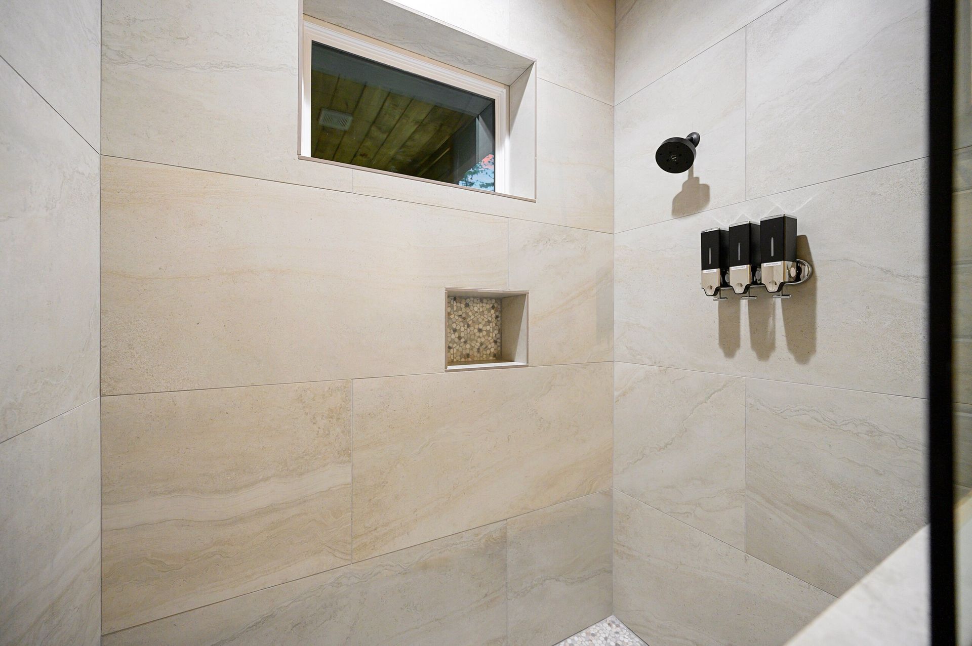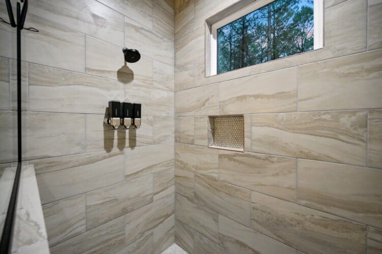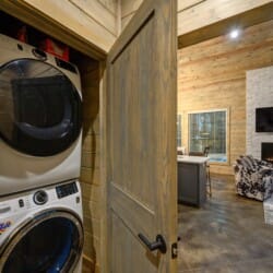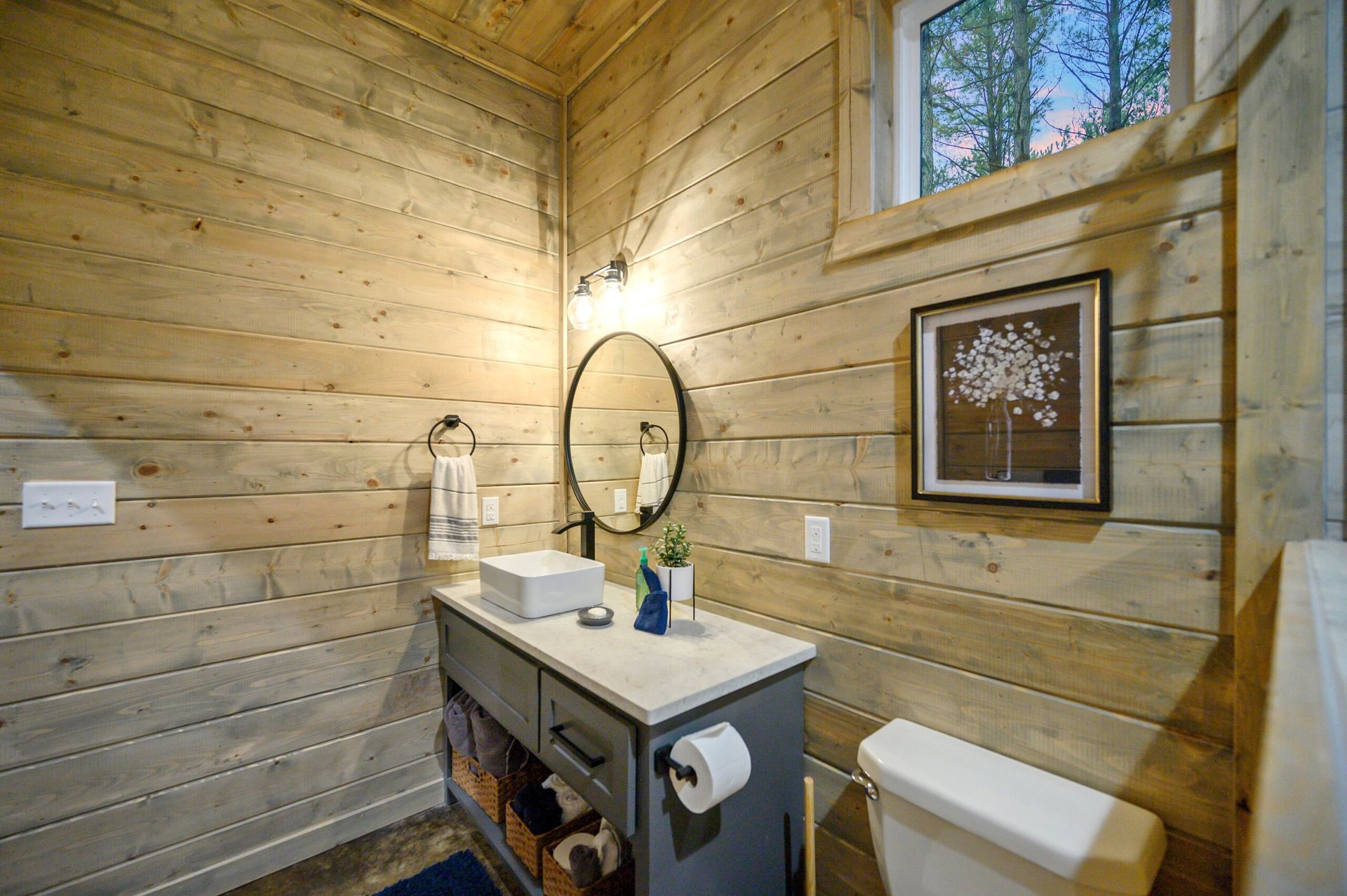 Sleeping arrangements at The Twisted Pine are spacious and thoughtfully designed. Two king suites on the main floor each feature comfortable beds, large smart TVs, and private bathrooms with walk-in showers. Upstairs, the bunk room features two double-stacked twin beds. A half bath downstairs adds extra convenience, especially during group stays.
