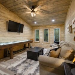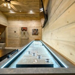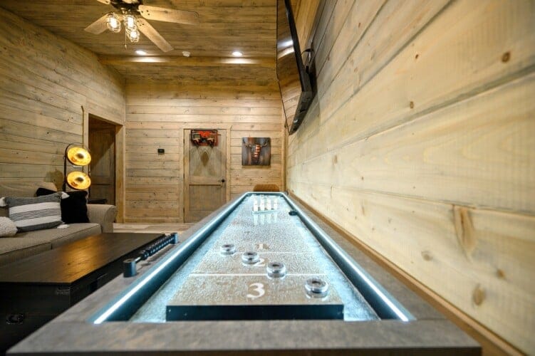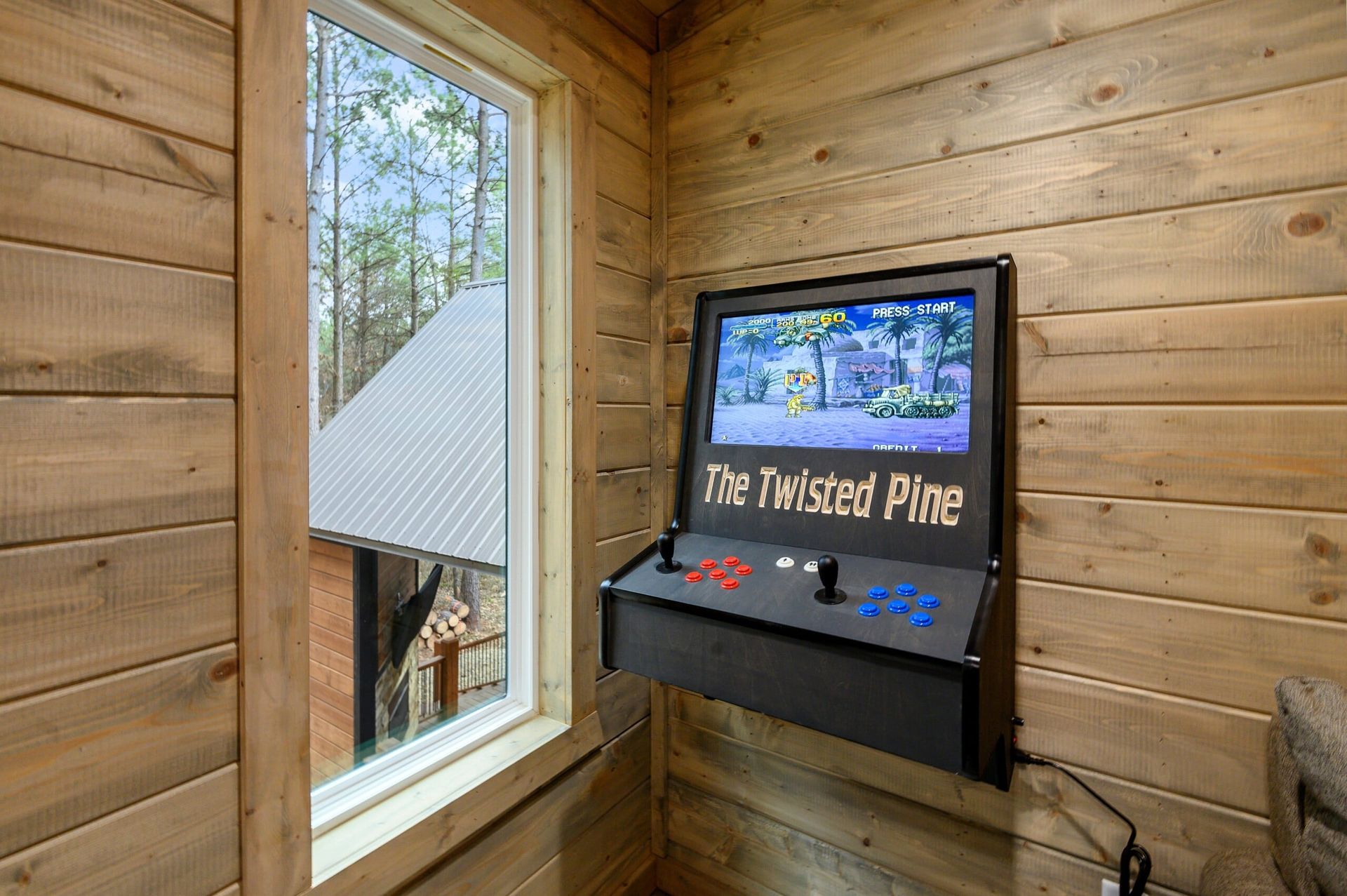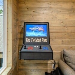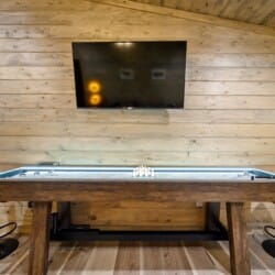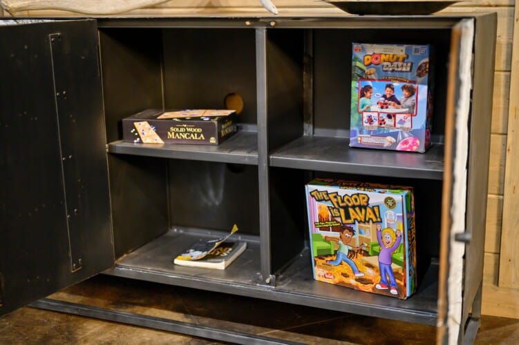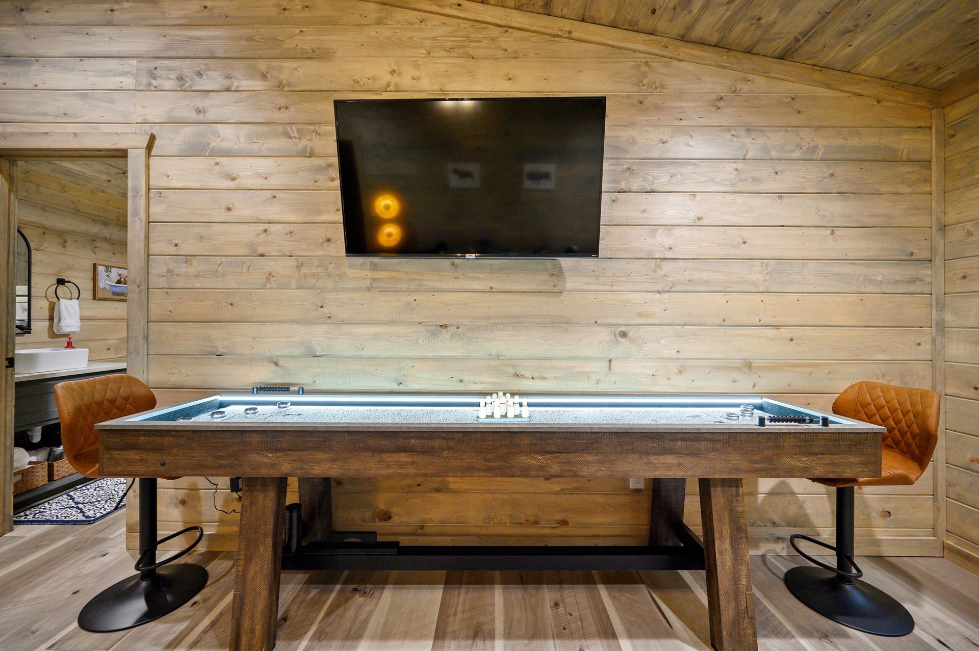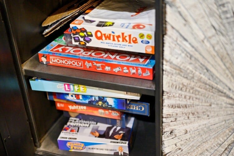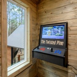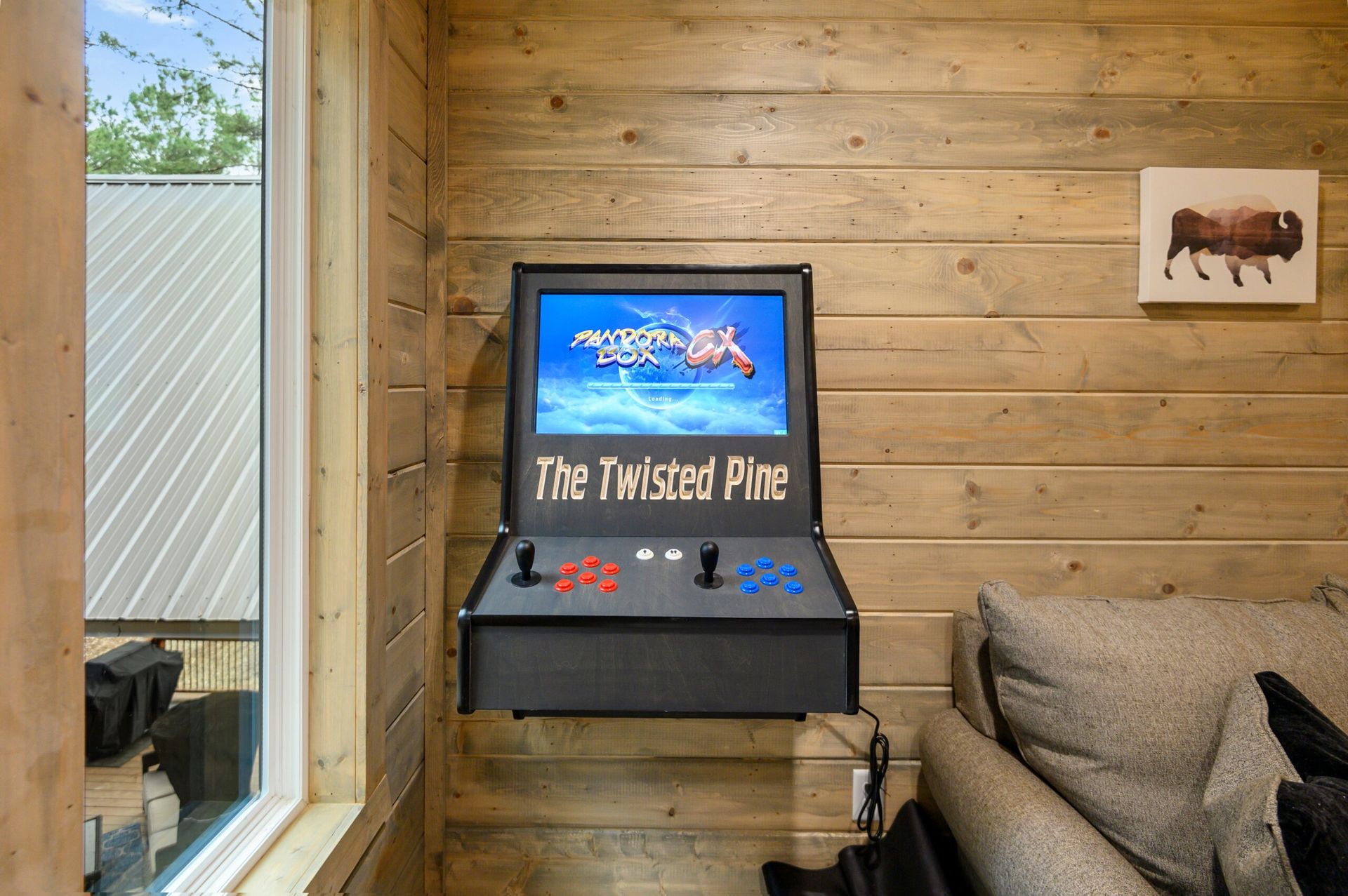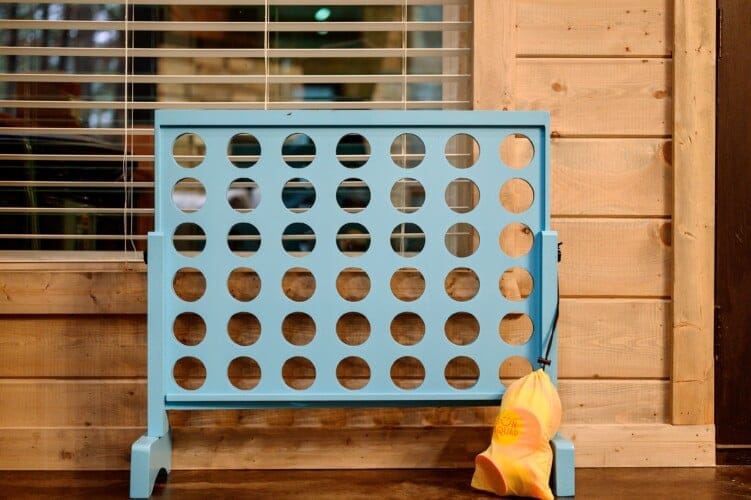 Upstairs, The Twisted Pine offers a game loft that’s designed to keep guests of all ages entertained. The loft features a sofa and a big screen TV, along with plenty of games and entertainment for everyone. There’s a shuffleboard table, an arcade console, and even a double basketball hoop, as well as a life-sized Connect Four game. Board games and extra space make this a great place for kids to hang out or for families to come together for some friendly competition.