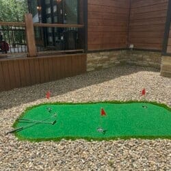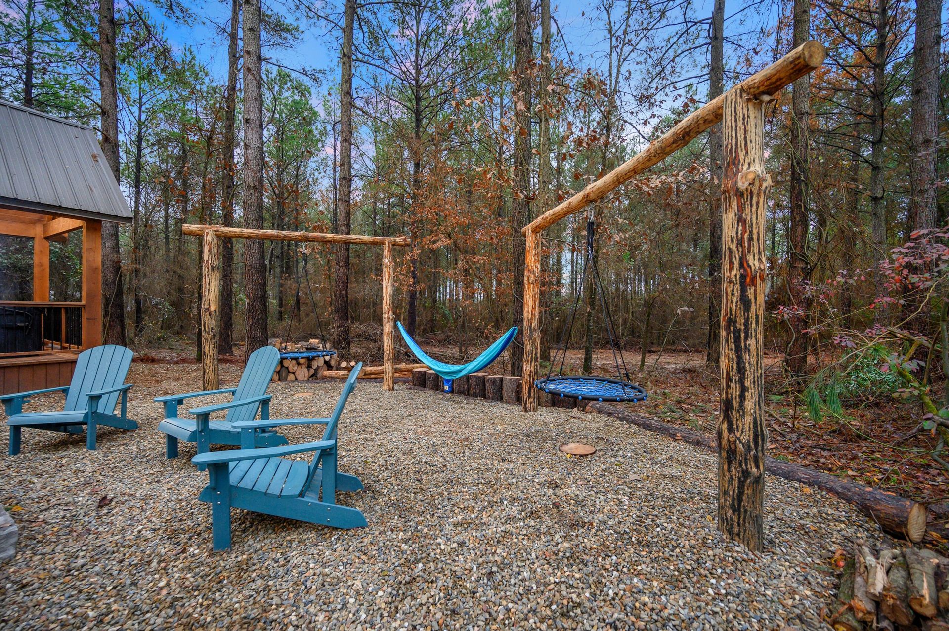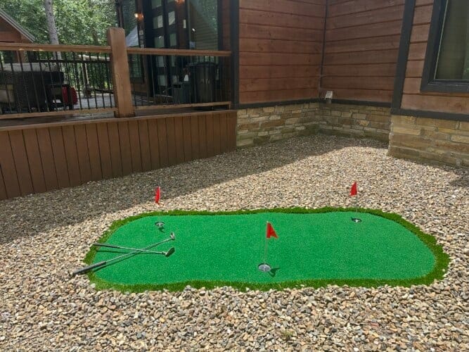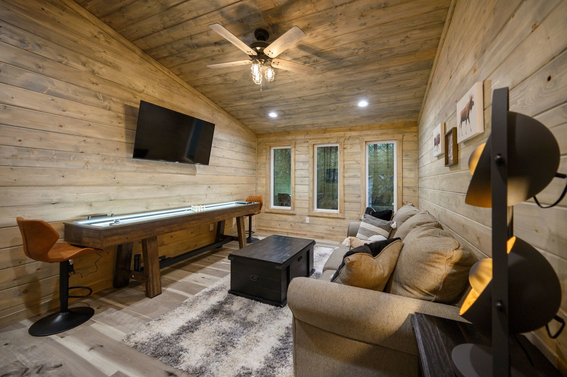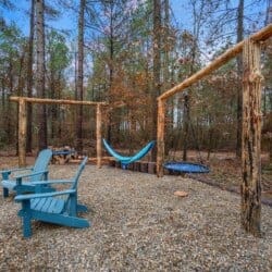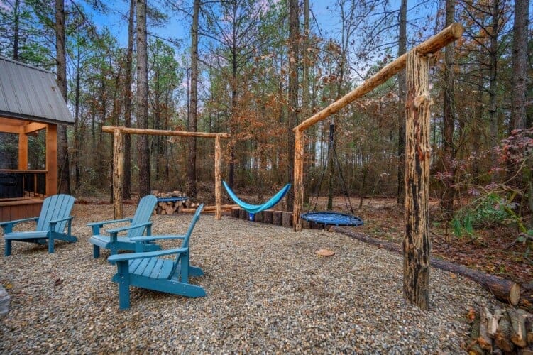 The outdoor space at The Twisted Pine adds a whole other layer of fun and comfort. The covered patio features an outdoor fireplace and a big screen TV, while the bubbling hot tub sits nearby, offering peaceful views of the backyard. A fire pit area invites late-night talks and toasted marshmallows under the stars. For younger guests, the playset and swings offer hours of entertainment. Adults can relax in the hammock or enjoy a round of cornhole or putting on the green just a few steps away.