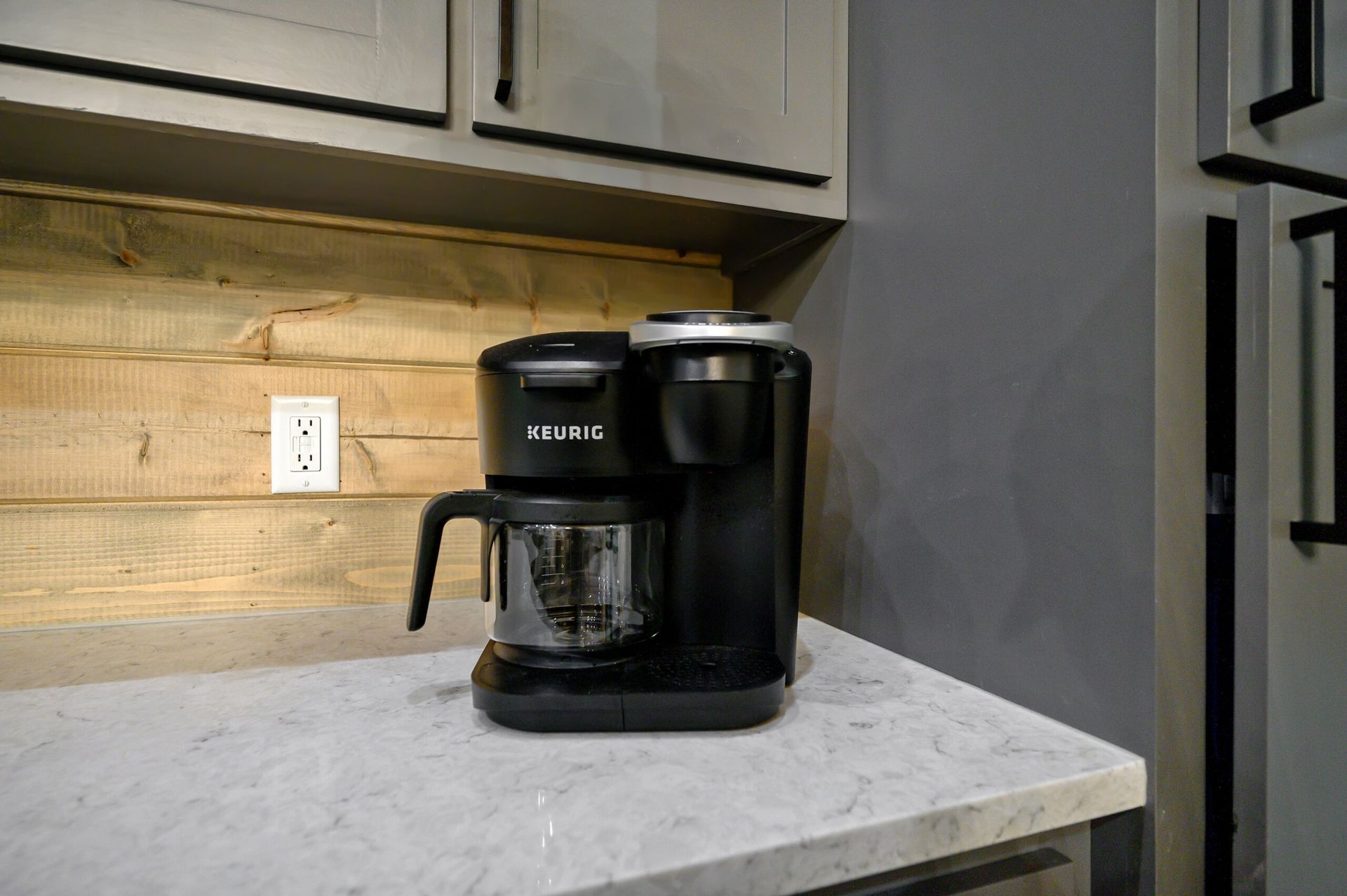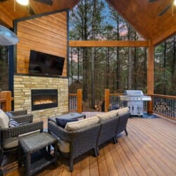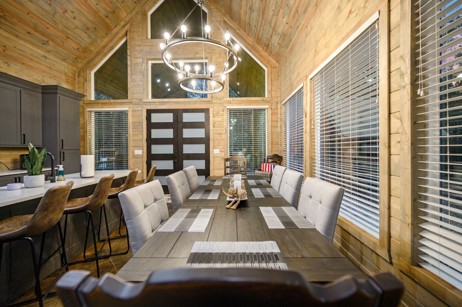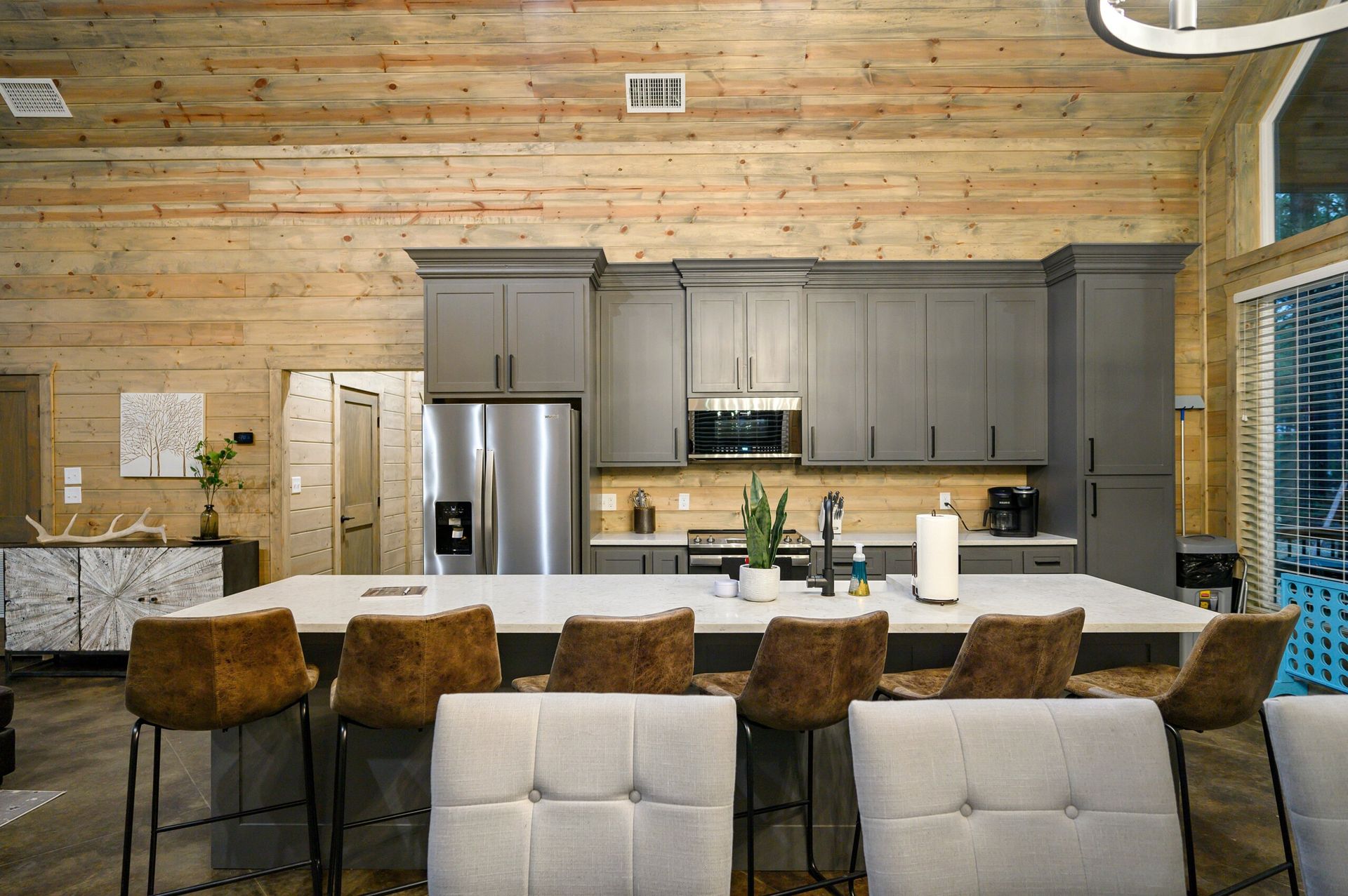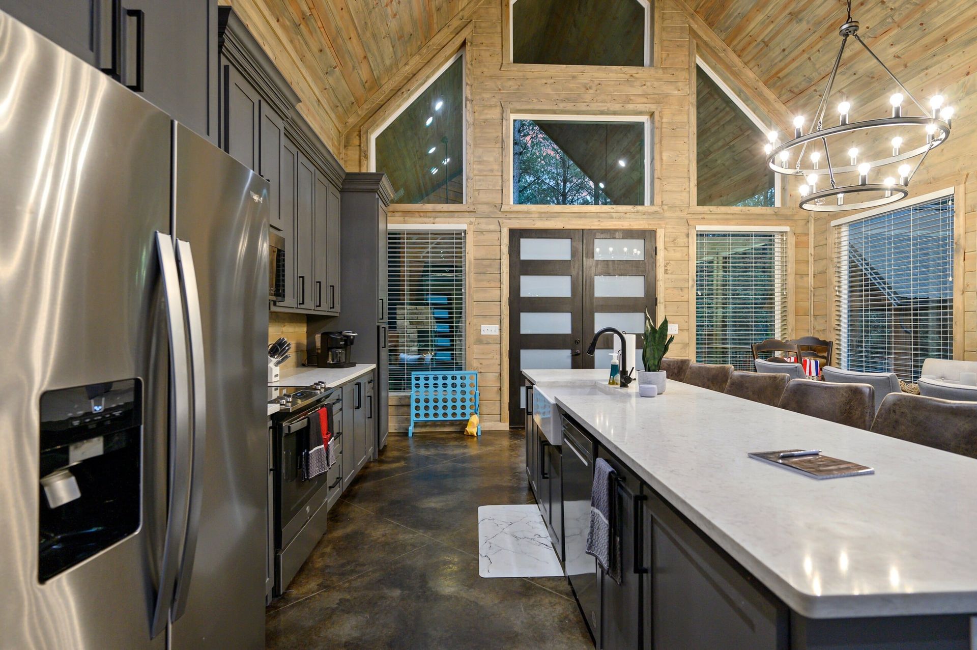 The kitchen at The Twisted Pine is both stylish and practical. With a full set of appliances and all the cookware you need, it’s ready for everything from big family dinners to quick morning breakfasts. A large island with four barstools invites conversation during meal prep, and the dining table offers seating for eight, making it. Just outside, the back deck features a gas grill for outdoor cooking, providing shade under the trees.