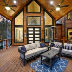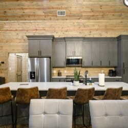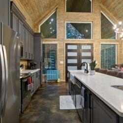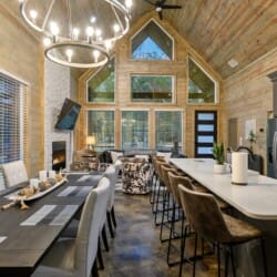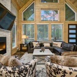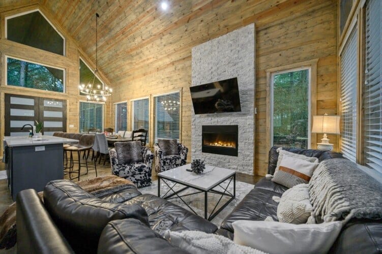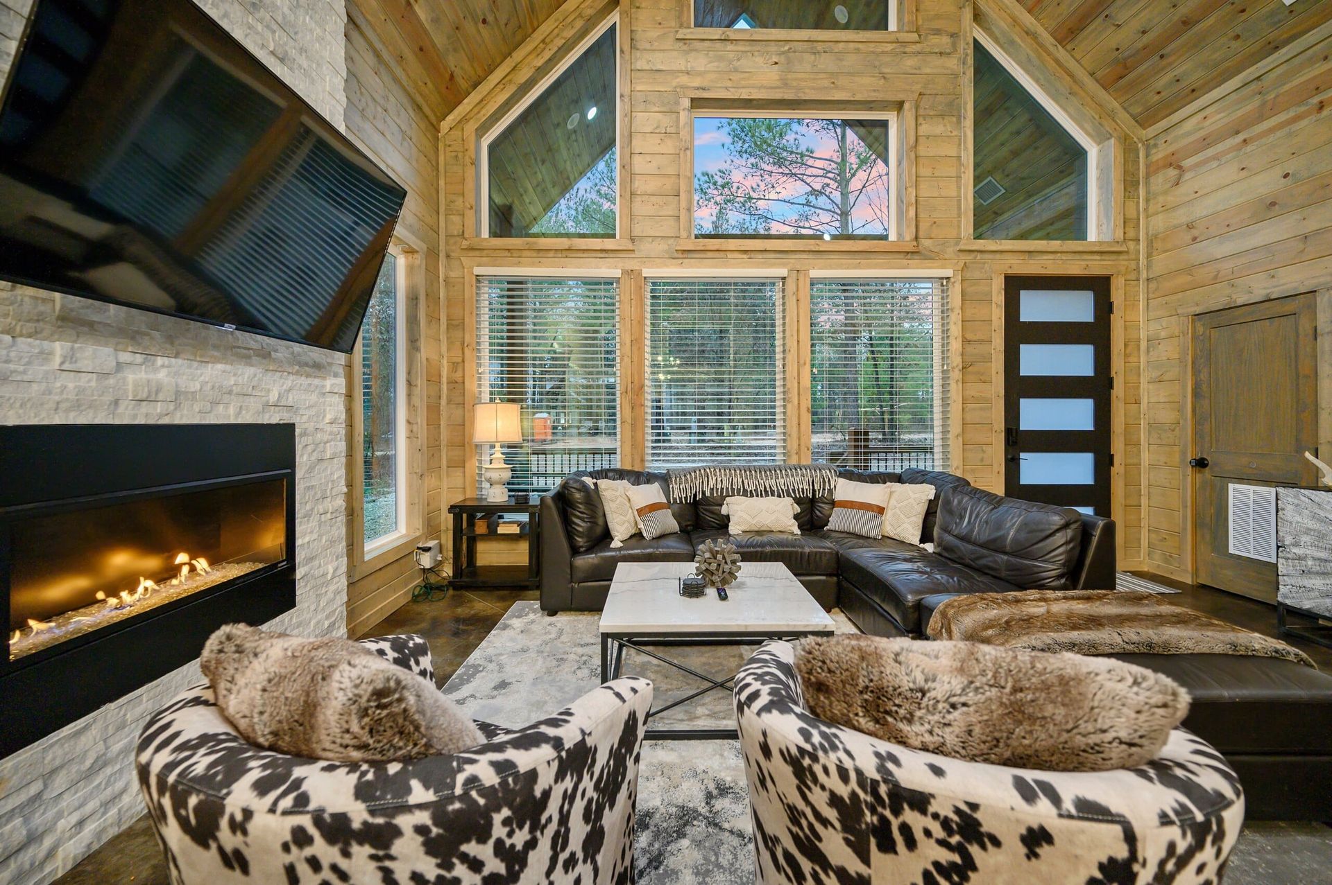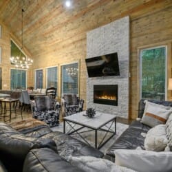 Inside The Twisted Pine, the main living area is open, airy, and filled with natural light. A large leather sectional and two cozy accent chairs sit around a warm gas fireplace, perfect for quiet mornings with coffee or unwinding after a long day out. A big-screen TV is mounted above the fireplace, allowing you to catch the game, stream a favorite movie, or let the kids enjoy their shows while the adults relax. The cabin’s open floor plan makes it easy to stay connected, whether you’re reading by the fire or preparing dinner nearby in the kitchen.