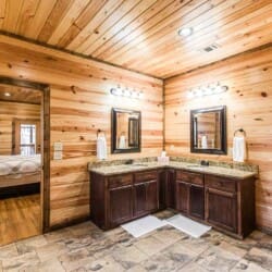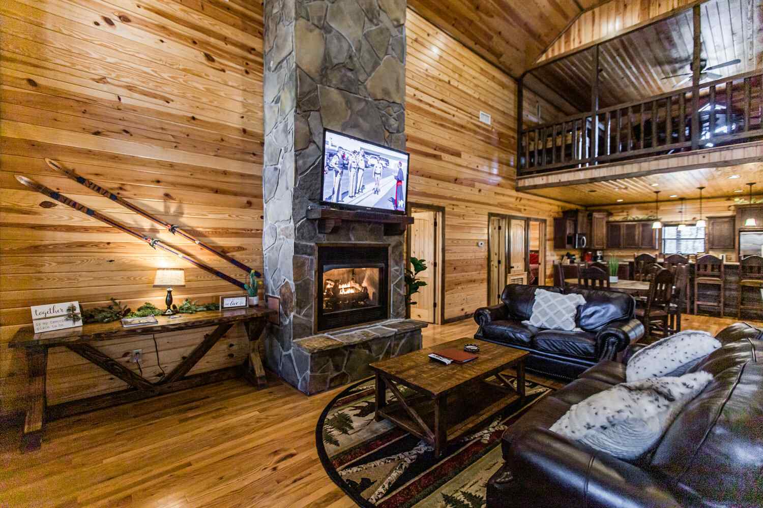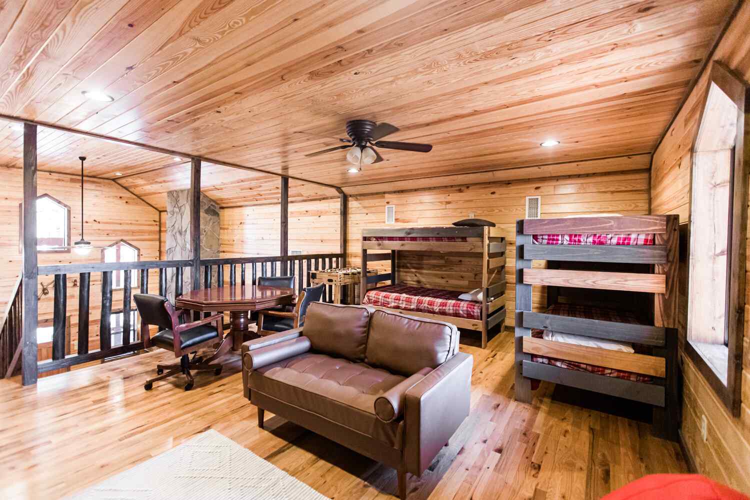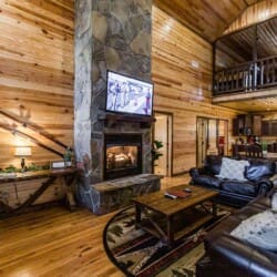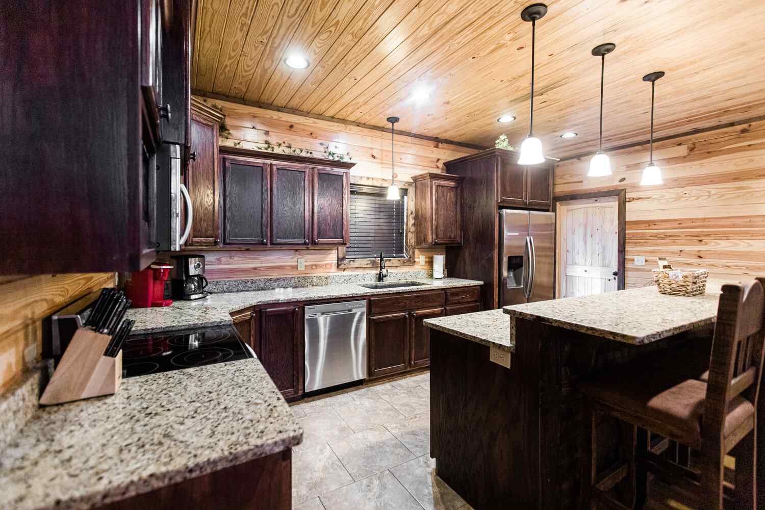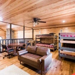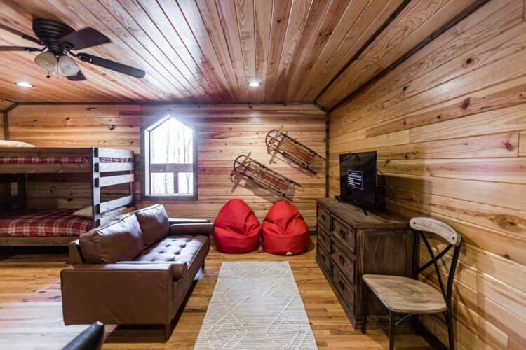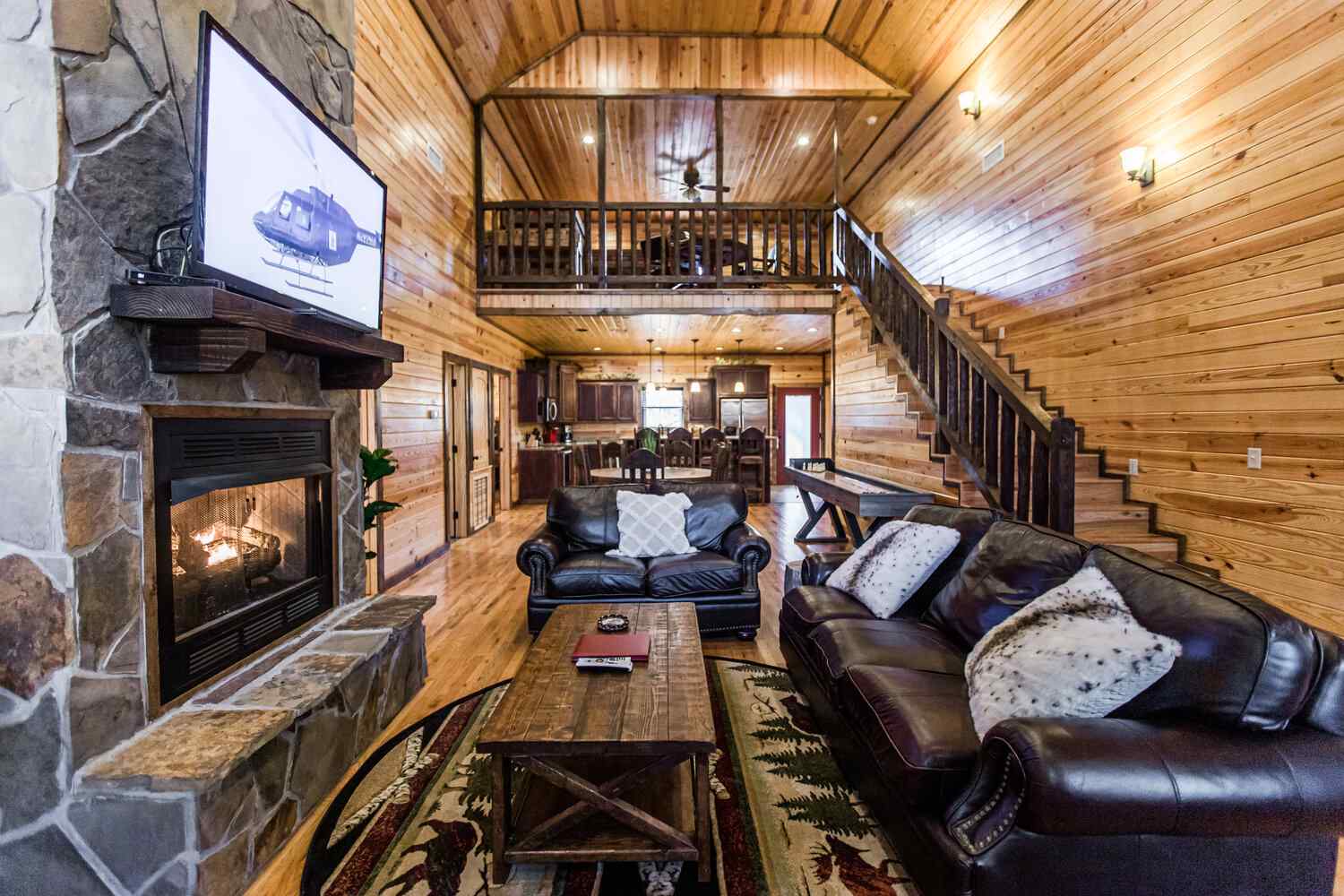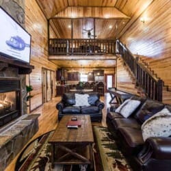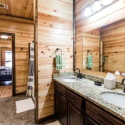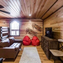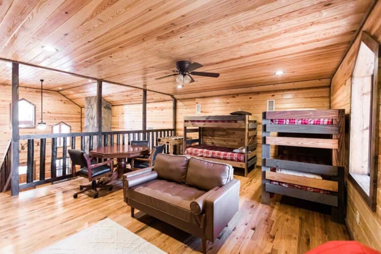 Relax in the primary bedroom with a king-size bed, a spacious bathroom with double-granite vanities, and a sizable rock-tiled shower. The two other queen bedrooms share a full bathroom with a tub-shower combination. There’s also a half-bath next to the family room and an upstairs loft with two twin-sized bunks to sleep four.