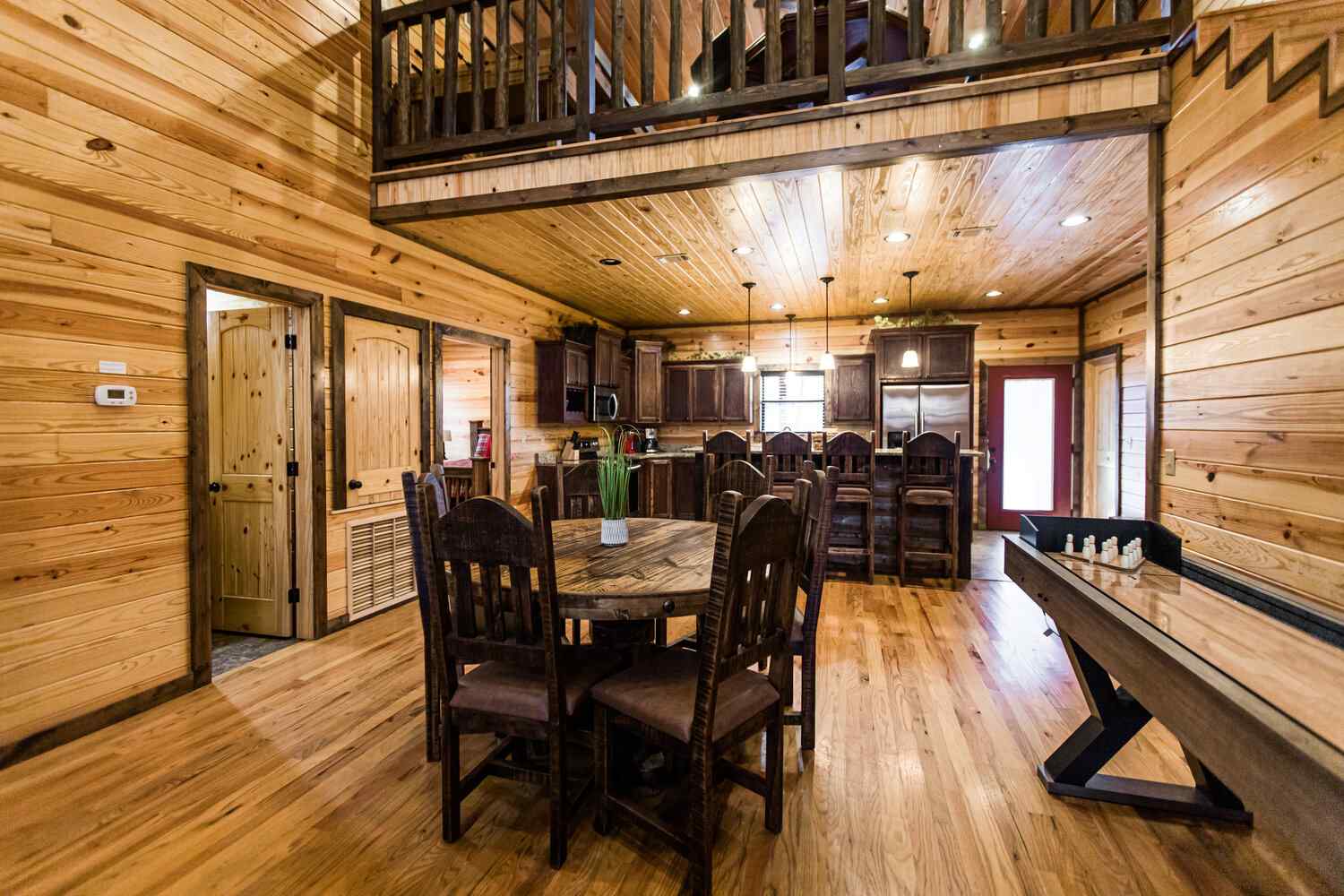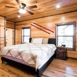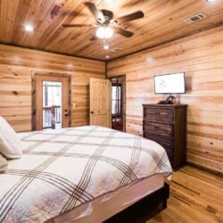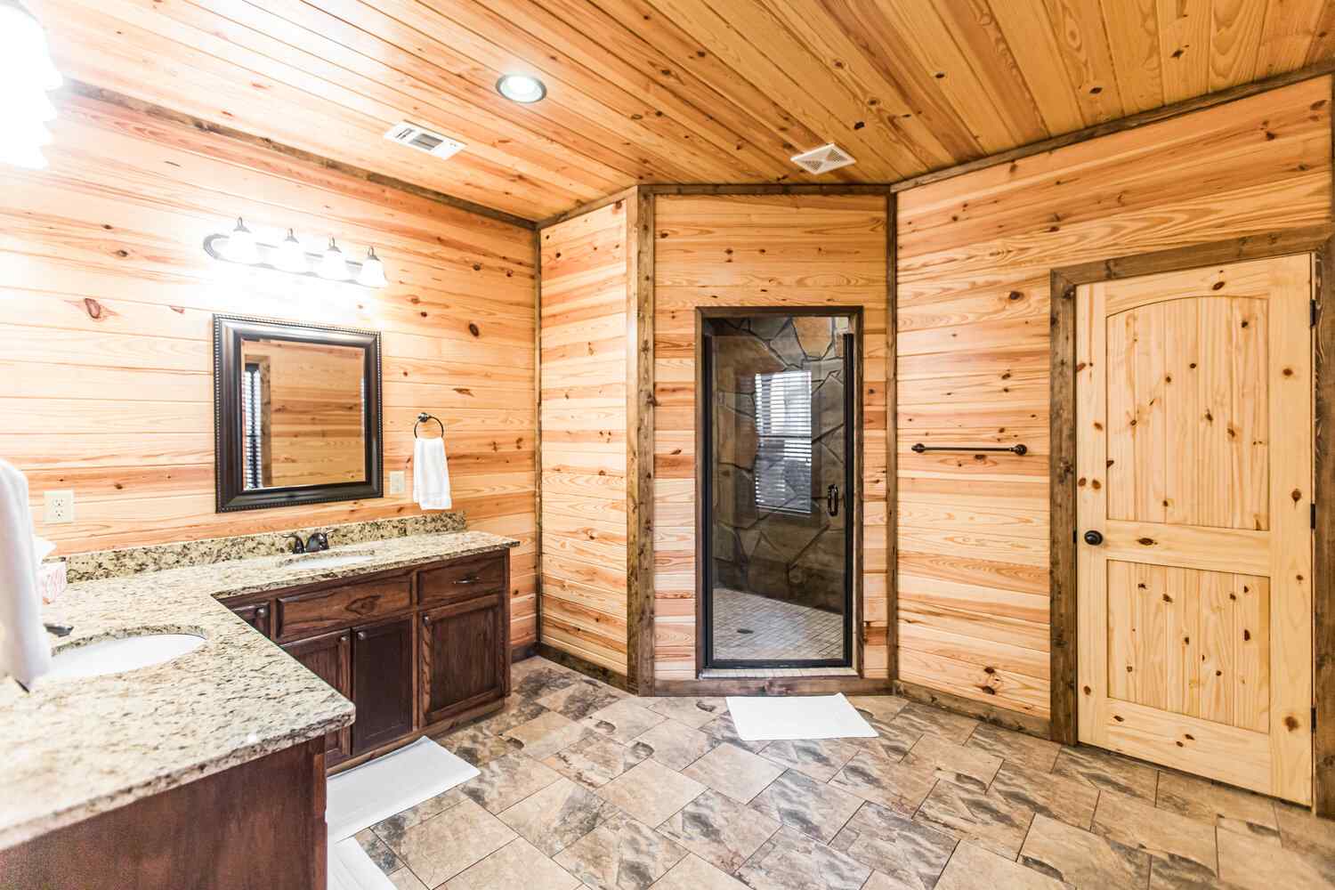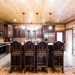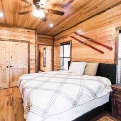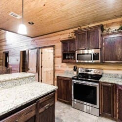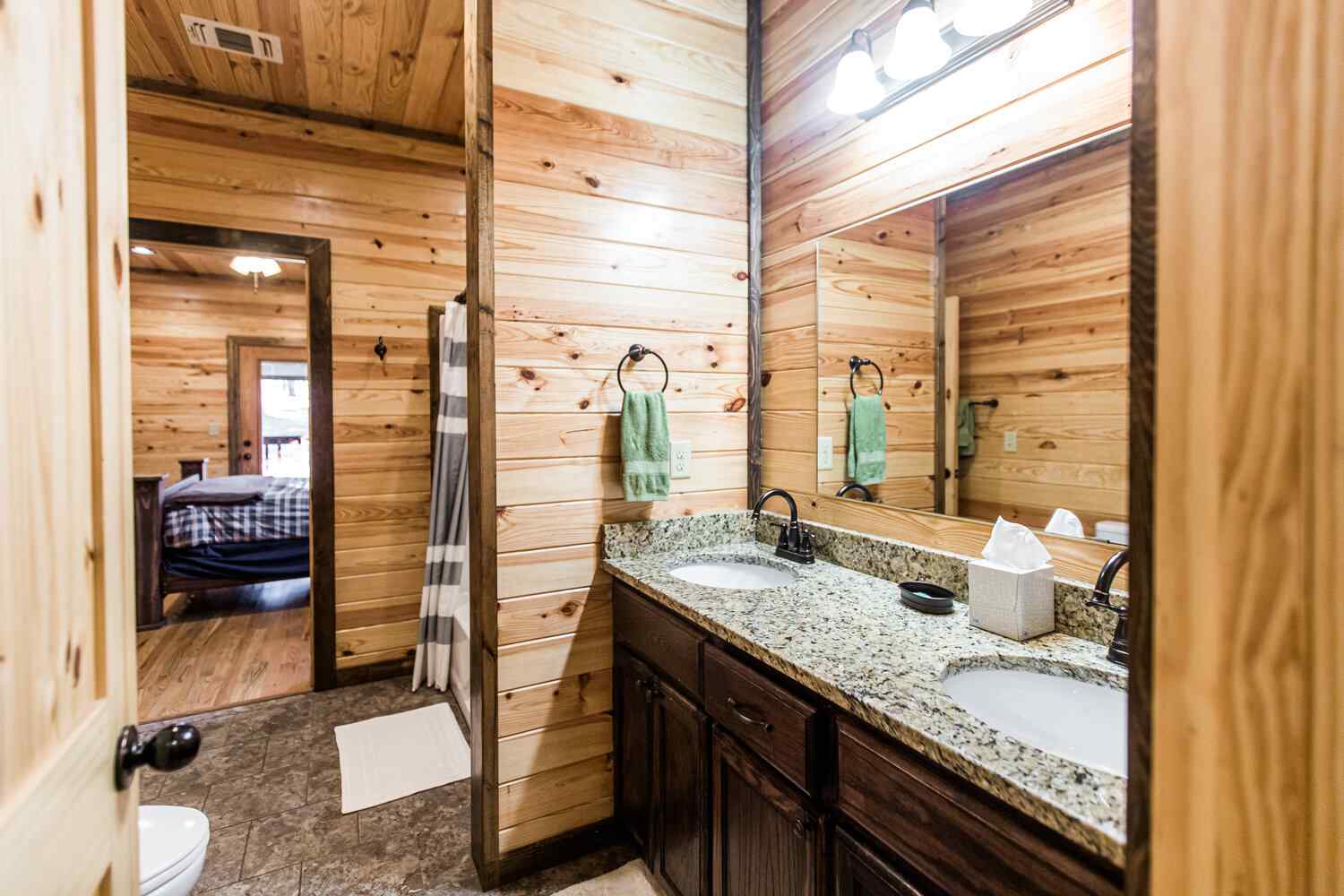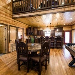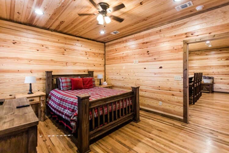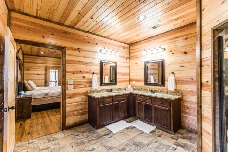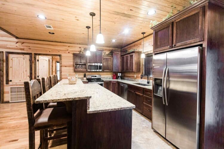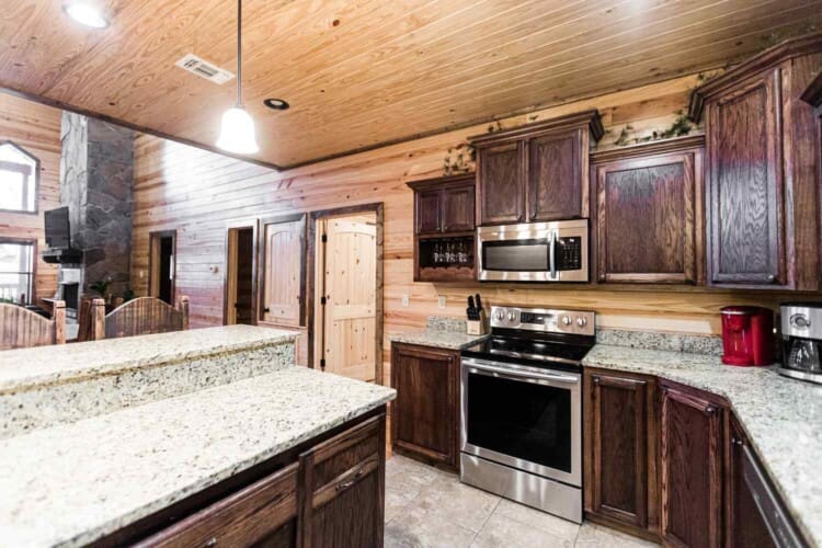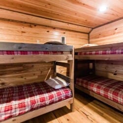 Relax in the primary bedroom with a king-size bed, a spacious bathroom with double-granite vanities, and a sizable rock-tiled shower. The two other queen bedrooms share a full bathroom with a tub-shower combination. There’s also a half-bath next to the family room and an upstairs loft with two twin-sized bunks to sleep four.