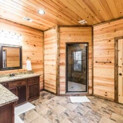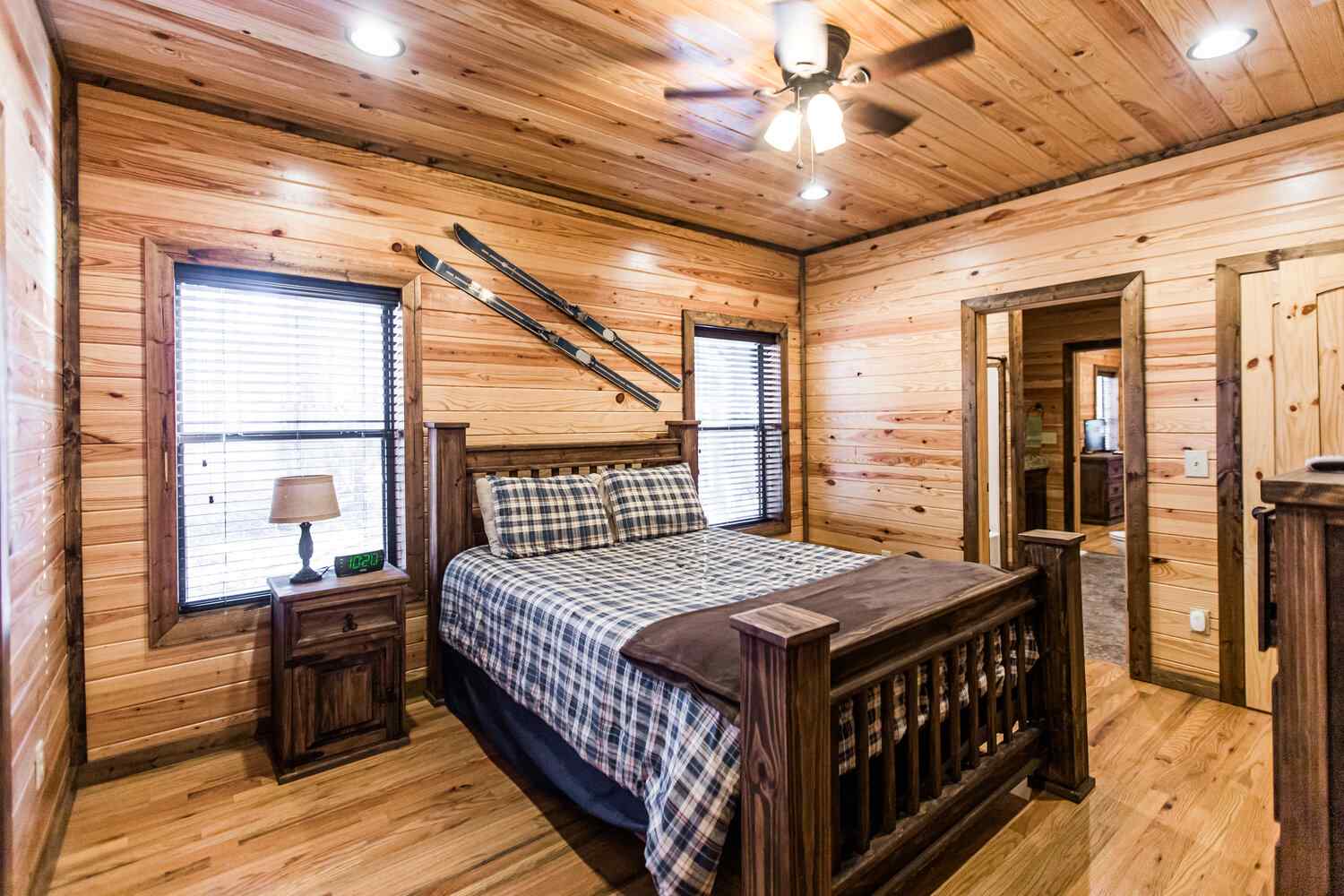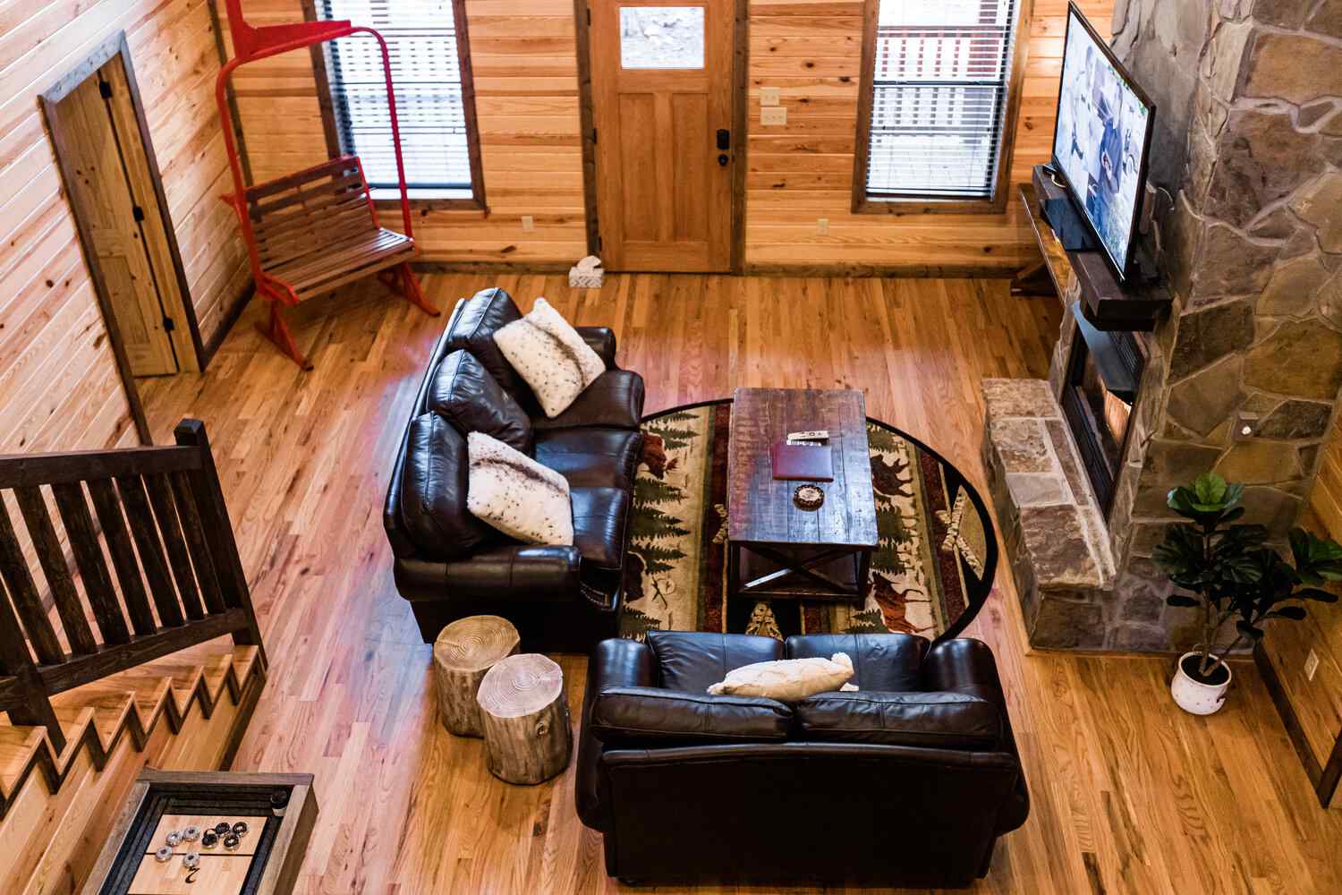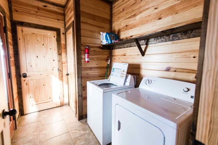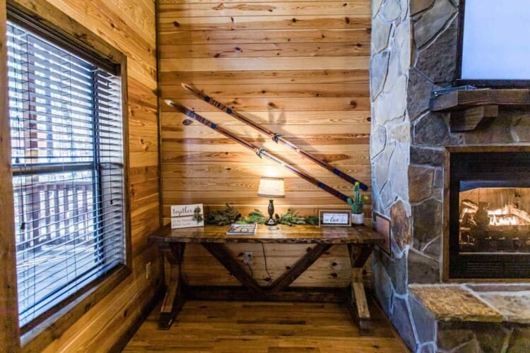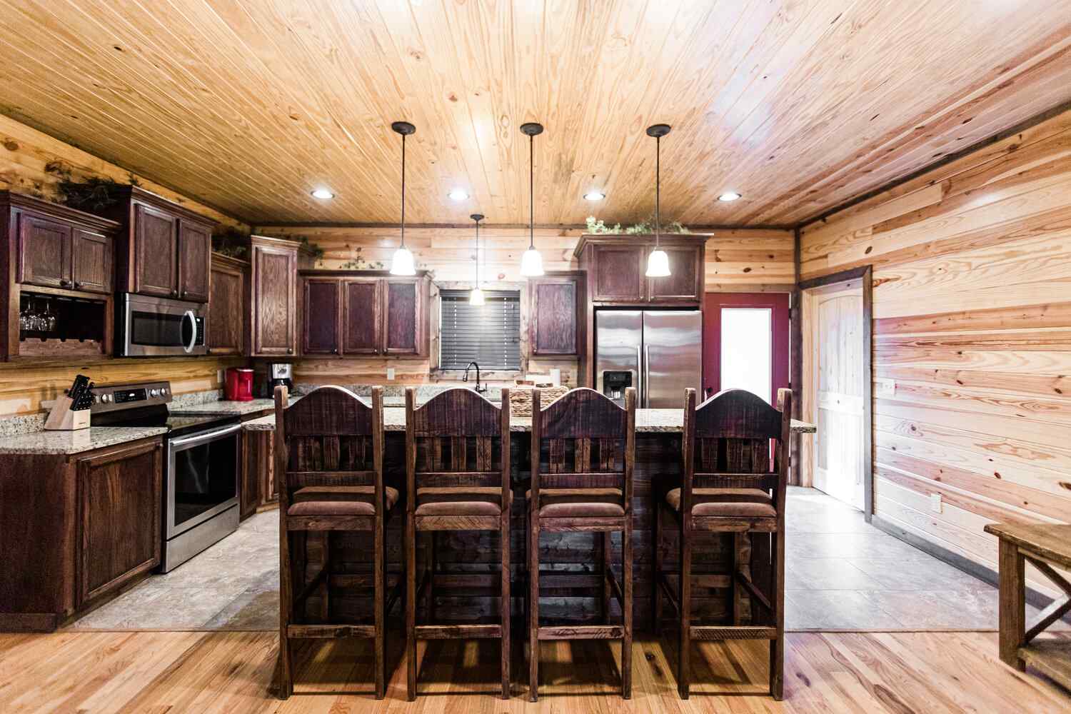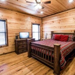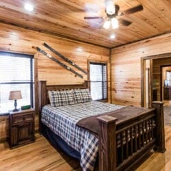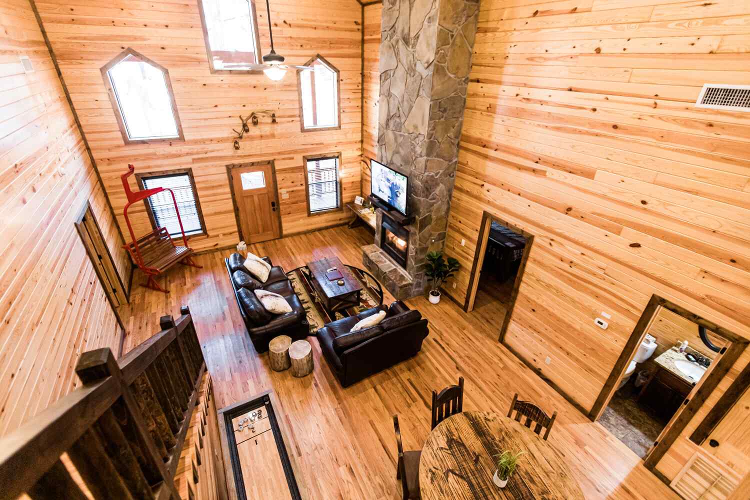 Relax in the primary bedroom with a king-size bed, a spacious bathroom with double-granite vanities, and a sizable rock-tiled shower. The two other queen bedrooms share a full bathroom with a tub-shower combination. There’s also a half-bath next to the family room and an upstairs loft with two twin-sized bunks to sleep four.