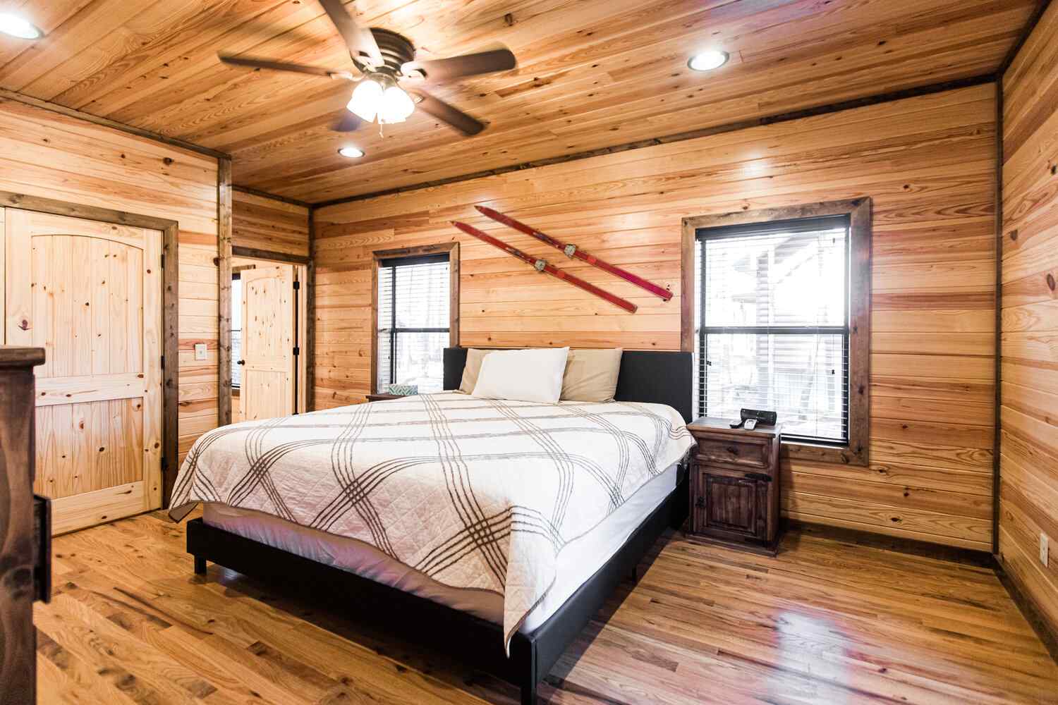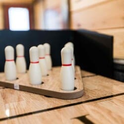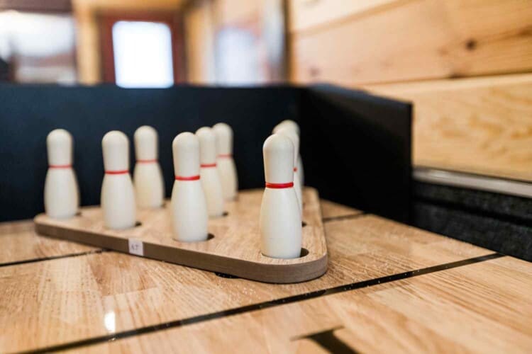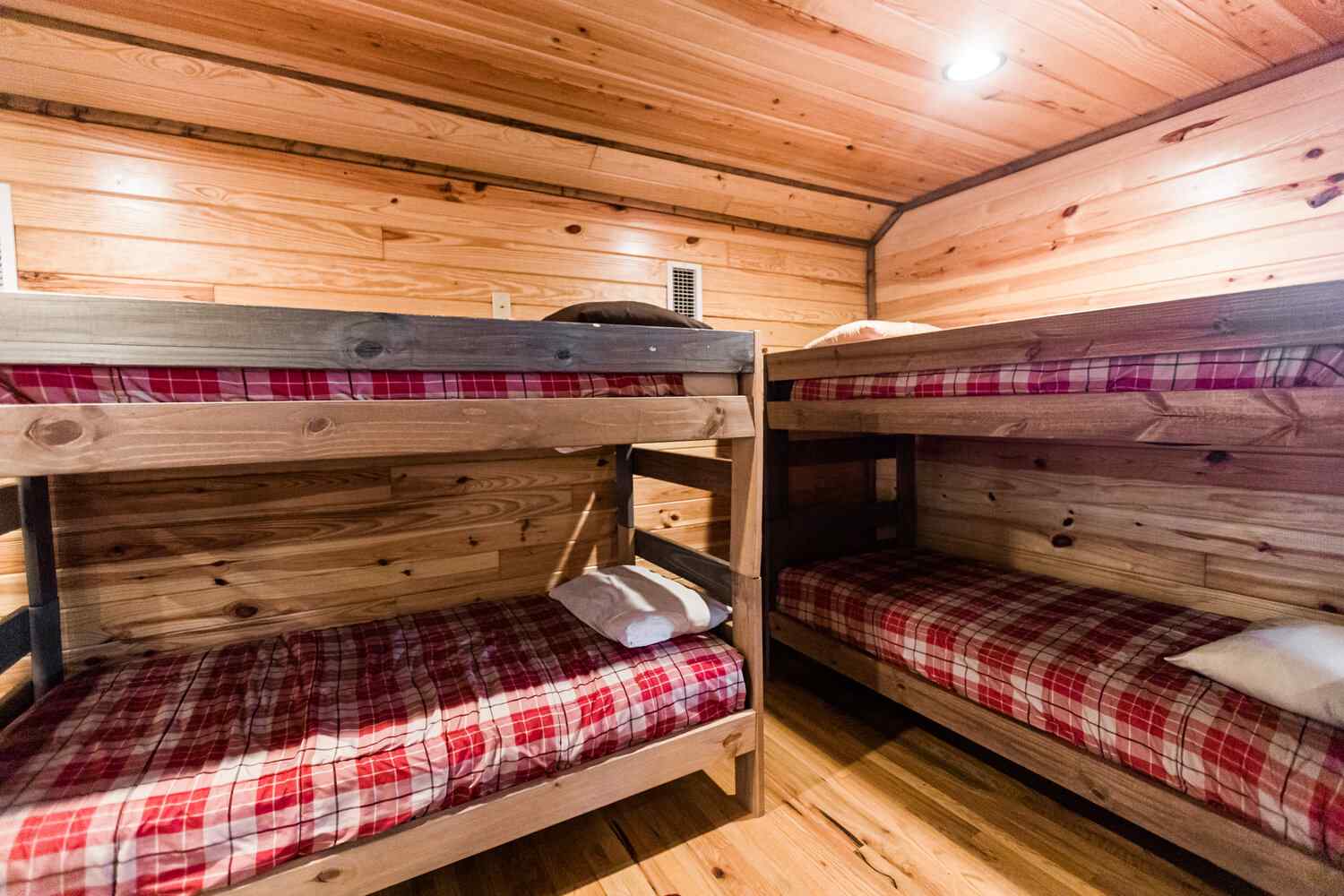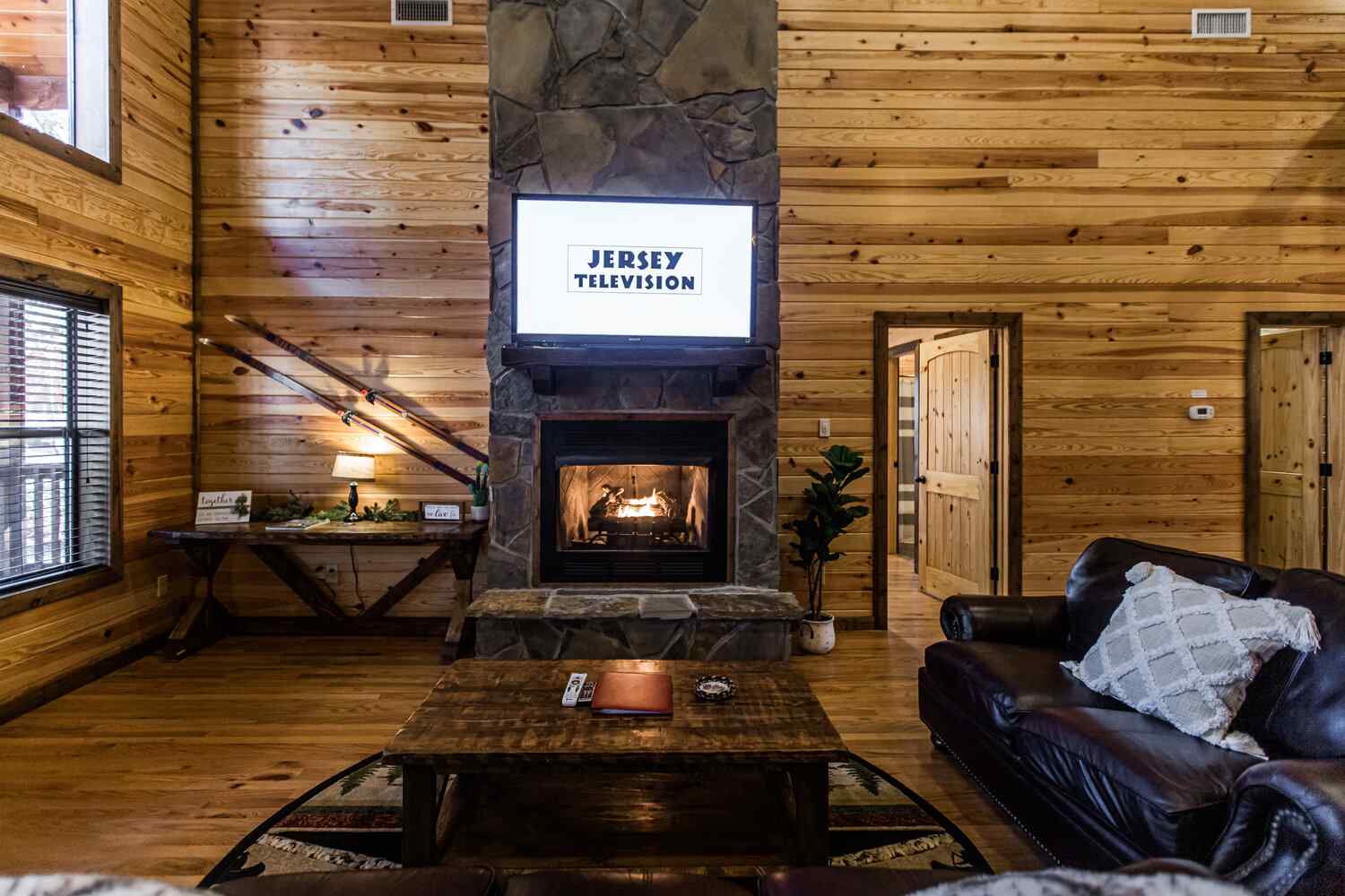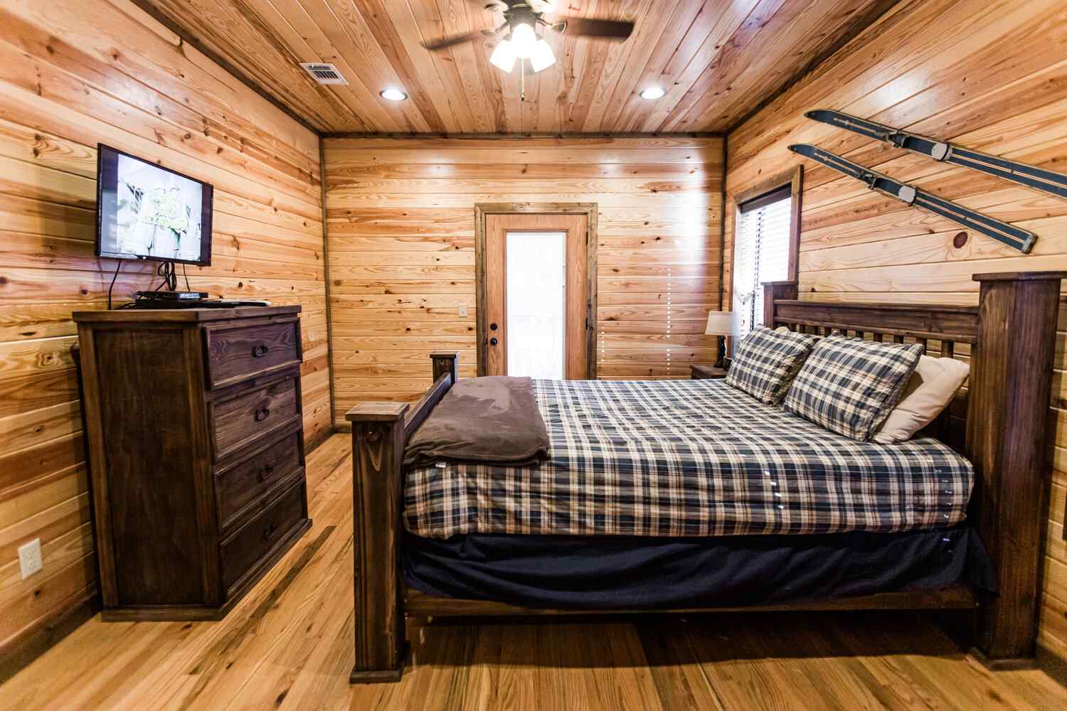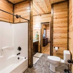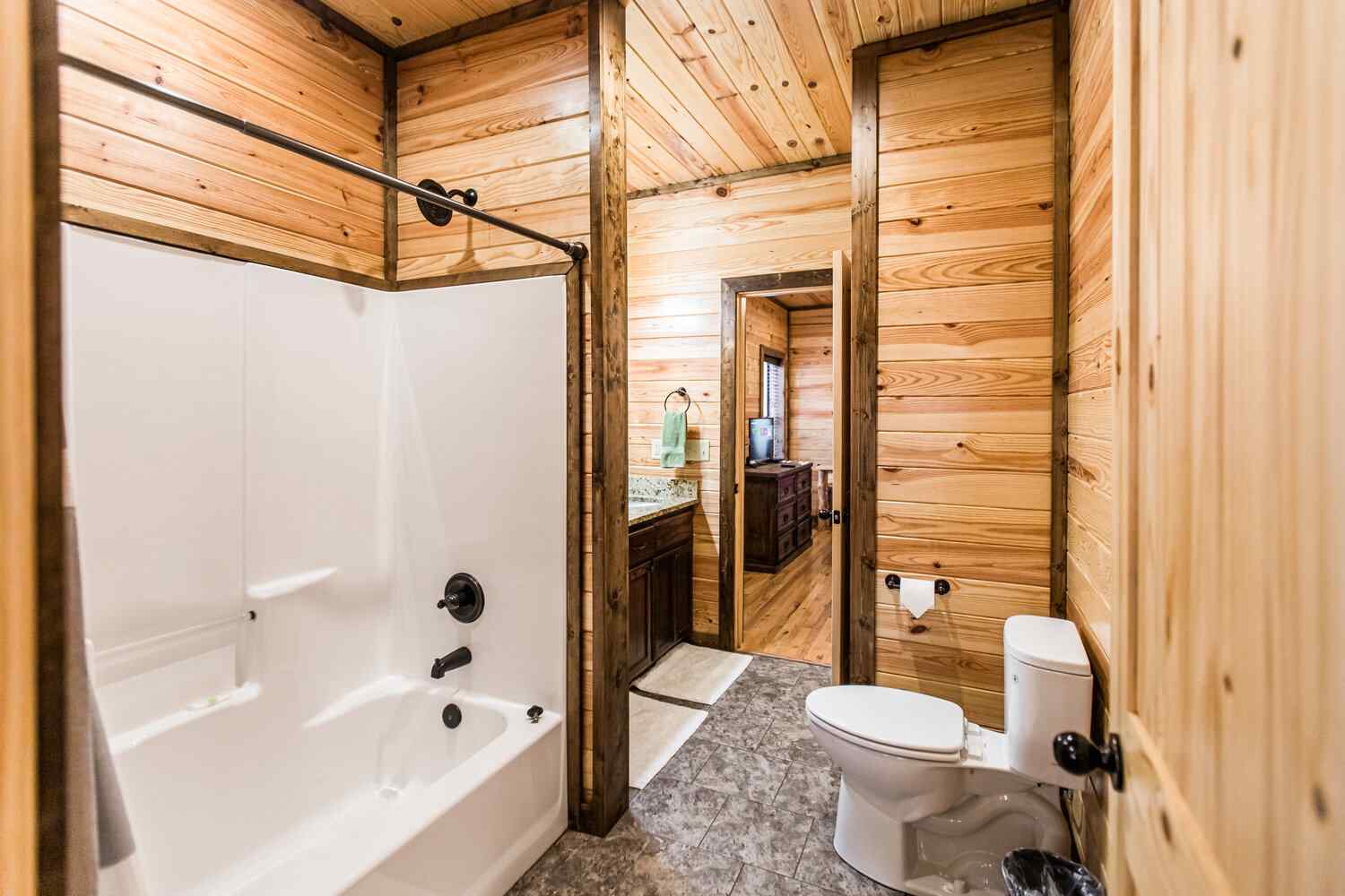 Relax in the primary bedroom with a king-size bed, a spacious bathroom with double-granite vanities, and a sizable rock-tiled shower. The two other queen bedrooms share a full bathroom with a tub-shower combination. There’s also a half-bath next to the family room and an upstairs loft with two twin-sized bunks to sleep four.