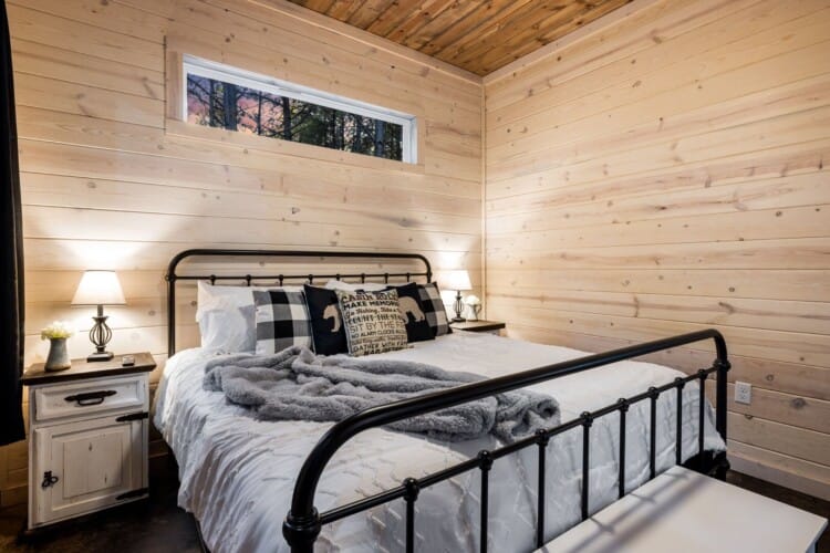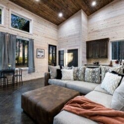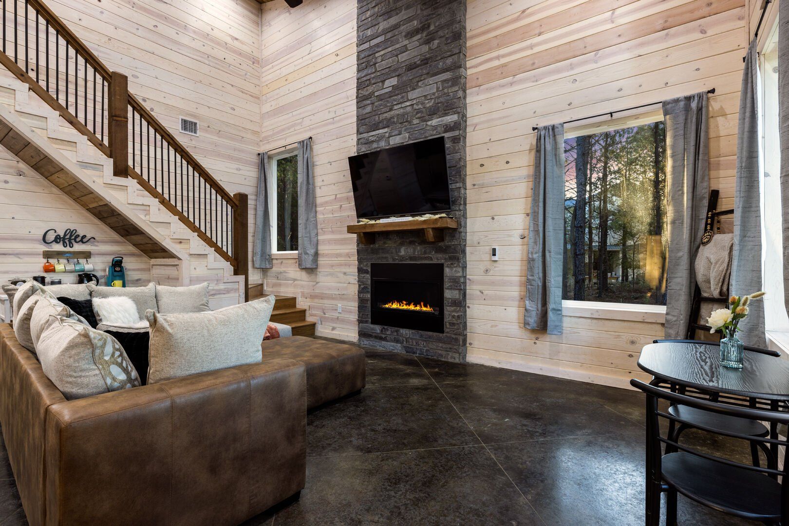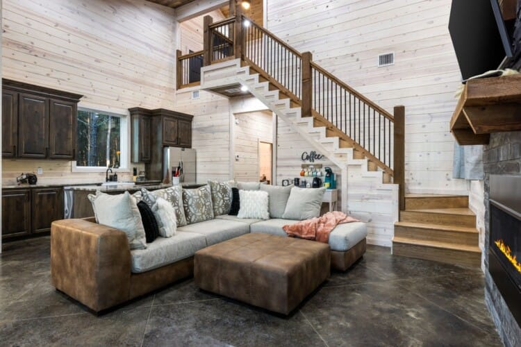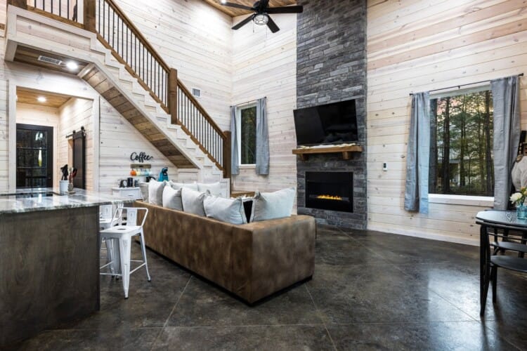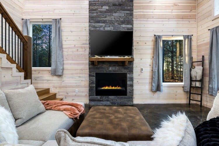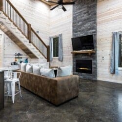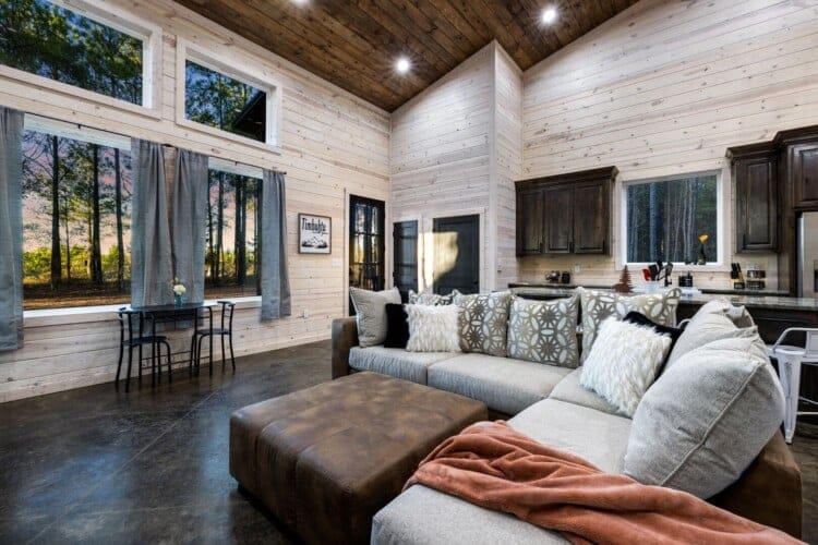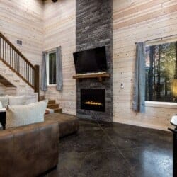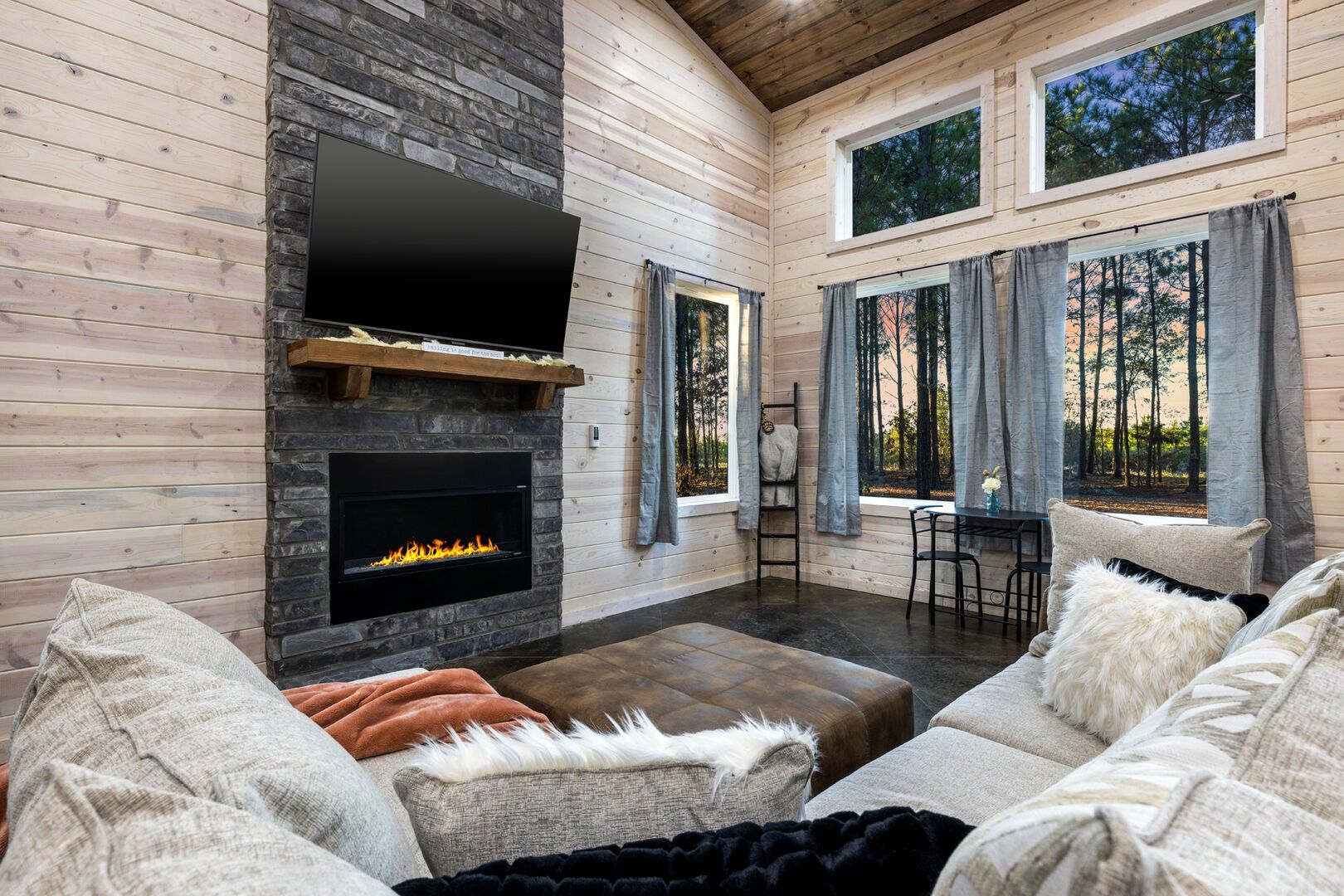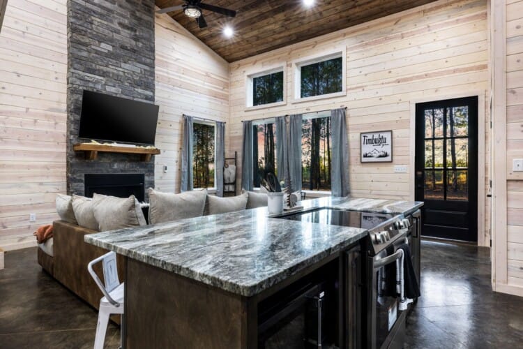 Inside Timbuktu With You, the open living space is filled with natural light from tall windows that stretch up toward high ceilings. There’s a soft, comfortable couch positioned perfectly in front of the fireplace, making it the coziest spot in the house during cooler mornings or crisp fall nights. Whether you’re watching a movie, reading a book, or just gazing out at the trees, it’s hard not to feel right at home.
