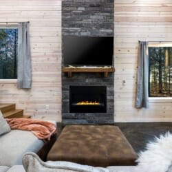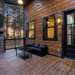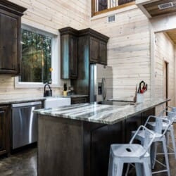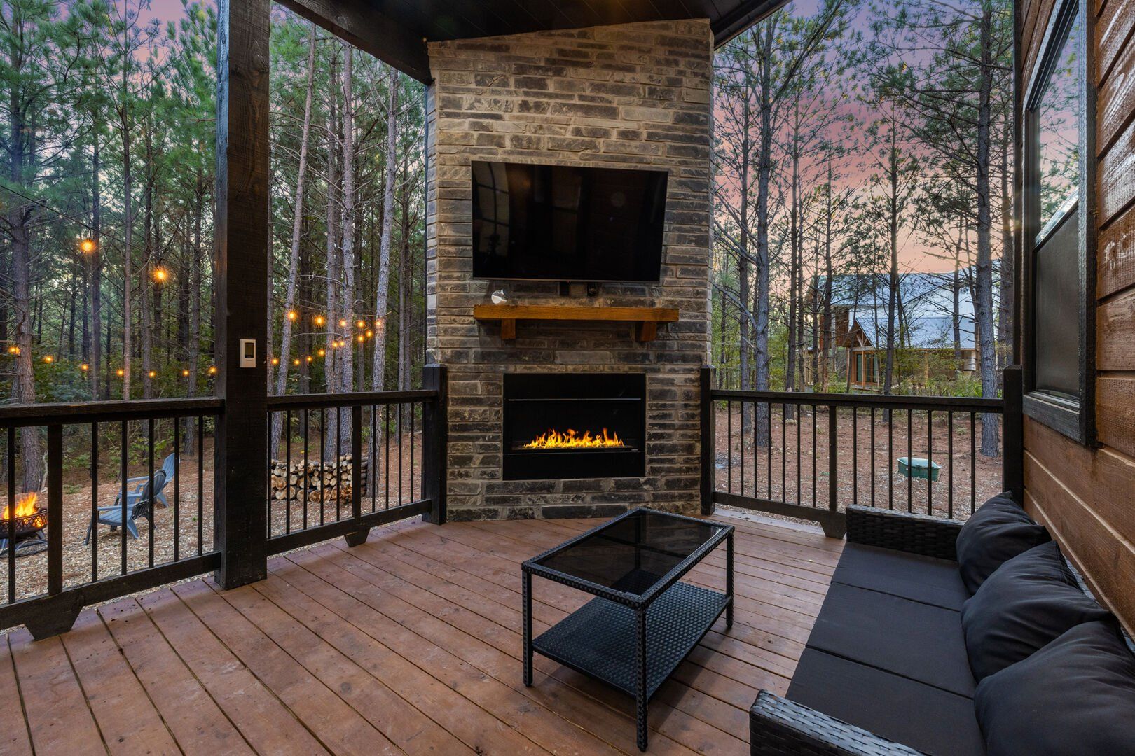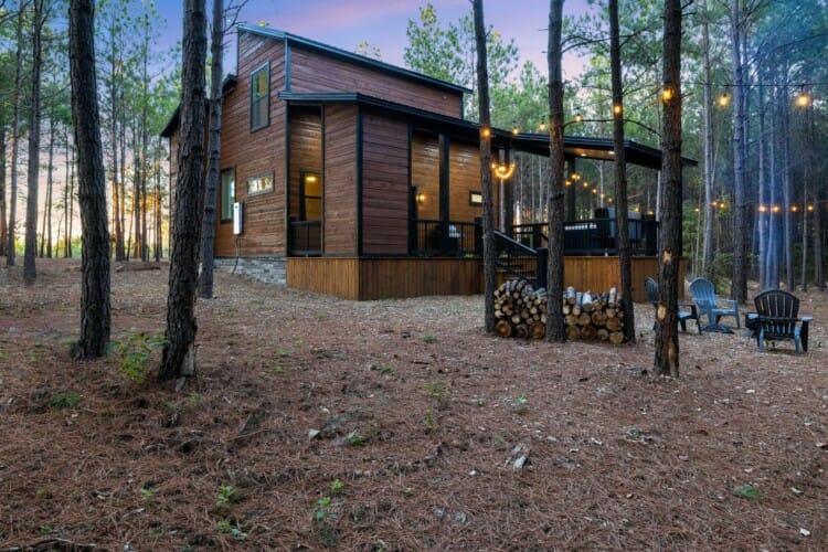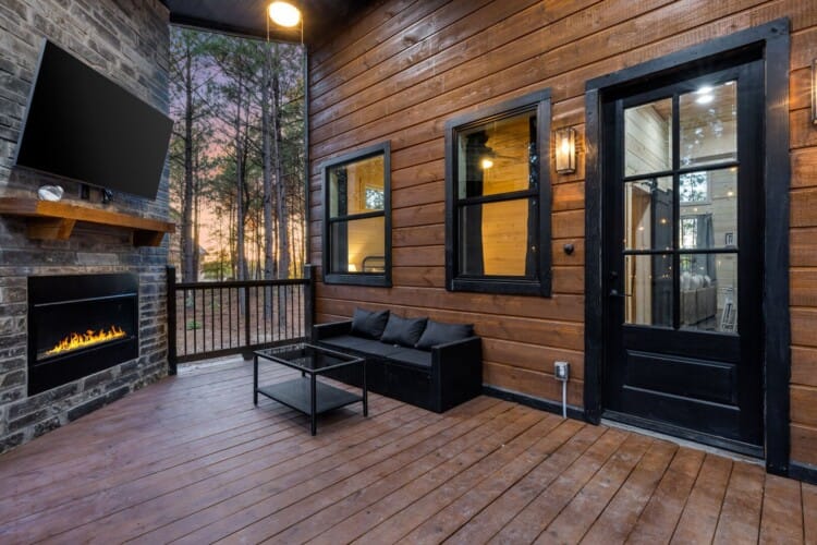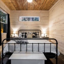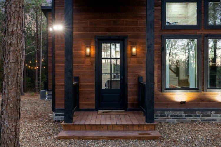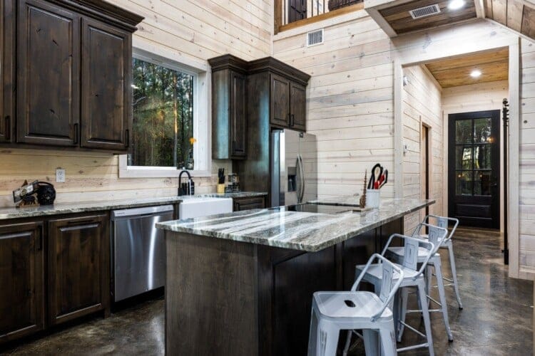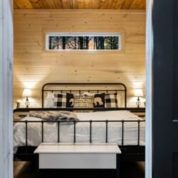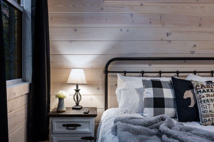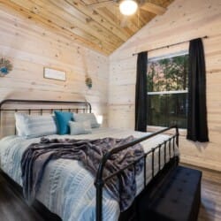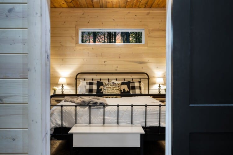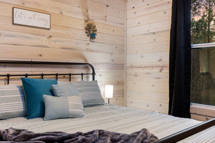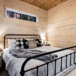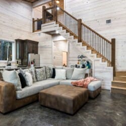 Inside Timbuktu With You, the open living space is filled with natural light from tall windows that stretch up toward high ceilings. There’s a soft, comfortable couch positioned perfectly in front of the fireplace, making it the coziest spot in the house during cooler mornings or crisp fall nights. Whether you’re watching a movie, reading a book, or just gazing out at the trees, it’s hard not to feel right at home.