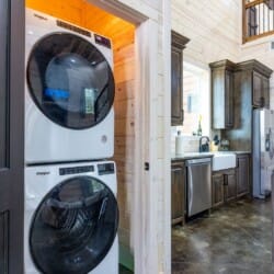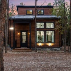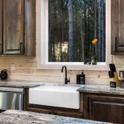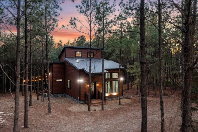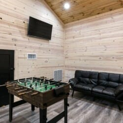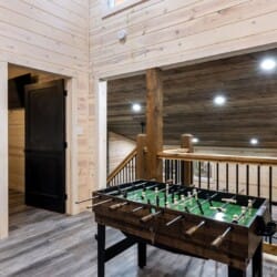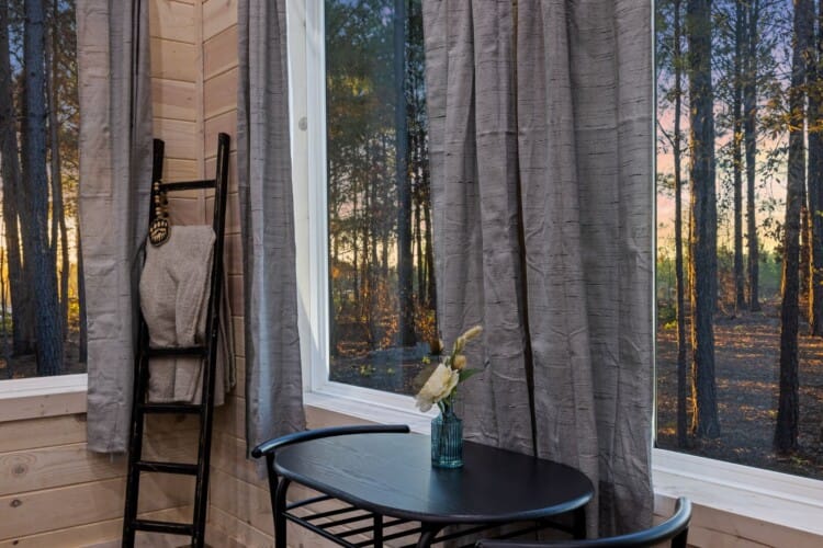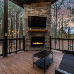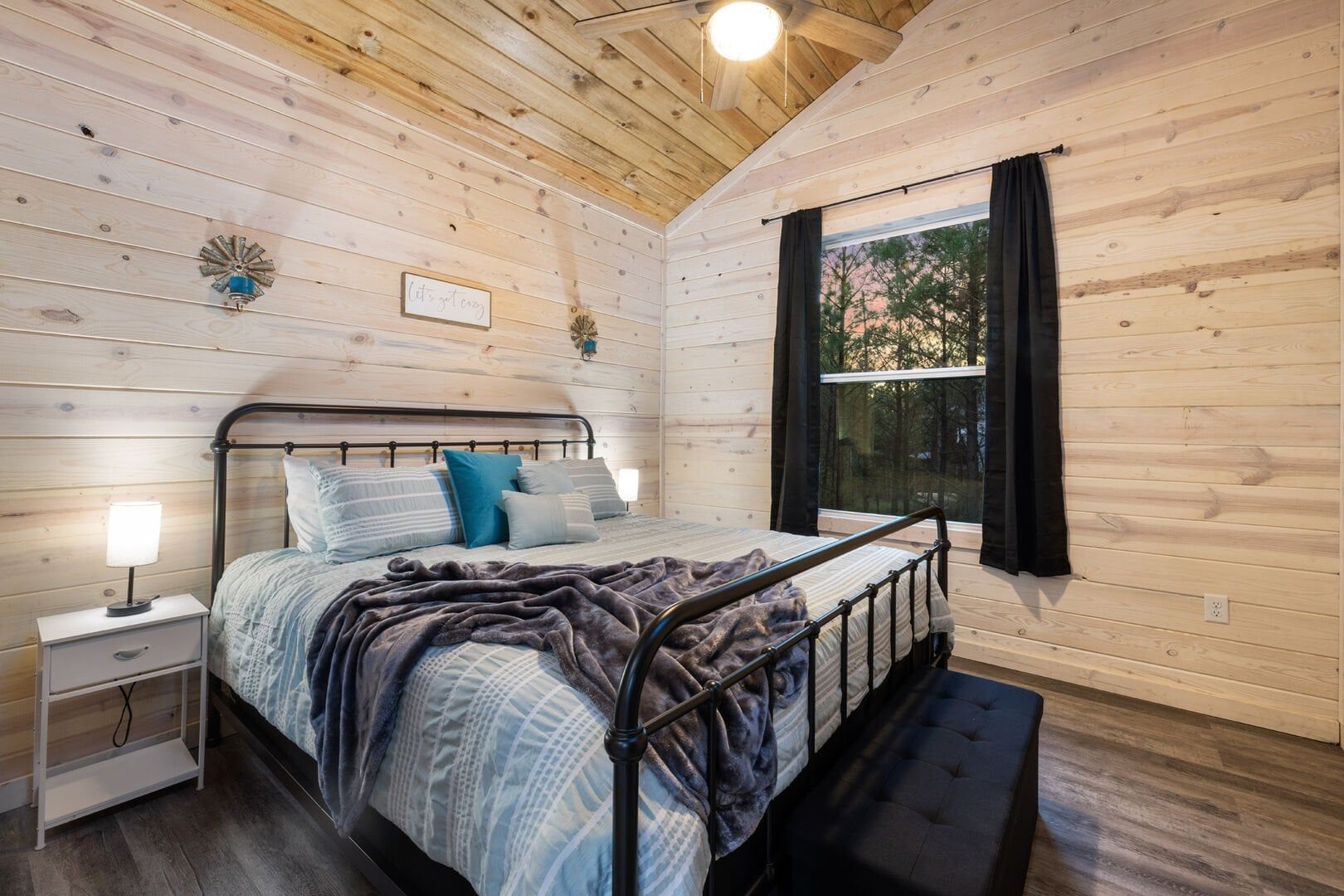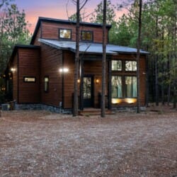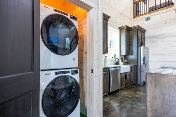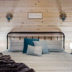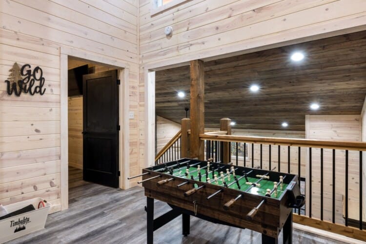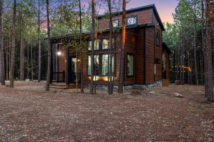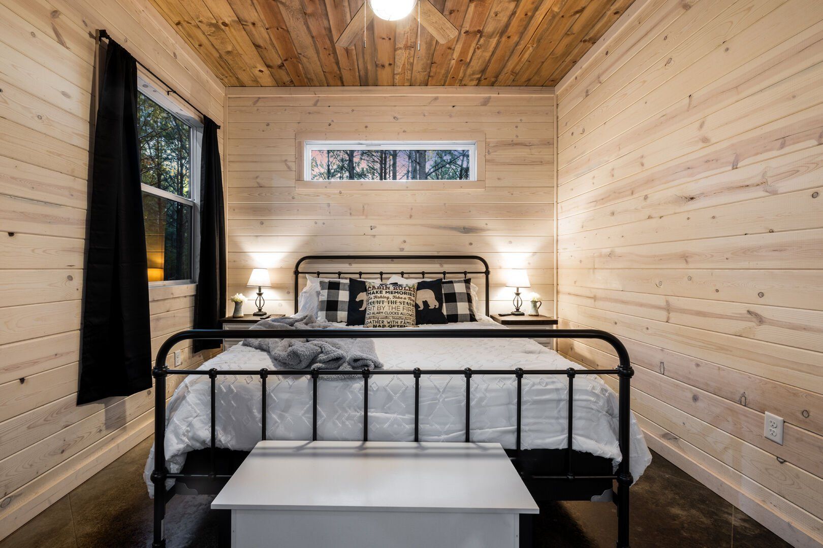 Inside Timbuktu With You, the open living space is filled with natural light from tall windows that stretch up toward high ceilings. There’s a soft, comfortable couch positioned perfectly in front of the fireplace, making it the coziest spot in the house during cooler mornings or crisp fall nights. Whether you’re watching a movie, reading a book, or just gazing out at the trees, it’s hard not to feel right at home.