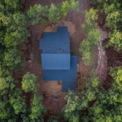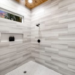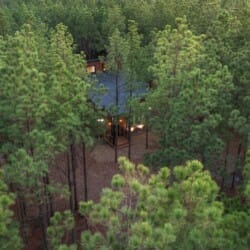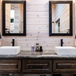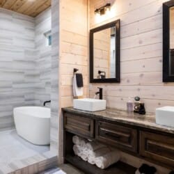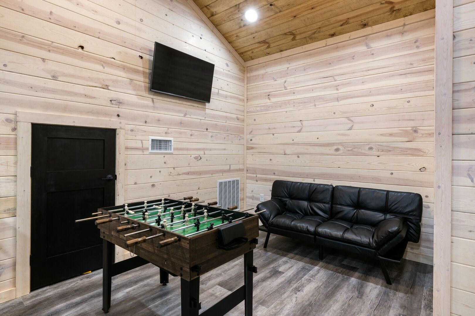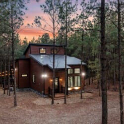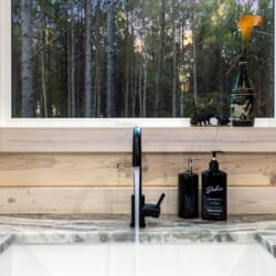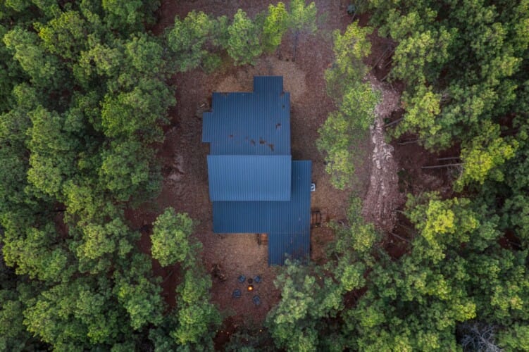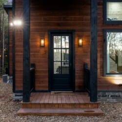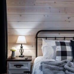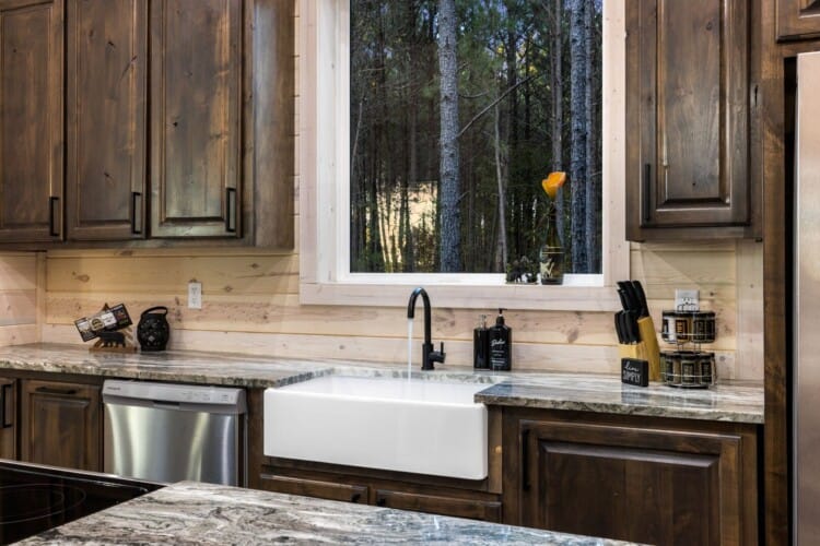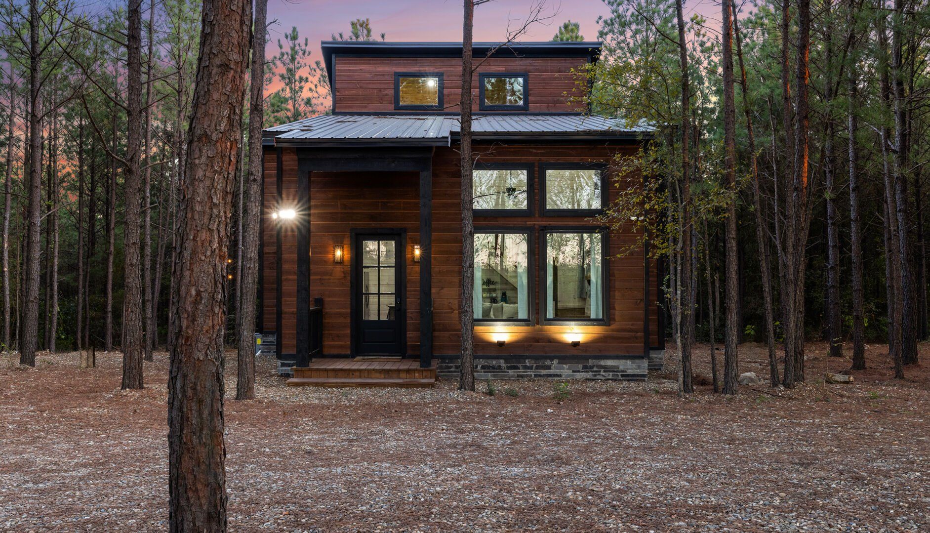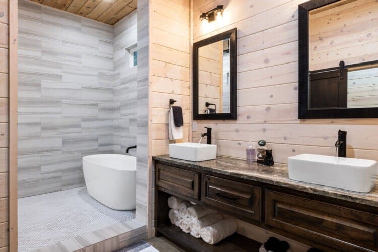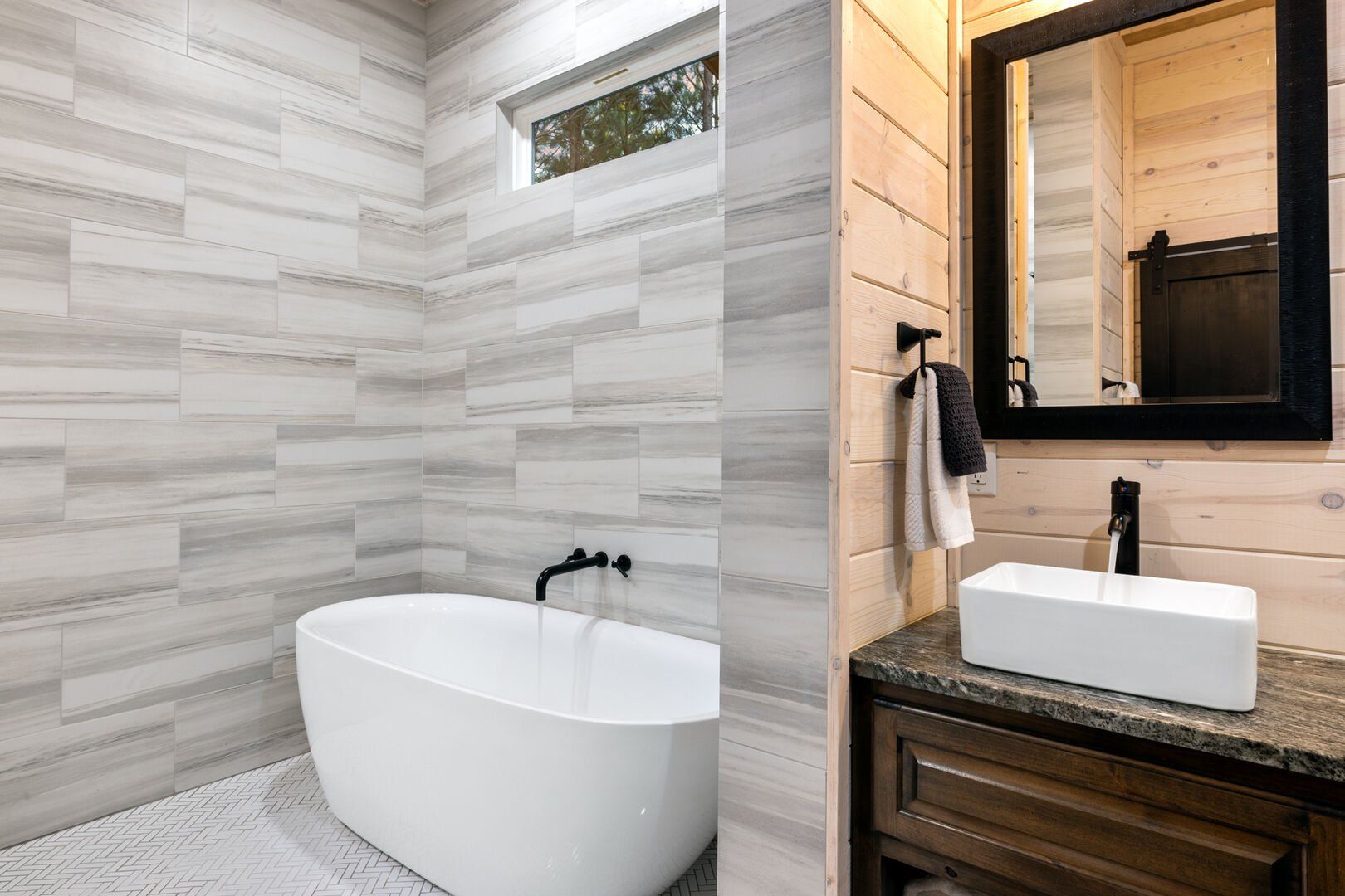 Inside Timbuktu With You, the open living space is filled with natural light from tall windows that stretch up toward high ceilings. There’s a soft, comfortable couch positioned perfectly in front of the fireplace, making it the coziest spot in the house during cooler mornings or crisp fall nights. Whether you’re watching a movie, reading a book, or just gazing out at the trees, it’s hard not to feel right at home.