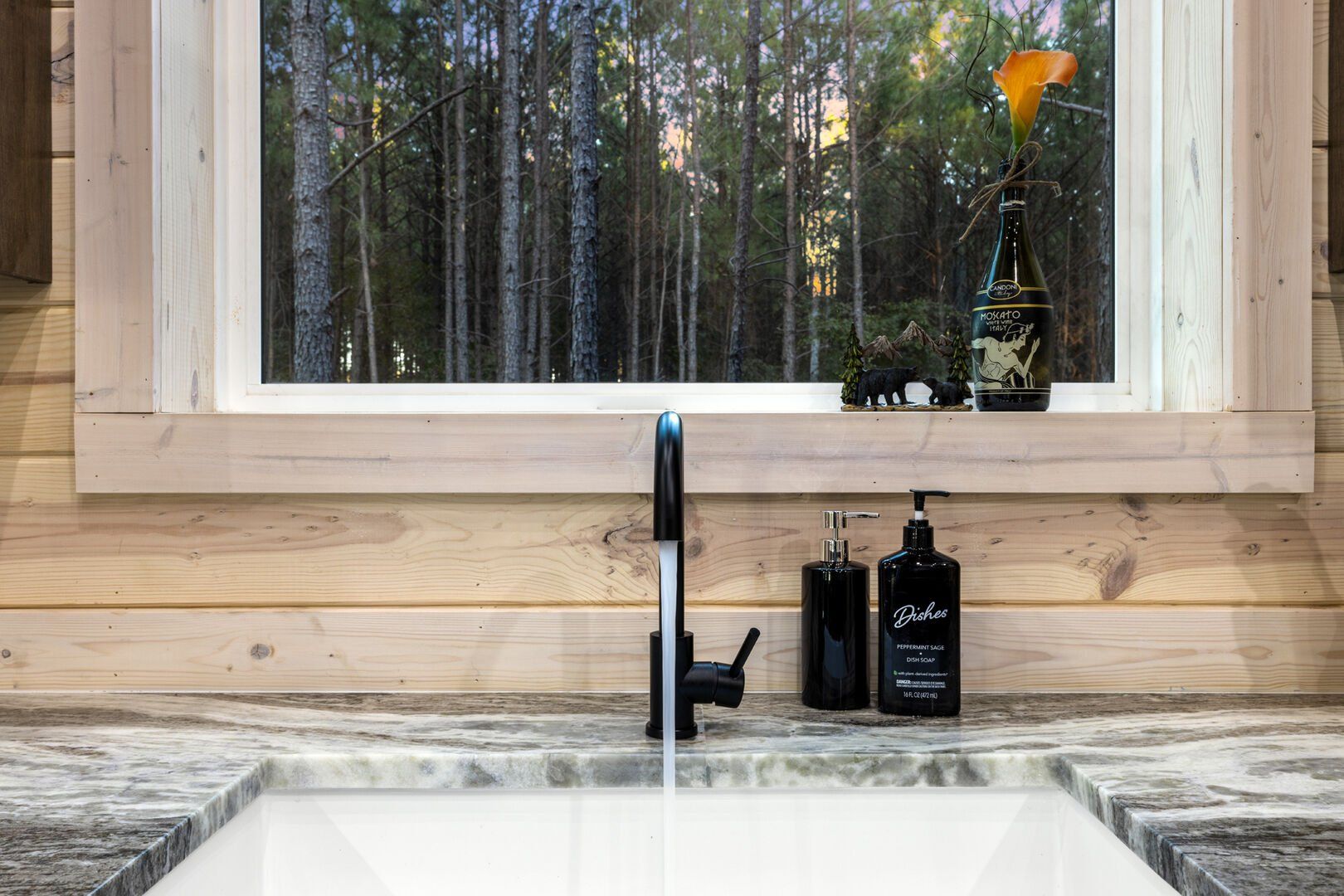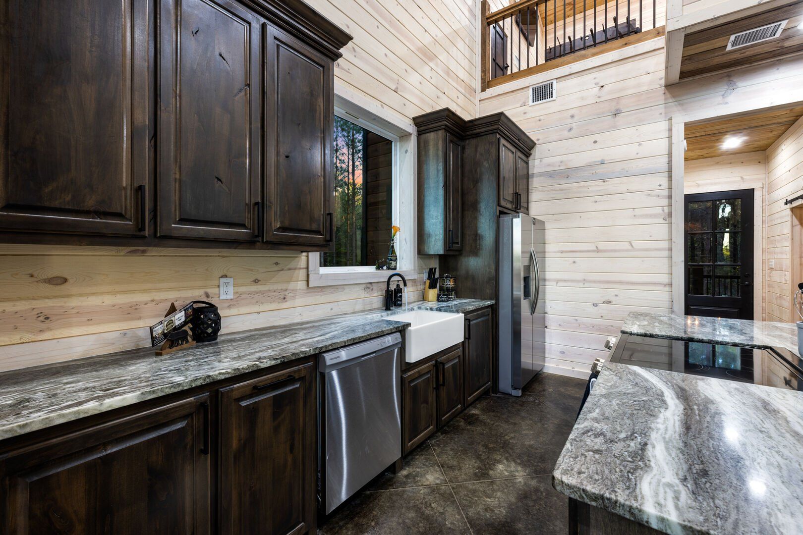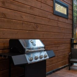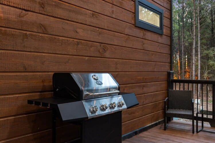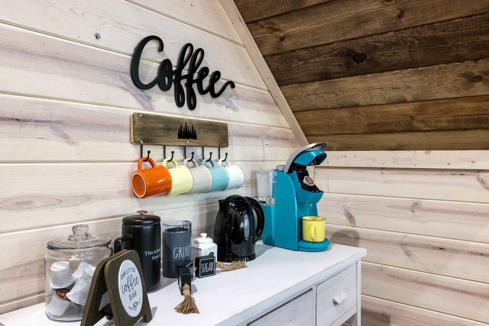 The kitchen at Timbuktu With You is not only beautiful but also completely functional. The wood cabinets and shiny stainless-steel appliances give it a clean, modern look that perfectly complements the cabin’s natural feel. You’ll find everything you need to cook a great meal, from basic pots and pans to a Keurig coffee station to start your mornings right. Enjoy breakfast or dinner at the cozy indoor table by the window or head outside and dine under the trees at the outdoor setup. Either way, the experience feels warm, simple, and personal.