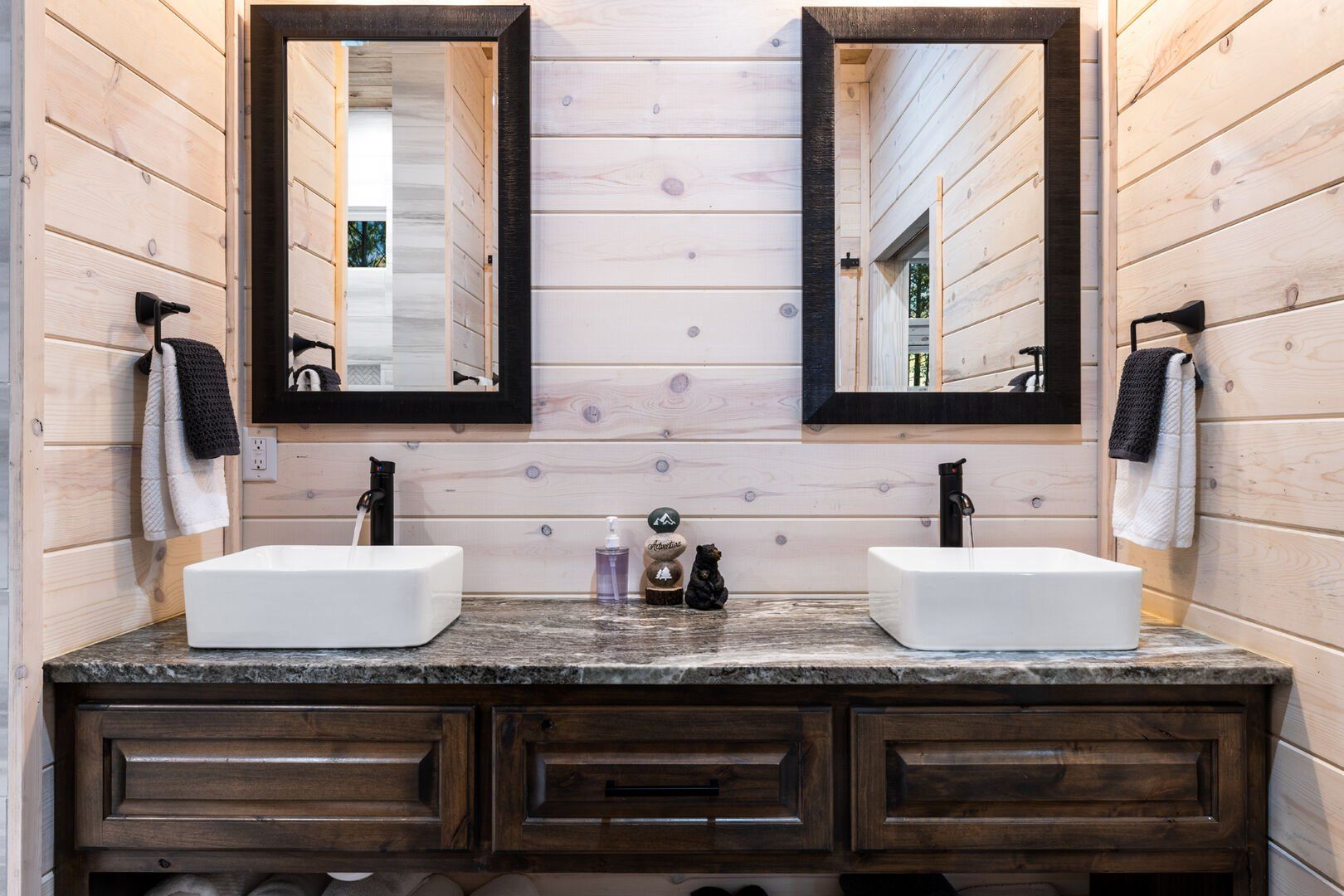 Sleeping at Timbuktu With You is quiet and comfortable. The primary bedroom features a king-sized bed and a walk-in closet, making it easy to unpack and feel settled. The second bedroom, with its queen-sized bed, is just as peaceful, perfect for kids, guests, or another couple traveling with you. The full bathroom, located directly across from the master bedroom, features a soaking tub and a walk-in shower, ensuring that whether you prefer a quick rinse or a long soak, the space is ready for either.