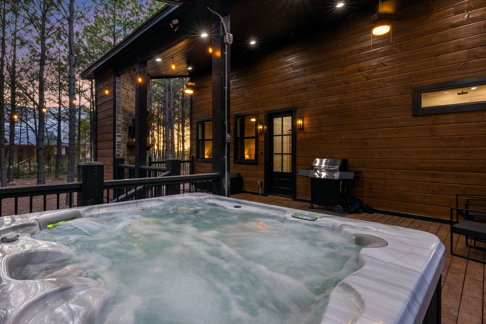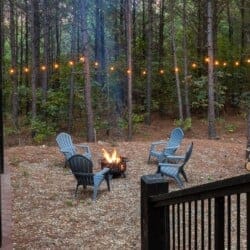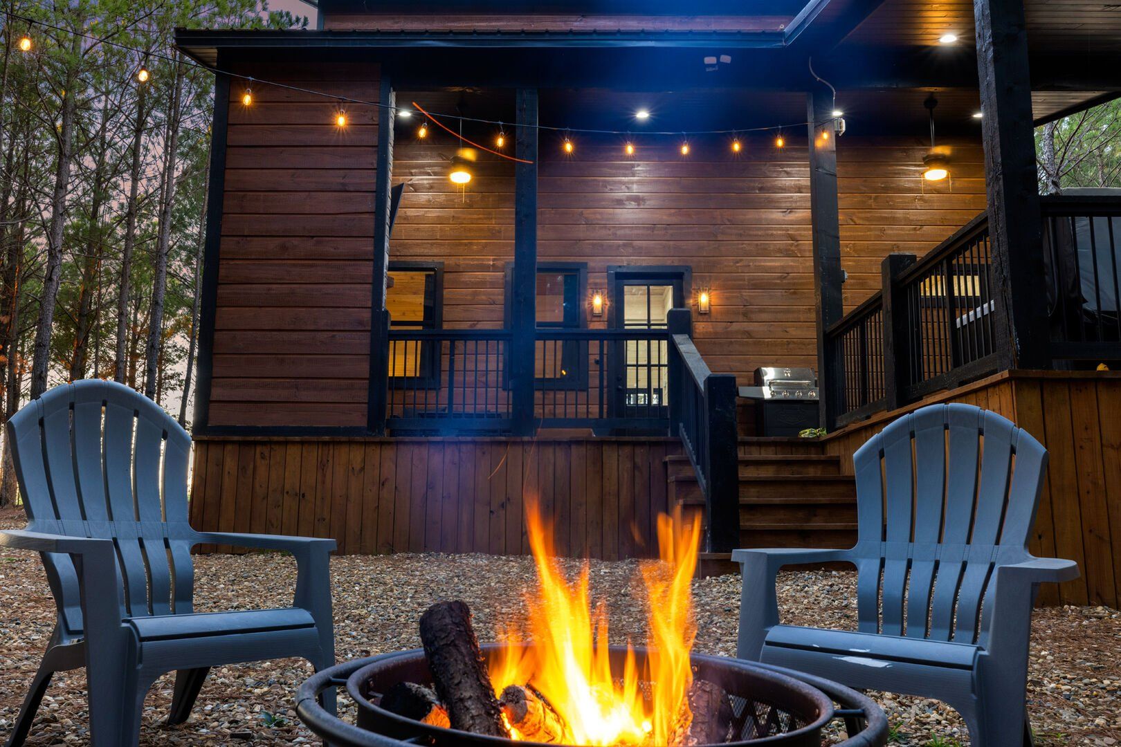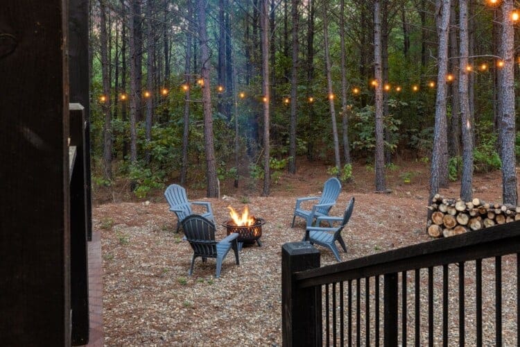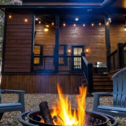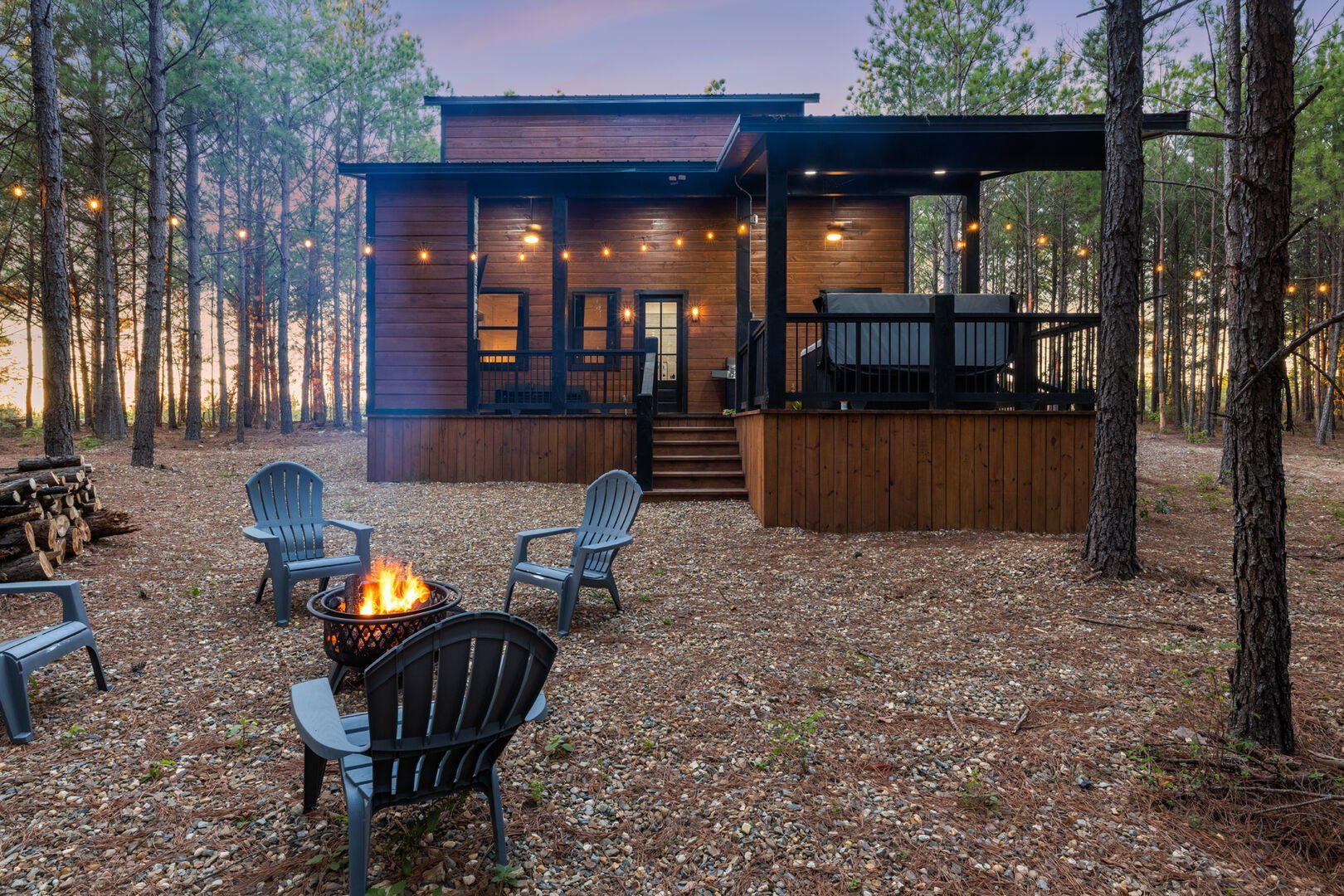 The outdoor space at Timbuktu With You is where the cabin really shines. The covered hot tub is nestled under a wooden gazebo with soft lighting, making it the perfect spot to relax at night while gazing up at the stars. There’s a fire pit surrounded by comfy chairs, ideal for sharing stories or roasting marshmallows. A large deck wraps around the cabin and gives you front-row seats to the stillness and beauty of the forest. Every corner feels peaceful and private, allowing you to unwind without distraction.