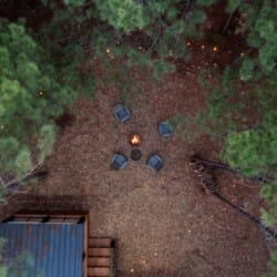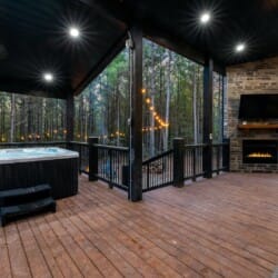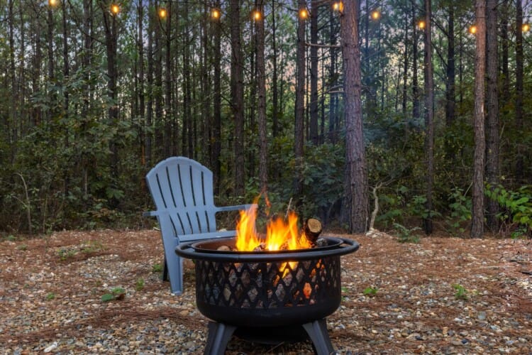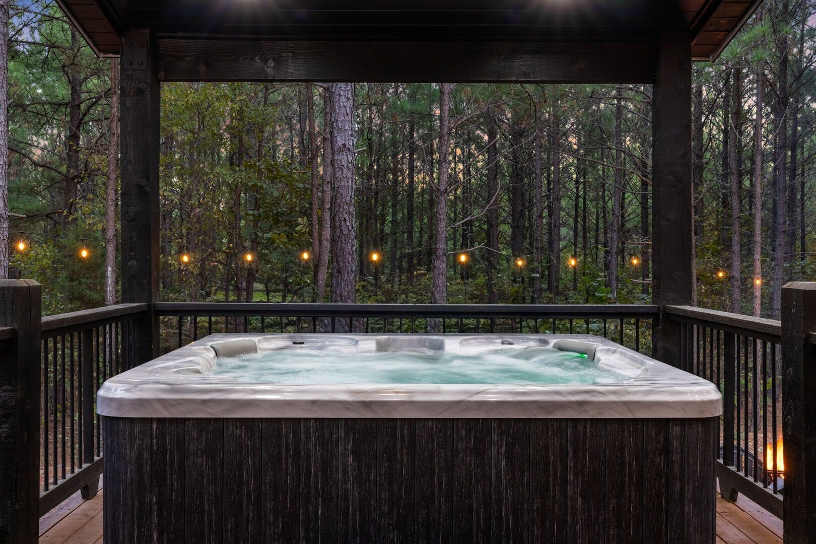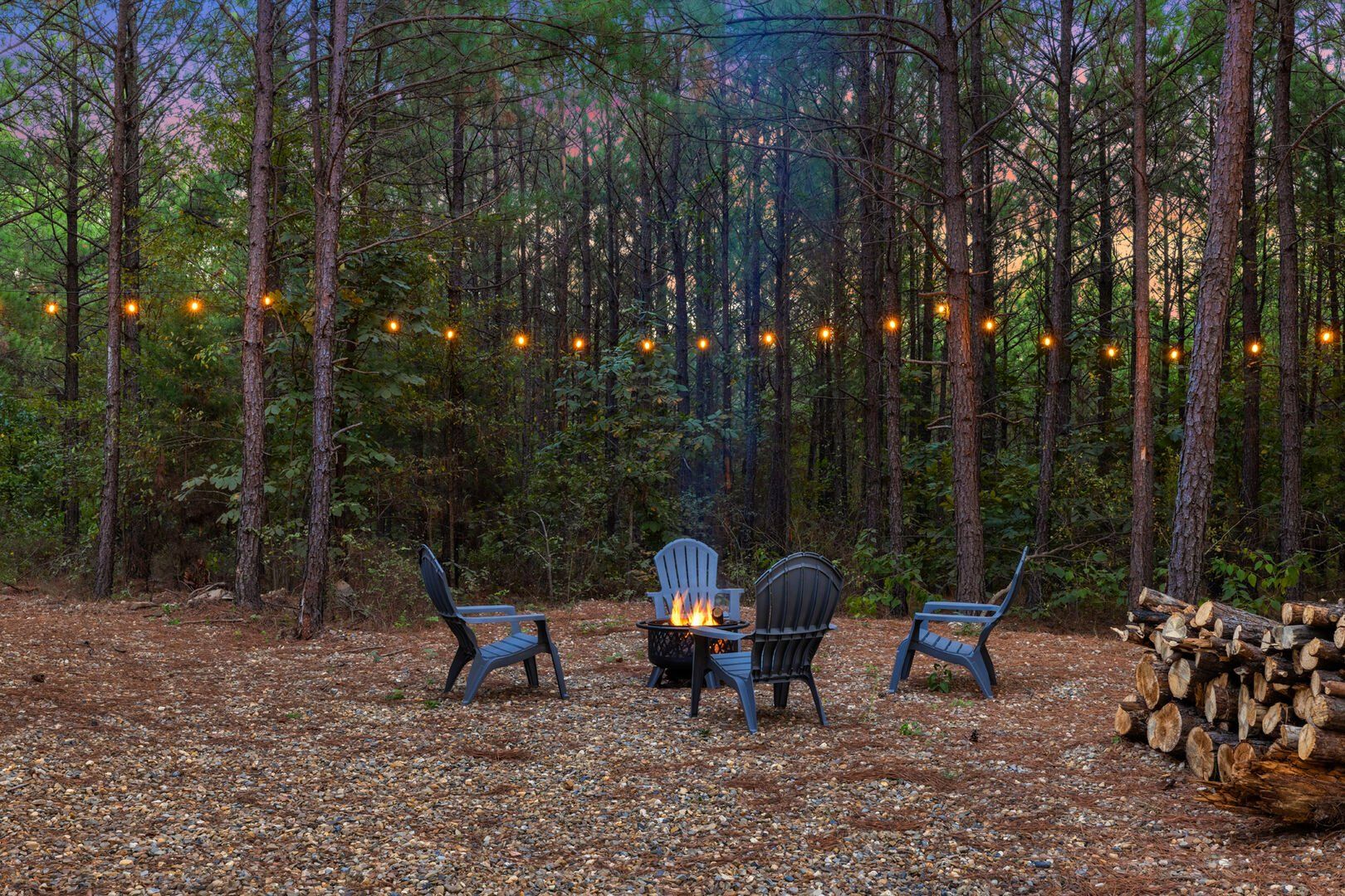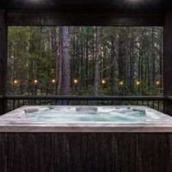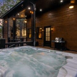 The outdoor space at Timbuktu With You is where the cabin really shines. The covered hot tub is nestled under a wooden gazebo with soft lighting, making it the perfect spot to relax at night while gazing up at the stars. There’s a fire pit surrounded by comfy chairs, ideal for sharing stories or roasting marshmallows. A large deck wraps around the cabin and gives you front-row seats to the stillness and beauty of the forest. Every corner feels peaceful and private, allowing you to unwind without distraction.