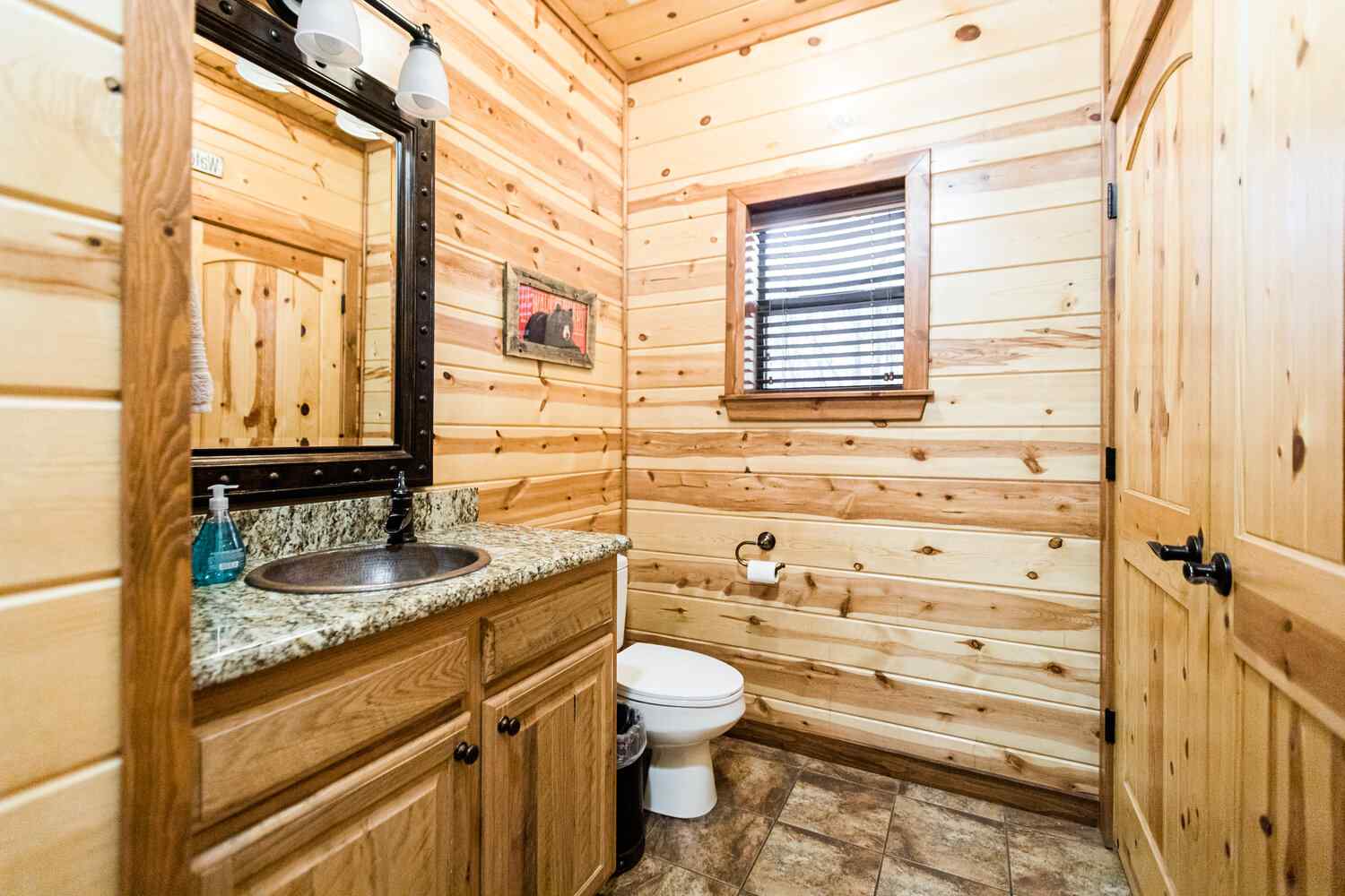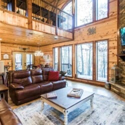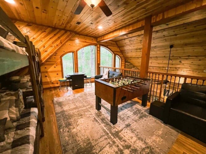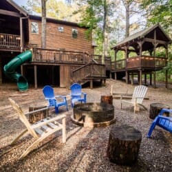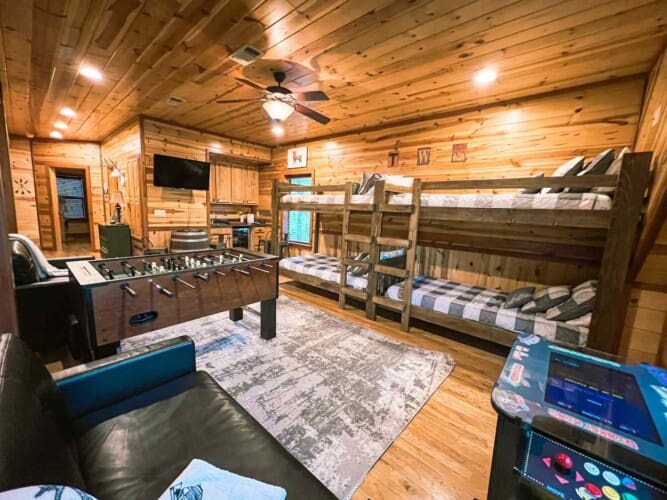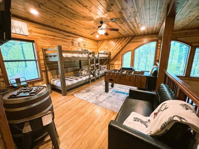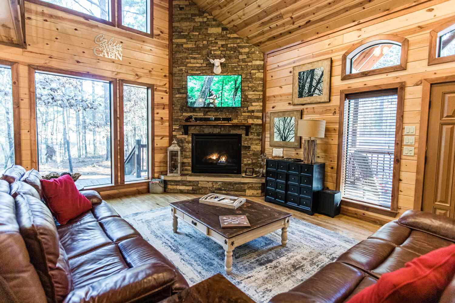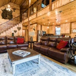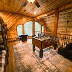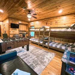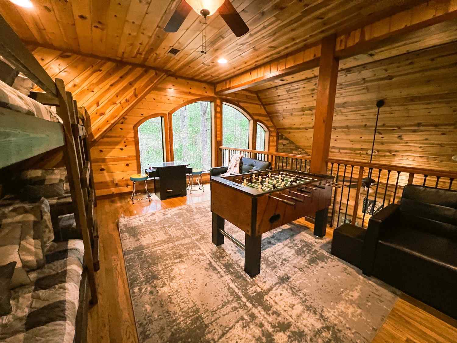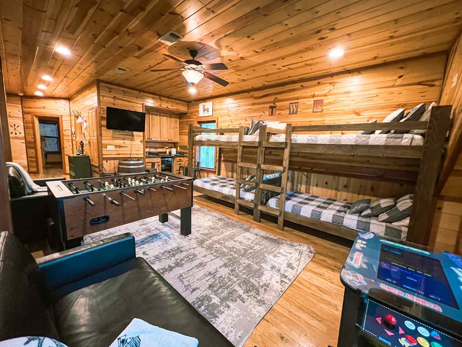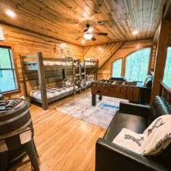 Enjoy the fresh air while nestled among towering, lush pines, and take in the sights of the wildlife around you. Backing up to the Hochatown area, there are plenty of outdoor activities to take part in and amenities like grocery stores, restaurants, and more to enjoy. The cabin has three king bedrooms, two twin bunks, and a twin sofa chair in the loft to fit five guests comfortably, with an additional twin sofa chair in the living area and two full-sized air beds. Embrace a proper break from reality, and come camp with us!
