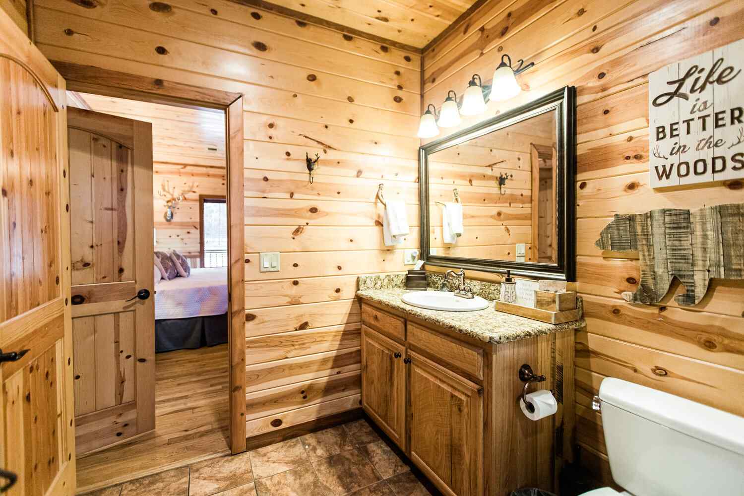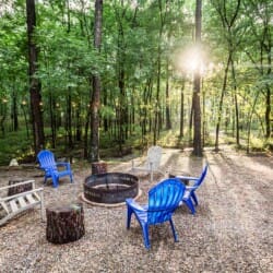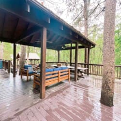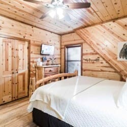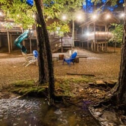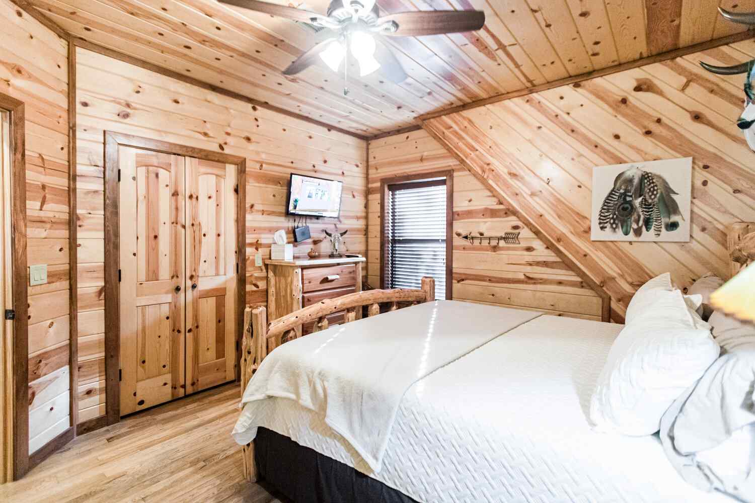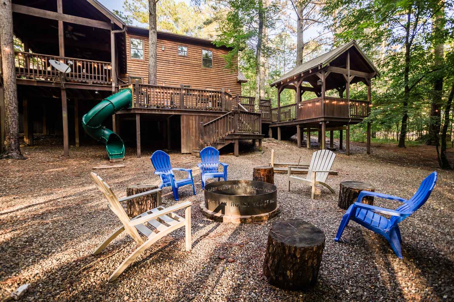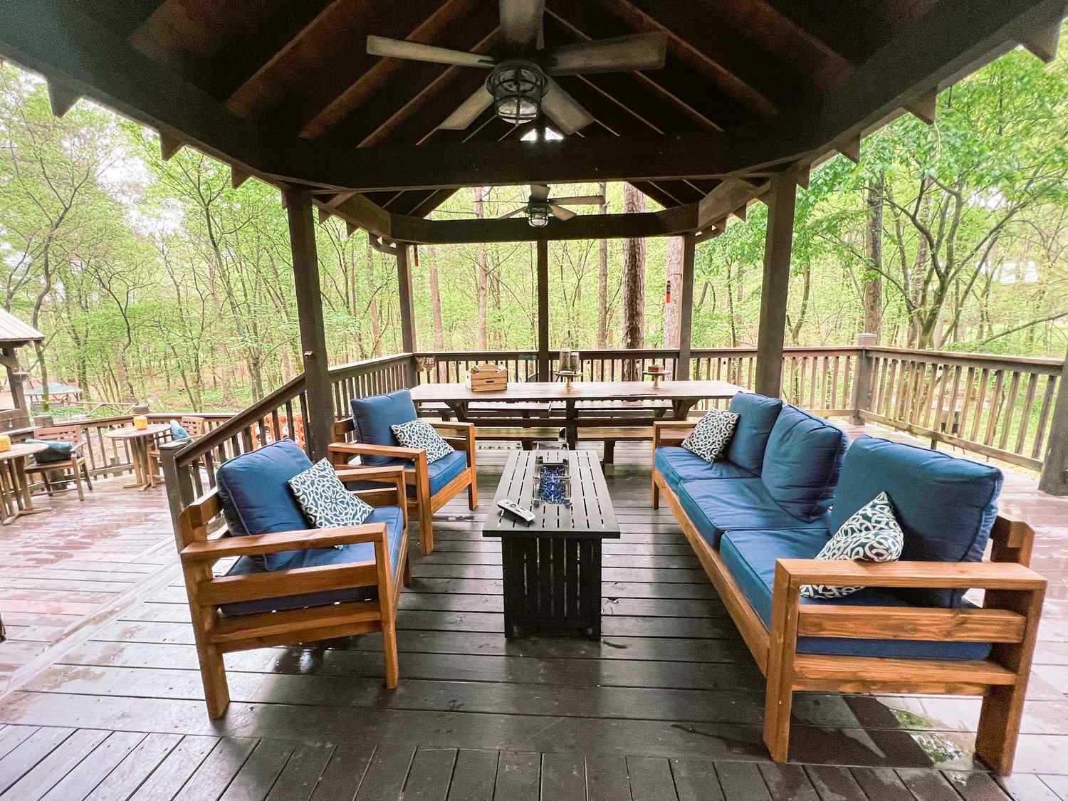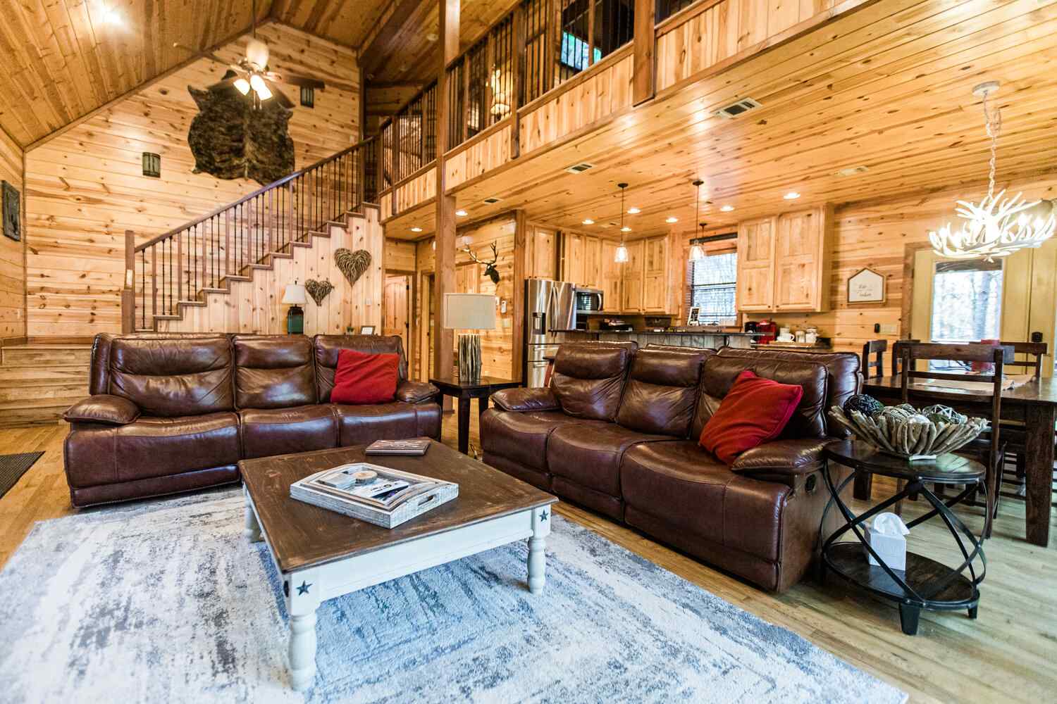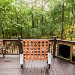 Enjoy the fresh air while nestled among towering, lush pines, and take in the sights of the wildlife around you. Backing up to the Hochatown area, there are plenty of outdoor activities to take part in and amenities like grocery stores, restaurants, and more to enjoy. The cabin has three king bedrooms, two twin bunks, and a twin sofa chair in the loft to fit five guests comfortably, with an additional twin sofa chair in the living area and two full-sized air beds. Embrace a proper break from reality, and come camp with us!