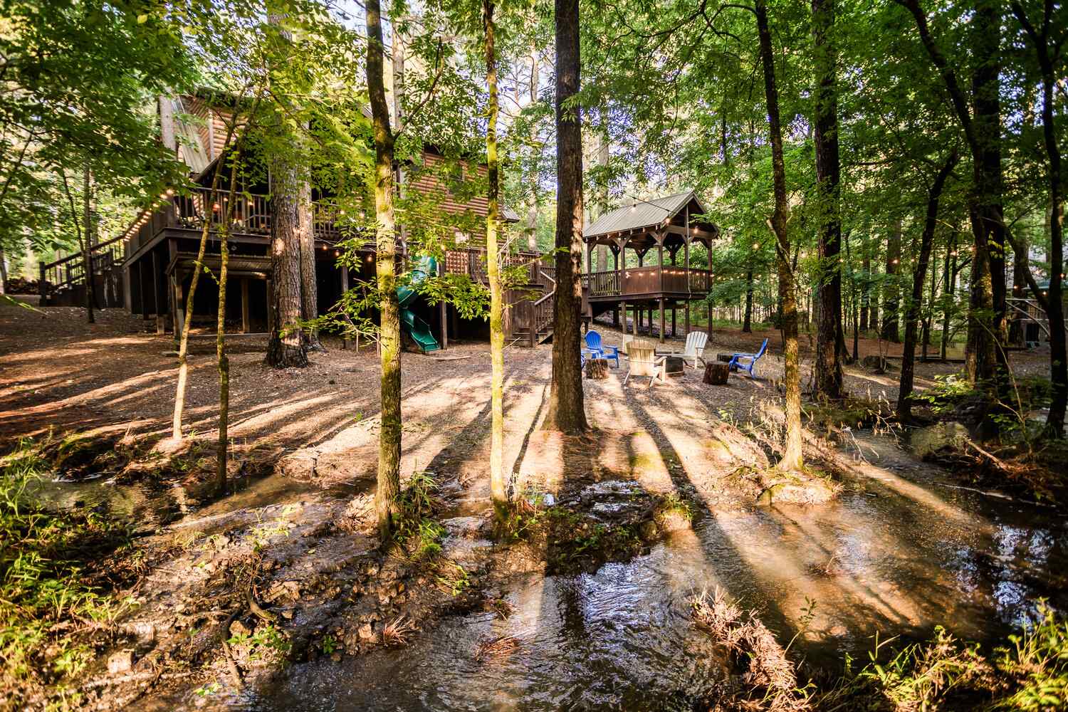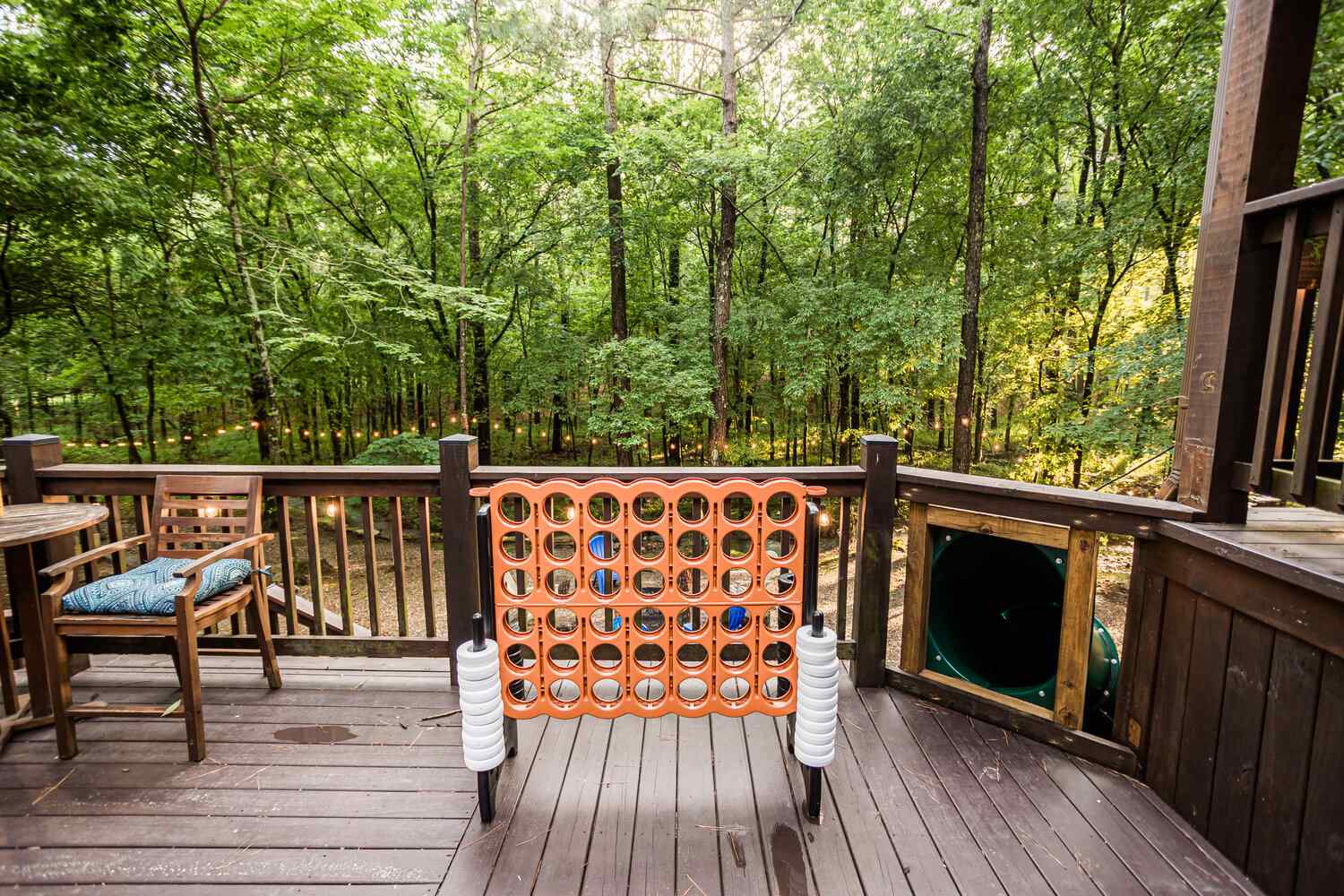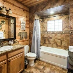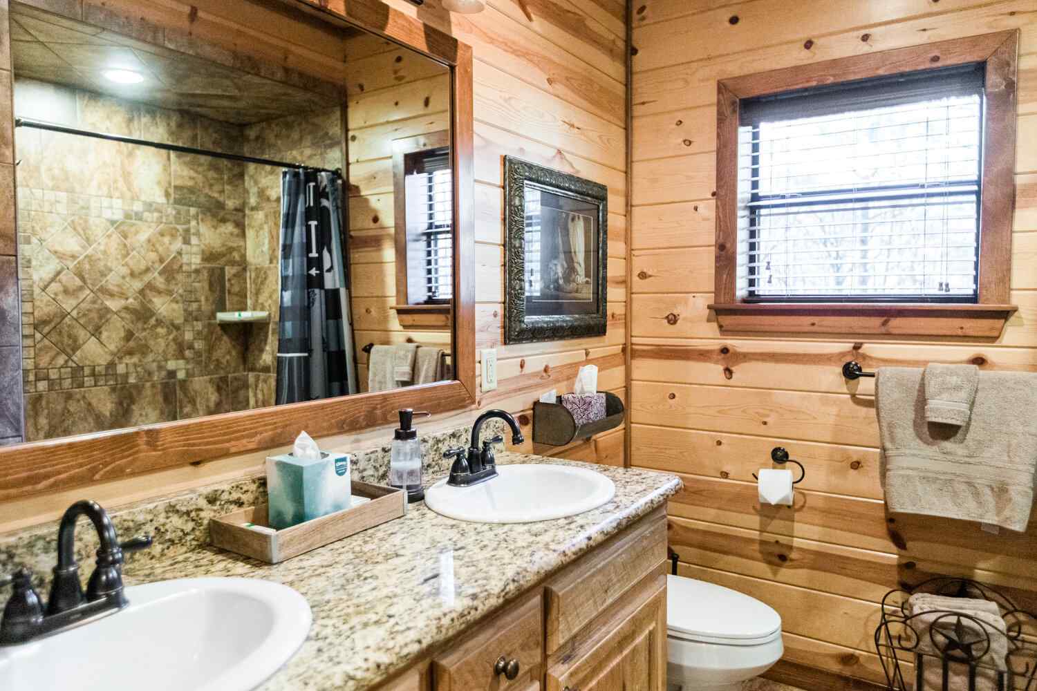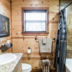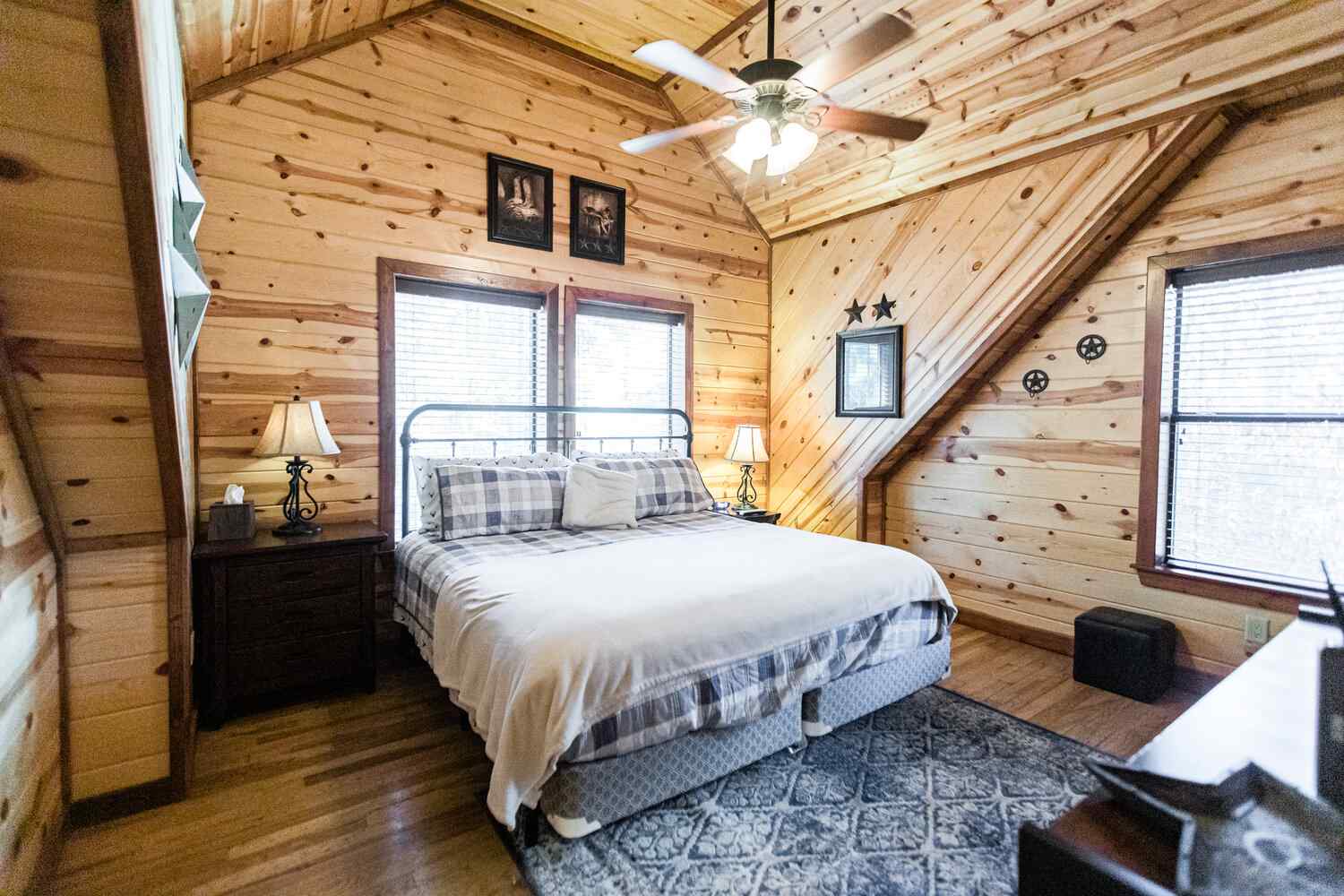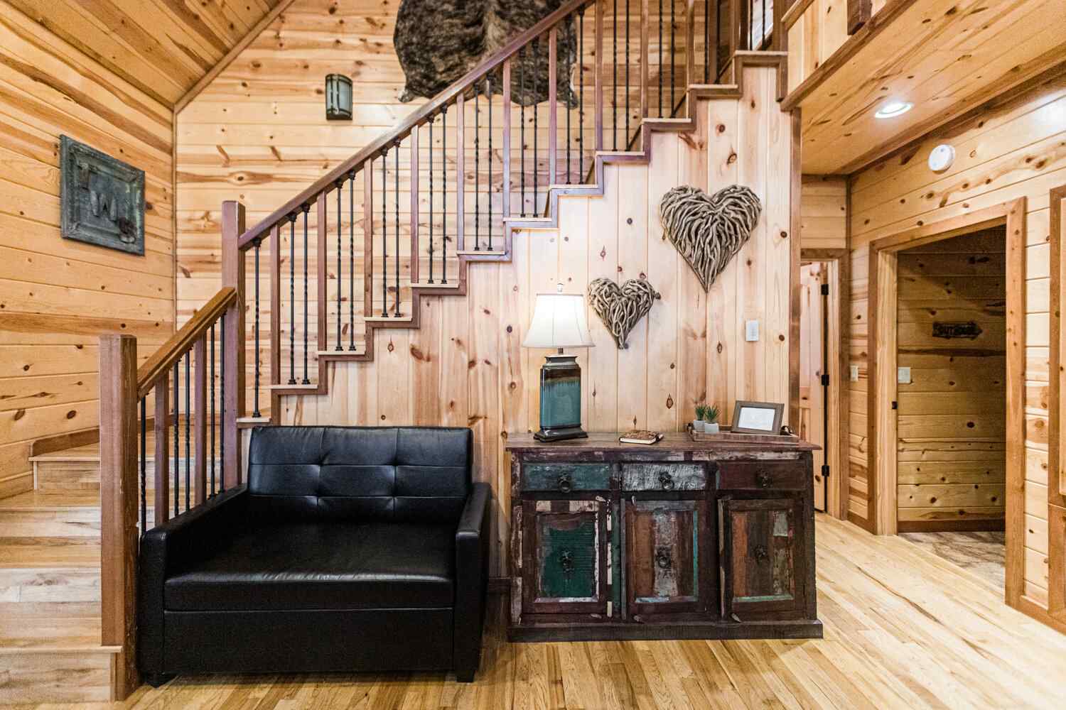 Enjoy the fresh air while nestled among towering, lush pines, and take in the sights of the wildlife around you. Backing up to the Hochatown area, there are plenty of outdoor activities to take part in and amenities like grocery stores, restaurants, and more to enjoy. The cabin has three king bedrooms, two twin bunks, and a twin sofa chair in the loft to fit five guests comfortably, with an additional twin sofa chair in the living area and two full-sized air beds. Embrace a proper break from reality, and come camp with us!