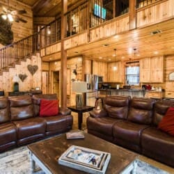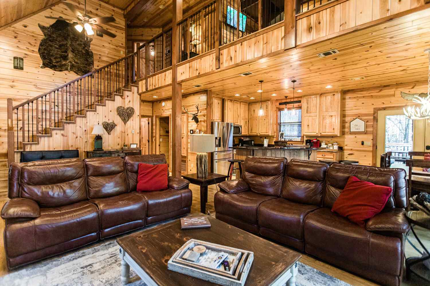 Take a break, climb the stairs, and explore the newly renovated loft featuring visible beams, an array of foam-filled furniture, a wet bar with a wine cooler, and a 50-inch TV. Be comforted by the warm glow of the two-story rock fireplace in the family room as you kick back into the two leather reclining sofas and enjoy a movie night with the 55-inch flat-screen TV. Furthermore, I want hours of fun playing classic video games using the brand-new vintage console.