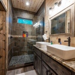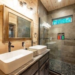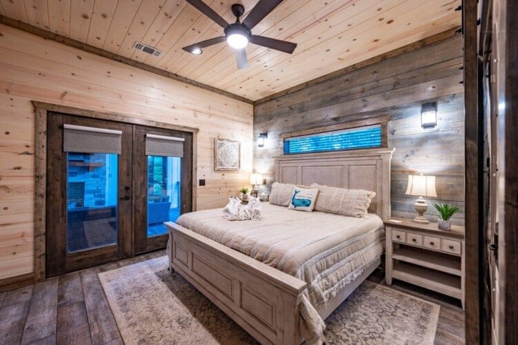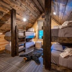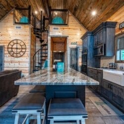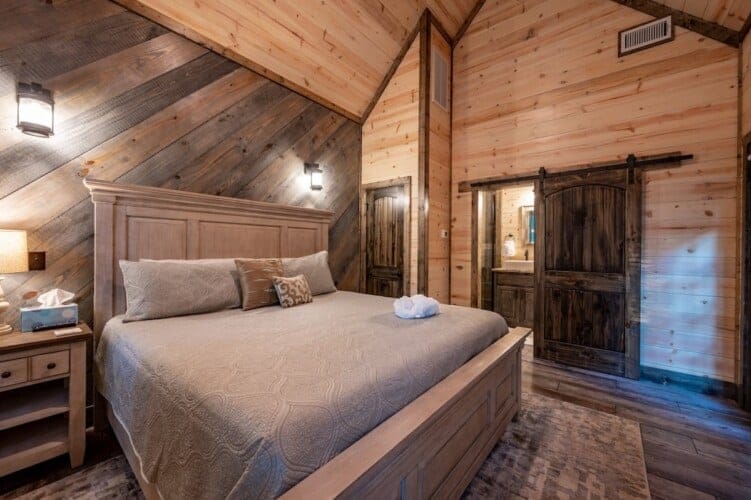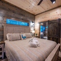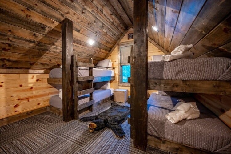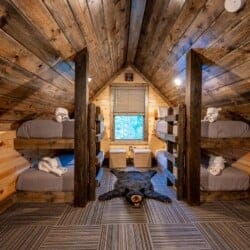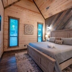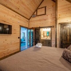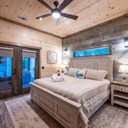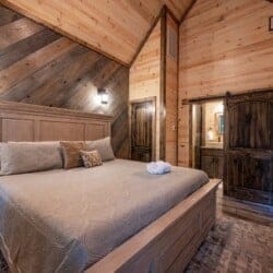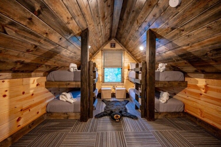 On the same side of Toasted Marshmallow, you’ll find one of the king bedrooms, complete with a private ensuite and easy access to the breezeway. Upstairs, the loft bunk room becomes a favorite for kids, offering two sets of twin-over-twin bunks, their own hangout space, and access to a nearby bathroom with a walk-in shower. It’s the perfect setup for younger guests who want a little independence while still being close to the main living area.