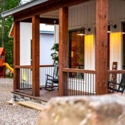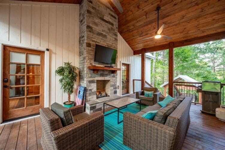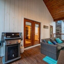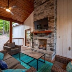 The breezeway at Toasted Marshmallow is more than just a passage—it’s a separate living space in itself. Covered and furnished with a couch, chairs, a TV, and its gas fireplace, it’s ideal for gathering at any time of day. On the other side of the breezeway, you’ll find two more king suites, each with its private entrance, ensuite bathroom, and plenty of privacy. This layout makes Toasted Marshmallow a smart choice for multiple families traveling together, offering shared spaces for connection and separate ones for quiet rest.