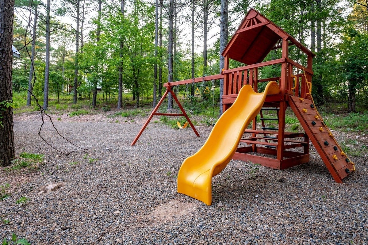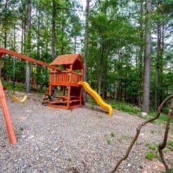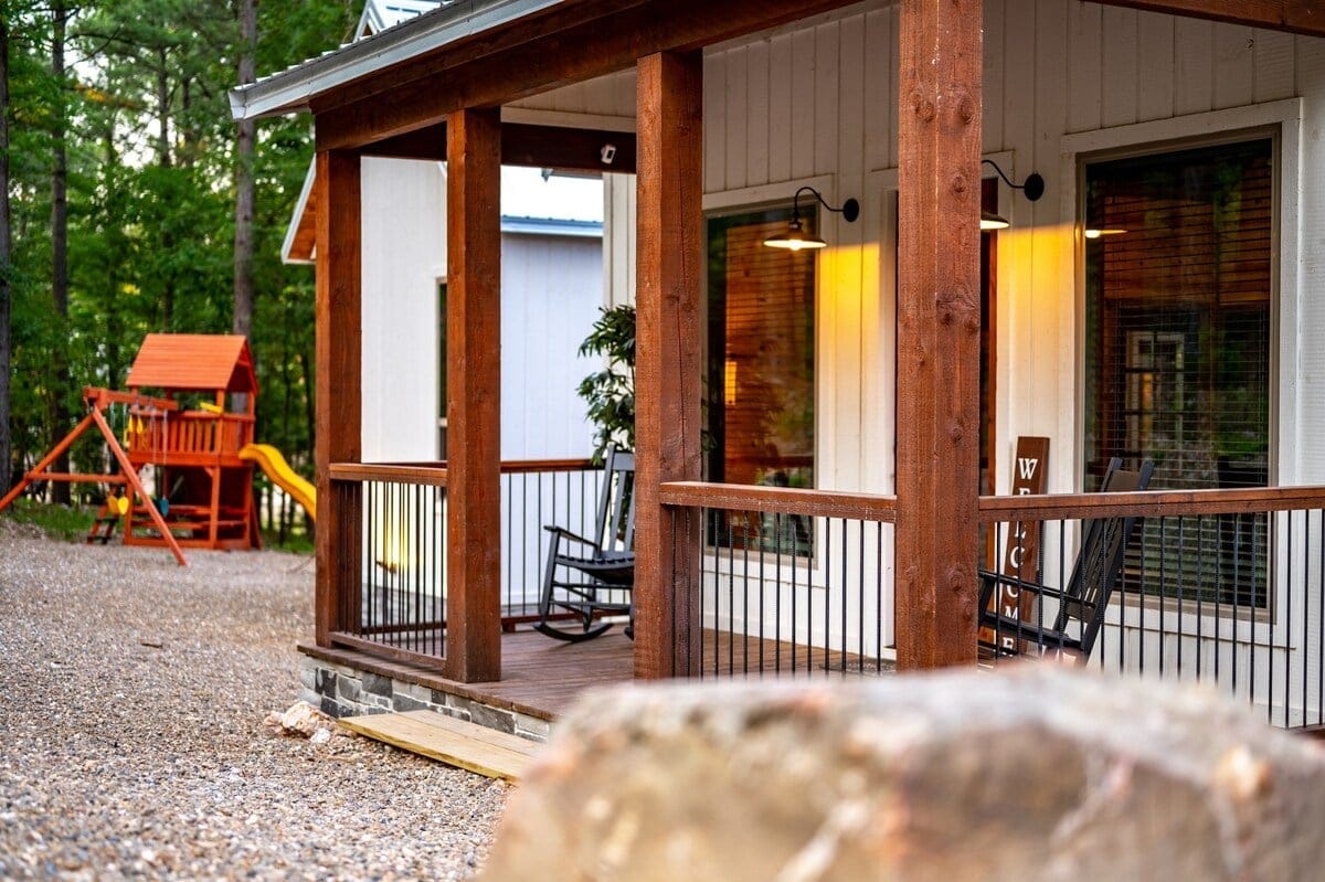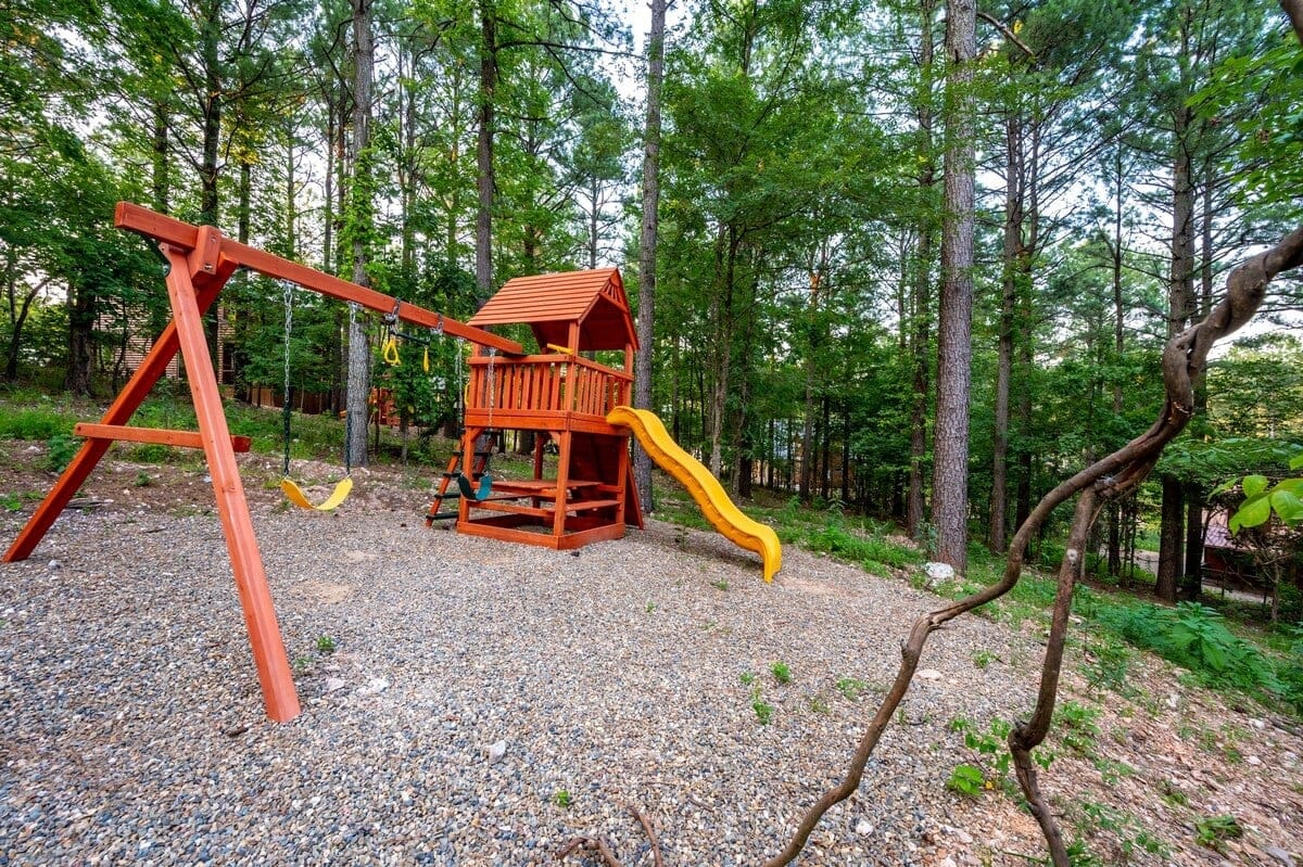 Outside, Toasted Marshmallow shines. The hot tub is tucked away for peaceful soaking under the stars. There’s a fire pit with seating for six, just waiting for marshmallows and campfire stories. A kid-friendly playset with swings, a rock climbing wall, and a picnic table adds even more fun, while rocking chairs on the front porch invite you to slow down and take in the view. Cornhole and open yard space round out the outdoor fun, ensuring everyone has something to enjoy.