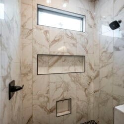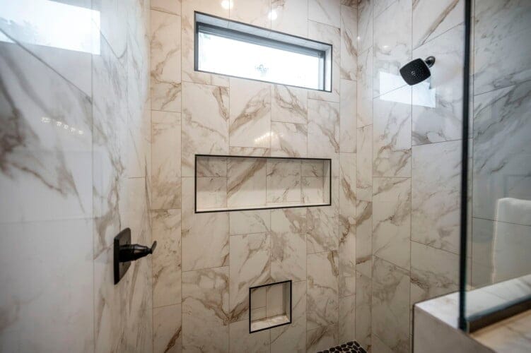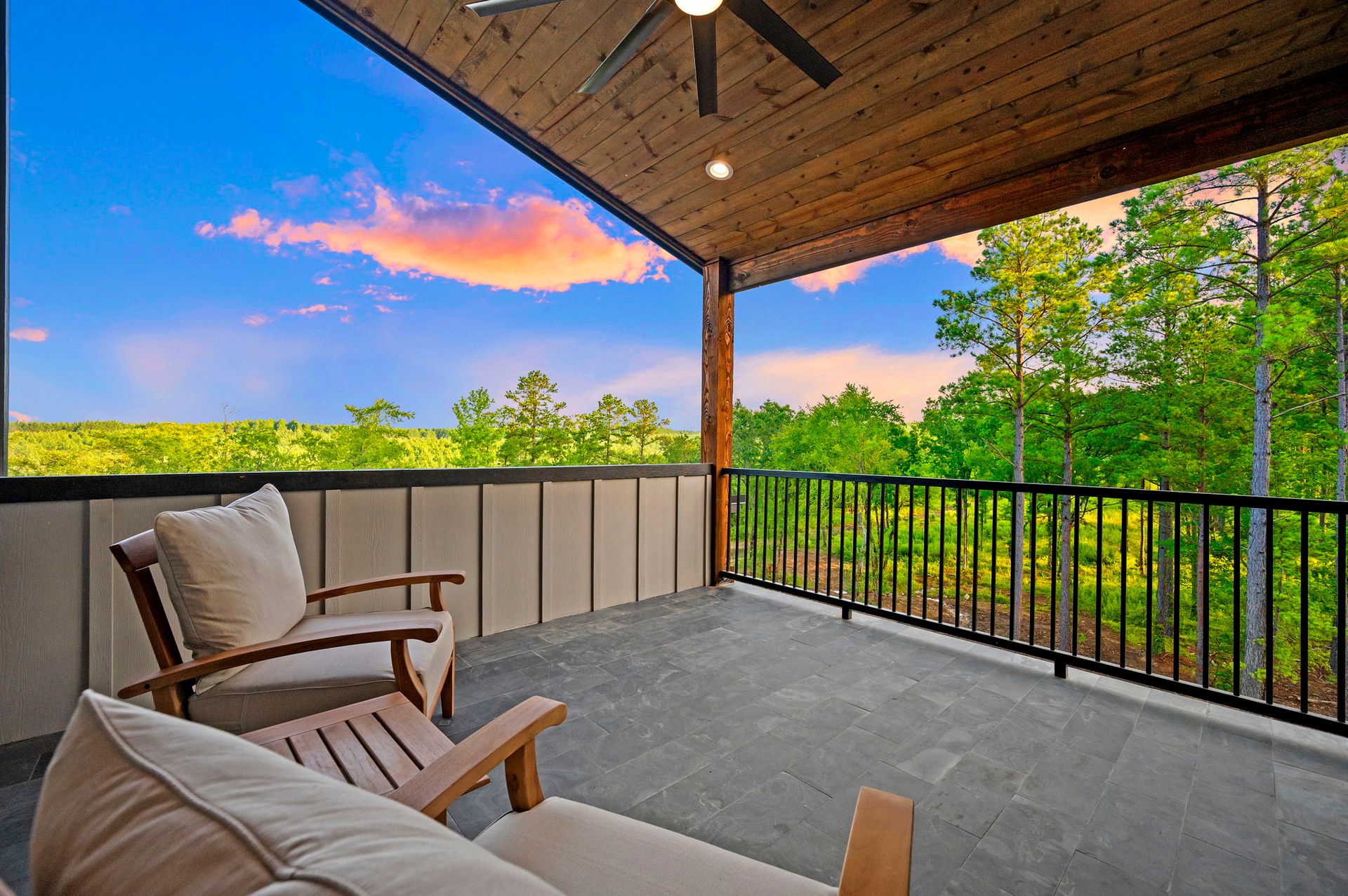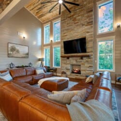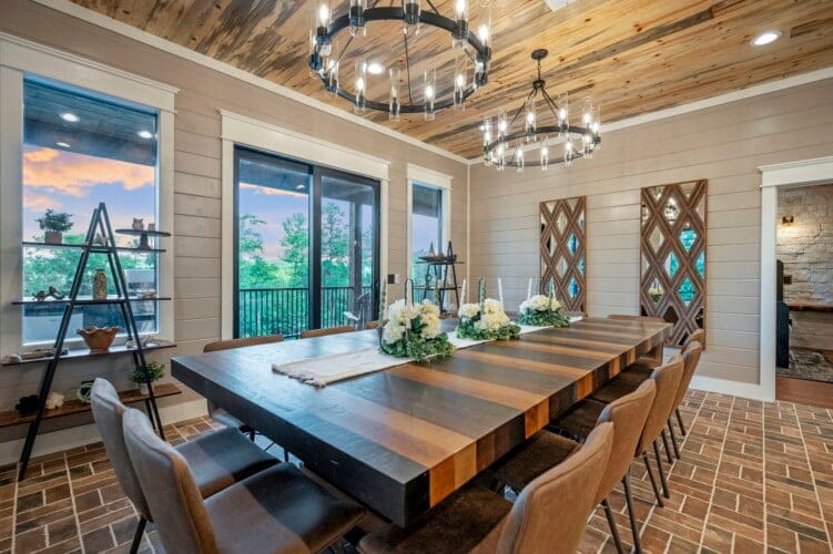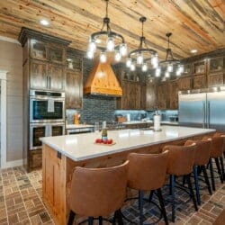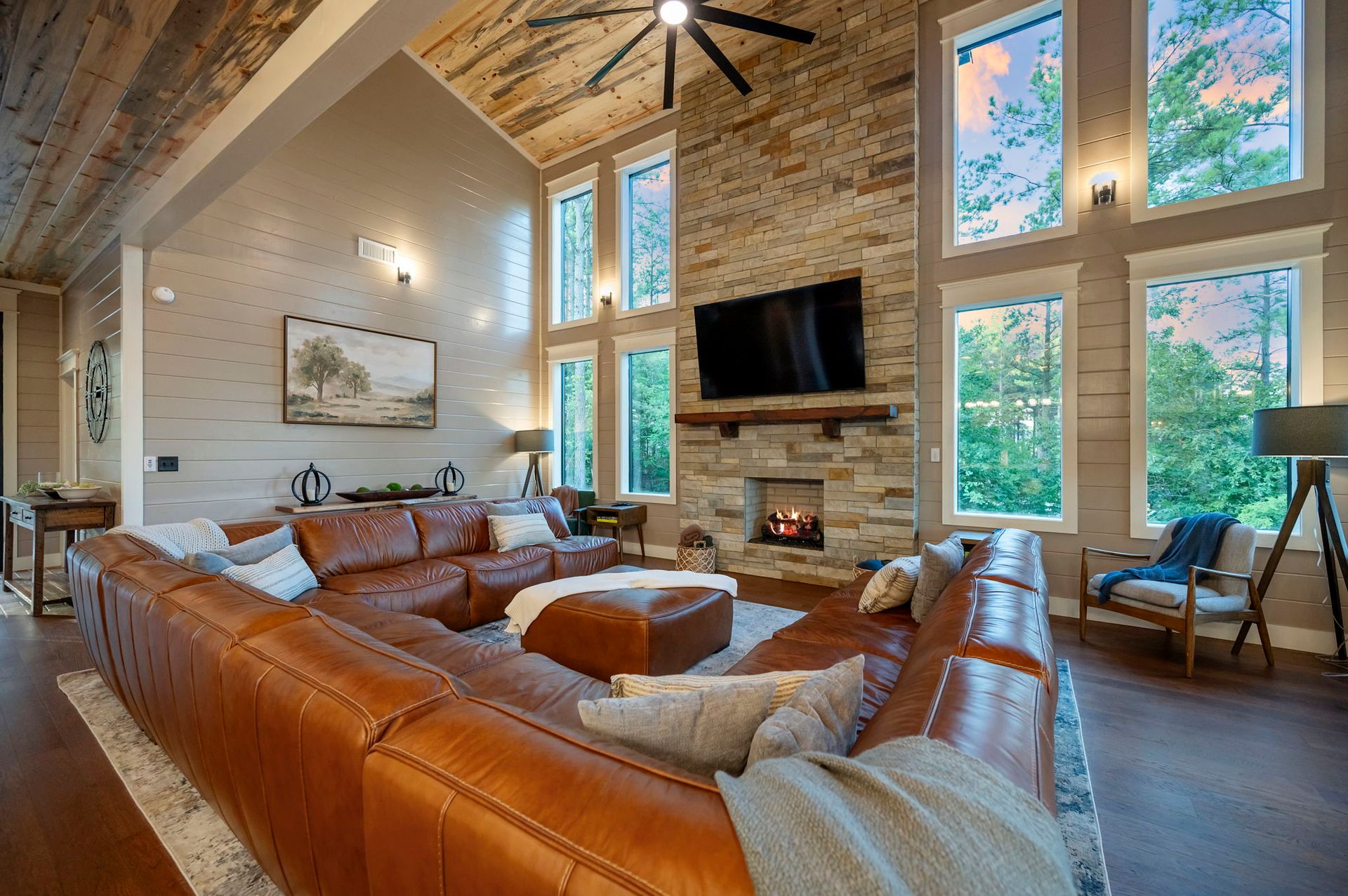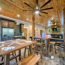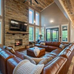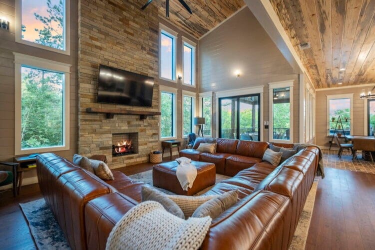 Stepping inside Whiskey Trip, the main living room sets the tone for what’s to come. An oversized leather sectional faces a sleek gas fireplace and large-screen TV, perfect for gathering after a day of hiking or boating on Broken Bow Lake. The open-concept design connects seamlessly to the kitchen and dining areas, allowing everyone to stay part of the conversation. Large windows flood the space with natural light, offering glimpses of the wooded landscape outside and reminding you that this luxury is nestled deep within the natural world.